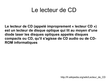 Le lecteur de CD Le lecteur de CD (appelé improprement « lecteur CD ») est un lecteur de disque optique qui lit au moyen d'une diode laser les disques optiques appelés disques compacts ou CD, qu'il s'agisse de CD audio ou de CDROM informatiques http://fr.wikipedia.org/wiki/Lecteur_de_CD Le phonographe Le premier phonographe a été créé en 1877 par Thomas Edison . http://fr.wikipedia.org/wiki/Phonographe Le phonographe au année 19201930 Dans les année 1920-1930 le lecteur de CD ressemblait à ça: L'électrophone Un tourne-disque ou électrophone est un appareil électronique destiné à restituer un enregistrement sonore réalisé sur disques microsillons. Appelé aussi pick up, il est le successeur électronique du phonographe. http://fr.wikipedia.org/wiki/%C3%89lectrophone Le lecteur CD à lentille En 1950-1960 le lecteur CD est équipée d'un déplacement de la tête. Le déplacement de la lentille est assuré par un moteur linéaire d'une très grande précision http://fr.wikipedia.org/wiki/Lecteur_de_CD Le lecteur de disque optique Le lecteur de disque optique est un appareil électronique permettant de lire des disques optiques comme les disques compacts (ou CD) et DVD. Ces disques sont lus par une diode laser, sans qu'il y ait de contact avec le lecteur. http://fr.wikipedia.org/wiki/Lecteur_de_disque_optique Le lecteur CD du futur Le lecteur CD du futur ressemblera à ça: http://www.synchro-blogue.com/synchro/2008/07/lecteur-cd-du-f.html