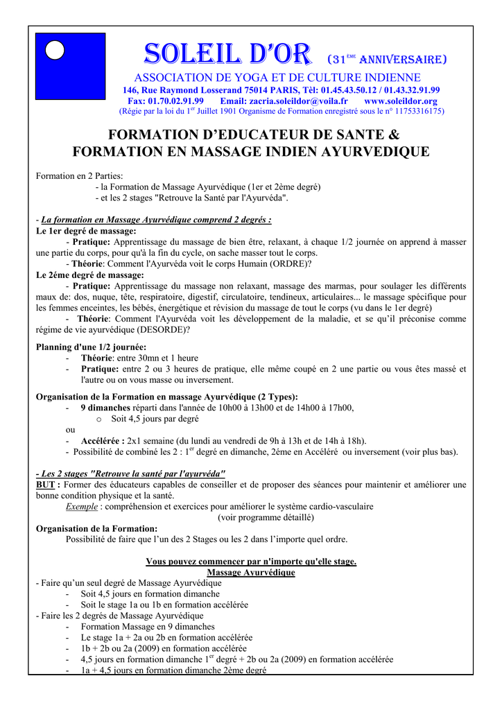 SOLEIL D’OR (31 ÈME ANNIVERSAIRE) ASSOCIATION DE YOGA ET DE CULTURE INDIENNE 146, Rue Raymond Losserand 75014 PARIS, Tèl: 01.45.43.50.12 / 01.43.32.91.99 Fax: 01.70.02.91.99 Email: [email protected] www.soleildor.org (Régie par la loi du 1er Juillet 1901 Organisme de Formation enregistré sous le n° 11753316175) FORMATION D’EDUCATEUR DE SANTE & FORMATION EN MASSAGE INDIEN AYURVEDIQUE Formation en 2 Parties: - la Formation de Massage Ayurvédique (1er et 2ème degré) - et les 2 stages "Retrouve la Santé par l'Ayurvéda". - La formation en Massage Ayurvédique comprend 2 degrés : Le 1er degré de massage: - Pratique: Apprentissage du massage de bien être, relaxant, à chaque 1/2 journée on apprend à masser une partie du corps, pour qu'à la fin du cycle, on sache masser tout le corps. - Théorie: Comment l'Ayurvéda voit le corps Humain (ORDRE)? Le 2éme degré de massage: - Pratique: Apprentissage du massage non relaxant, massage des marmas, pour soulager les différents maux de: dos, nuque, tête, respiratoire, digestif, circulatoire, tendineux, articulaires... le massage spécifique pour les femmes enceintes, les bébés, énergétique et révision du massage de tout le corps (vu dans le 1er degré) - Théorie: Comment l'Ayurvéda voit les développement de la maladie, et se qu’il préconise comme régime de vie ayurvédique (DESORDE)? Planning d'une 1/2 journée: - Théorie: entre 30mn et 1 heure - Pratique: entre 2 ou 3 heures de pratique, elle même coupé en 2 une partie ou vous êtes massé et l'autre ou on vous masse ou inversement. Organisation de la Formation en massage Ayurvédique (2 Types): - 9 dimanches réparti dans l'année de 10h00 à 13h00 et de 14h00 à 17h00, o Soit 4,5 jours par degré ou - Accélérée : 2x1 semaine (du lundi au vendredi de 9h à 13h et de 14h à 18h). - Possibilité de combiné les 2 : 1er degré en dimanche, 2éme en Accéléré ou inversement (voir plus bas). - Les 2 stages "Retrouve la santé par l'ayurvéda" BUT : Former des éducateurs capables de conseiller et de proposer des séances pour maintenir et améliorer une bonne condition physique et la santé. Exemple : compréhension et exercices pour améliorer le système cardio-vasculaire (voir programme détaillé) Organisation de la Formation: Possibilité de faire que l’un des 2 Stages ou les 2 dans l’importe quel ordre. Vous pouvez commencer par n'importe qu'elle stage. Massage Ayurvédique - Faire qu’un seul degré de Massage Ayurvédique - Soit 4,5 jours en formation dimanche - Soit le stage 1a ou 1b en formation accélérée - Faire les 2 degrés de Massage Ayurvédique - Formation Massage en 9 dimanches - Le stage 1a + 2a ou 2b en formation accélérée - 1b + 2b ou 2a (2009) en formation accélérée - 4,5 jours en formation dimanche 1er degré + 2b ou 2a (2009) en formation accélérée - 1a + 4,5 jours en formation dimanche 2ème degré SOLEIL D’OR (31 ÈME ANNIVERSAIRE) ASSOCIATION DE YOGA ET DE CULTURE INDIENNE 146, Rue Raymond Losserand 75014 PARIS, Tèl: 01.45.43.50.12 / 01.43.32.91.99 Fax: 01.70.02.91.99 Email: [email protected] www.soleildor.org (Régie par la loi du 1er Juillet 1901 Organisme de Formation enregistré sous le n° 11753316175) Educateur de Santé - Faire uniquement les 1 ou 2 stages « Retrouver la Santé par l’Ayurvédique » - Stage "Retrouve la Santé par l'Ayurvéda" octobre 2008 du 13 au 17 Octobre 2008 Stage 1a massage accéléré du 27 au 31 Octobre 2008 Stage 2a massage accéléré du 17 au 21 Novembre 2008 (Fin Formation Massage Ayurvédique) Stage " Retrouve la Santé par l'Ayurvéda" mars 2009 du 23 au 27 Mars 2009 (Fin Formation d'Educateur de Santé) - Stage " Retrouve la Santé par l'Ayurvéda" octobre 2008 du 13 au 17 Octobre 2008 Stage 1a massage accéléré du 27 au 31 Octobre 2008 Stage " Retrouve la Santé par l'Ayurvéda" mars 2009 du 23 au 27 Mars 2009 Stage 2b massage accéléré du 13 au 17 Avril 2009 (Fin Formation Massage Ayurvédique et d'Educateur de Santé) - Stage Massage en 1 an 9 dimanches commencé en Octobre 2008 jusqu'a juin 2009 Stage "Retrouve la Santé par l'Ayurvéda" octobre 2008 du 13 au 17 Octobre 2008 Stage " Retrouve la Santé par l'Ayurvéda" mars 2009 du 23 au 27 Mars 2009 (Fin Formation Massage Ayurvédique et d'Educateur de Santé) Comme vous pouvez le constate toutes les combinaisons sont possibles. - Matériels: - papiers ou cahiers, stylos pour prendre des notes - une serviette ou un drap pour vous allongez lorsque vous êtes massé - Une autre serviette pour vous couvrir les parties non masser lorsque vous êtes massé. - vêtements amples (types jogging,...) pour la pratique. - Inscriptions : - Un chèque de 20 € d’adhésion à l’Association Soleil d’Or (saison 2008-2009). - Un chèque de 100 € d’arrhes par stage que vous désirez faire. - E1+1a+E2+2b = soit 5 chèques de 20 € + 4 chèques de 100 € - 1a + 2b = soit 3 chèques de 20 € + 2 chèques de 100 € - 9 Dimanches = soit 2 chèques de 20 € + 1 chèques de 100 € Vous trouverez le programme détaillé dans les pages suivantes. Pour plus de renseignement et pour vous inscrire, n’hésitez pas à nous contacter Cordialement Amir du Soleil d'Or Responsable de Formation 06.26.46.38.55 SOLEIL D’OR (31 ÈME ANNIVERSAIRE) ASSOCIATION DE YOGA ET DE CULTURE INDIENNE 146, Rue Raymond Losserand 75014 PARIS, Tèl: 01.45.43.50.12 / 01.43.32.91.99 Fax: 01.70.02.91.99 Email: [email protected] www.soleildor.org (Régie par la loi du 1er Juillet 1901 Organisme de Formation enregistré sous le n° 11753316175) FORMATION EN MASSAGE INDIEN AYURVEDIQUE EN 1 AN PROGRAMME 2008-2009 9 dimanches de 10h00 à 13h00 et de 14h00 à 17h00 OCTOBRE Dimanche 12 10h00-11h00 11h00-13h00 14h00-15h00 15h00-17h00 - La philosophie de l’Ayurveda. - Massage relaxant du dos. - Les cinq éléments et l’homme selon Ayurveda. - Massage relaxant de la tête et du cou. OCTOBRE Dimanche 26 10h00-11h00 11h00-13h00 14h00-15h00 15h00-17h00 - La constit