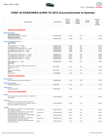 A.R.S. - A.R.S. - A.R.S. TARIF ACCESSOIRES AURIS TS 2015 (Conventionnelle et Hybride) DESIGNATION REFERENCE Tarif TTC client indicatif conseillé Temps barèmé indicatif conseillé *Temps peinture Tarif TTC client indicatif posé conseillé DESIGN EXTERIEUR Eléments chromés Ornement de hayon Ornement inférieur de hayon en chrome PZ49UE9493ZB 101.96 0.20 118.52 PZ49UE9491ZB 203.96 0.50 245.36 PZ49PE0672ZS PZ49PE0673ZQ PZ406E067EZS PW45702000MB PZ406E067EZG 185.82 176.95 196.85 196.86 185.96 0.30 0.30 0.30 0.30 0.30 210.66 201.79 221.69 221.70 210.80 PZ406E067FZS PZ406E067GZS PZ406E067GZG PZ406E067FZG 263.22 263.22 252.17 160.24 0.30 0.30 0.30 0.30 288.06 288.06 277.01 185.08 PZ49PE0670ZQ 154.84 0.30 179.68 4261102B90 98.41 0.30 123.25 4261102E70 141.11 0.30 165.95 PZ4139968300 47.57 0.20 64.13 PZ438E218200 91.34 0.20 107.90 0852712820 195.01 1.60 327.49 PW03100000 38.47 - 38.47 ATPACCDESIGN 301.04 0.70 359.00 ATPACCPROTEC 142.06 1.05 229.00 Conventionnel ATPAATFX13BC 450.92 3.60 749.00 Conventionnel ATPAATDE13BC 640.92 3.60 939.00 Hybride ATPAATDE13BH 607.16 2.80 839.00 Conventionnel ATPAATDET7BC 609.20 3.50 899.00 Hybride ATPAATFX13BH 417.16 2.80 649.00 Ornements Latéraux Ornements latéraux chromés Jantes & Enjoliveurs & Ecrous Jante Alliage 16'' Jante Alliage Orion, 16" - A l'unité Jante Alliage Athena, 16" - A l'unité Jante Alliage Podium Antracite Poli, 16" - A l'unité Jante Alliage Nouveau Design, 16" - A l'unité Jante Alliage Podium Antracite, 16" - A l'unité 17'' Jante Alliage Podium Antracite Poli, 17" - A l'unité Jante Alliage Pitlane Antracite Poli, 17" - A l'unité Jante Alliage Pitlane Antracite, 17" - A l'unité Jante Alliage Podium Antracite, 17" - A l'unité 15'' Jante Alliage Mara, 15" - A l'unité Jante Tôle 15" Jante Tôle hiver 15" Noire Incompatible avec les véhicules d'origine en 17" et 16" 16'' Jante Tôle hiver 16" Noire Ecrous Ecrous anti-vol DESIGN INTERIEUR Seuil de Porte Jeu de seuils de portes avants aspect Aluminium Eclairage d'ambiance Eclairage d'intérieur bleuté Coque de clé Coque de clé hybride PACK ACCESSOIRES Design Pack Design Ornements latéraux chromés + Ornement de hayon chromé Protection Pack Protection Jeu de seuils de portes avants aspect Aluminium + Film de protection de seuil de coffre + Film de protection des poignées de portes avant Attelage Pack Attelage Fixe 13 Broches - Conventionnel Attelage fixe + Faisceau 13 broches Pack Attelage Détachable 13 Broches - Conventionnel Attelage détachable + Faisceau 13 broches Pack Attelage Détachable 13 Broches - Hybride Attelage détachable + Faisceau 13 broches Pack Attelage Détachable 7 Broches - Conventionnel Attelage détachable + Faisceau 7 broches Pack Attelage Fixe 13 Broches - Hybride Attelage fixe + Faisceau 13 broches *Les prix TTC indicatifs conseillés n'incluent pas les coûts de peinture Le 14/10/2015 09h33 Page 1 A.R.S. - A.R.S. - A.R.S. TARIF ACCESSOIRES AURIS TS 2015 (Conventionnelle et Hybride) DESIGNATION Pack Attelage Fixe 7 Broches - Conventionnel Attelage fixe + Faisceau 7 broches REFERENCE Conventionnel Tarif TTC client indicatif conseillé Temps barèmé indicatif conseillé *Temps peinture Tarif TTC client indicatif posé conseillé ATPAATFIX7BC 419.20 3.50 709.00 ATPACVOY460N 839.00 - 839.00 ATPACCVOY410 619.00 - 619.00 ATPACCVOY420 659.00 - 659.00 ATPACVOY460G 839.00 - 839.00 Compatible avec la finition ATPACCLIVRTC 149.00 - 149.00 Tendance uniquement Compatible avec les finitions - ATPACCLIVRDC 149.00 - 149.00 Dynamic et au-dessus Conventionnel - Compatible Compatible avec la finition ATPACCLIVRTH 189.00 - 189.00 ATPACCLIVRDH 189.00 - 189.00 -Dynamic Compatible et au-dessus avec la finition - Hybride au-dessus Compatible avec les finitions ATPABUSINEDC 99.00 - 99.00 - Compatible Tendance uniquement avec les finitions Dynamic et au-dessus Compatible avec la finition ATPABUSINETH 139.00 - 139.00 Conventionnel - Compatible Dynamic et au-dessus Tendance uniquement Compatible avec les finitions - Hybride ATPABUSINEDH 139.00 - 139.00 ATPABUSINETC 99.00 - 99.00 Dynamic et au-dessus avec la finition Tendance PZ4620020103 50.27 - 50.27 uniquement PZ4620020801 9.05 - 9.05 PZ4620020900 128.60 - 128.60 PZ4620020800 150.71 - 150.71 PZ4620020700 562.52 - 562.52 PZ4620020200 190.86 4.30 546.90 Voyage Pack Voyage Ski Noir 460L / 75Kg Barres de toit + Coffre de ski Noir 460L / 75Kg Pack Voyage 410L / 50Kg Barres de toit + Coffre de toit 410L / 50Kg Pack Voyage Ski Argent 420L / 50Kg Barres de toit + Coffre de ski 420L / 50Kg Pack Voyage Ski Gris 460L / 75Kg Barres de toit + Coffre de ski Gris 460L / 75Kg Livraison Pack Livraison - Conventionnel (Tendance) Tapis de sol textile 830g/m² + Kit de sécurité complet + Bac de coffre Compatible avec la finition Tendance uniquement Pack Livraison - Conventionnel (Dynamic et +) Tapis de sol textile 830g/m² + Kit de sécurité complet + Bac de coffre Compatible avec les finitions Dynamic et au-dessus Pack Livraison - Hybride (Tendance) Tapis de sol textile 830g/m² + Kit de sécurité complet + Bac de coffre + Coque de clé hybride - Compatible avec la finition Tendance uniquement Pack Livraison - Hybride (Dynamic et +) Tapis de sol textile 830g/m² + Kit de sécurité complet + Bac de coffre + Coque de clé hybride - Compatible avec les finitions Dynamic et au-dessus Business Pack Business - Conventionnel (Dynamic et +) Tapis de sol textile 650g/m² + Kit de sécurité complet + Bac de coffre Compatible avec les finitions Dynamic et au-dessus Pack Business - Hybride (Tendance) Tapis de sol textile 650g/m² + Kit de sécurité complet + Bac de coffre + Coque de clé hybride - Compatible avec la finition Tendance uniquement Pack Business - Hybride (Dynamic et +) Tapis de sol textile 650g/m² + Kit de sécurité complet + Bac de coffre + Coque de clé hybride - Compatible avec les finitions Dynamic et au-dessus Pack Business - Conventionnel (Tendance) Tapis de sol textile 650g/m² + Kit de sécurité complet + Bac de coffre Com