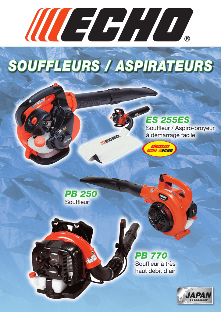 SOUfFLEURS / Aspirateurs ES 255ES Souffleur / Aspiro-broyeur à démarrage facile PB 250 Souffleur PB 770 Souffleur à très haut débit d’air LES SOUFFLEURS PB 250 Grand confort anti-gyroscopique SOUFFLEUR 25,4 cm3 - 4,0 kg - 65 m/s - 700 m3/h - 87 dB(A) Tube de soufflage décentré pour un effet « Anti-Gyroscopique » Parfaite ergonomie pour le bras et le poignet de l’utilisateur Nouveau système EZ-LOCK pour montage/démontage rapide du tube de soufflage Système POSI-LOC pour un verrouillage facile et efficace par simple rotation des tuyaux. Option : kit de nettoyage de gouttières N° 99944100025. PB 251 Système EZ-LOCK de verrouillage-déverrouillage rapide du tuyau sur le carter de turbine. LÉGER, PRATIQUE ET SILENCIEUX 25,4 cm3 - 4,1 kg - 71 m/s - 730 m3/h - 87 dB(A) Ce nouveau souffleur est un des plus légers de la gamme ; il s’avère extrêmement silencieux et maniable. Grâce au nouveau système d’attache très fiable du tuyau de soufflage, le démontage est rendu possible en quelques secondes, sans outil avec une simple pièce de monnaie et par une légère rotation. Idéal pour le transport et le stockage. Option : kit de nettoyage de gouttières n°99944100025 PB 255ES Nouveau système d’attache du tuyau. SOUFFLEUR-ASPIRATEUR 25,4 cm3 - 4,4 kg - 71 m/s - 710 m3/h - 89 dB(A) Nouveau souffleur à démarrage facile ES ECHO. Nouveau système d’attache très fiable du tuyau de soufflage : démontage en quelques secondes, sans outil avec une simple pièce de monnaie et par une légère rotation. Idéal pour le transport et le stockage. Option : kit aspirateur N° PBAV255. kit de nettoyage de gouttières n°99944100025 Capacité du sac : 65 litres. En option : le PBAV255 Kit aspirateur pour PB 255ES Nouveau système d’attache du tuyau. LES SOUFFLEURS ASPIRO-BROYEURS ES 250ES ES 250ES SOUFFLEUR - ASPIRO-BROYEUR Grand confort anti-gyroscopique 25,4 cm3 - 4,2 kg - 65 m/s - 700 m3/h - 93 dB(A) KIT ASPIRATEUR INCLUS Tube de soufflage décentré pour un effet «Anti-Gyroscopique». Parfaite ergonomie pour le bas et le poignet de l’utilisateur. Nouveau système EZ-LOCK pour montage/démontage rapide du tube de soufflage. Système POSI-LOC pour un verrouillage facile et efficace par simple rotation des tuyaux. Option : kit de nettoyage de gouttières N° 99944100025. ES 250ES montré ici en version aspirateur-broyeur Réduction du volume de 12 à 1 des feuilles et débris par couteaux asymétriques. ES 250ES en version souffleur. ES 255ES SOUFFLEUR - ASPIRO - BROYEUR 25,4 cm3 - 4,4 kg - 71 m/s - 710 m3/h - 89 dB(A) KIT ASPIRATEUR INCLUS ES 255ES en version souffleur, kit aspirateur inclus Nouveau souffleur aspirobroyeur à démarrage facile ES ECHO. Nouveau système d’attache très fiable du tuyau de soufflage : démontage en quelques secondes, sans outil avec une simple pièce de monnaie et par une légère rotation. Idéal pour le transport et le stockage. Option : kit de nettoyage de gouttières n°99944100025 ES 255ES en version aspirateur. Capacité du sac pour les feuilles et brindilles : 65 litres. Réduction du volume de 12 à 1 des feuilles et débris par couteaux asymétriques. Nouveau système d’attache du tuyau. LES SOUFFLEURSPB 265ESLT NIVEAU SONORE RÉDUIT 25,4 cm3 - 5,2 kg - 59 m/s - 710 m3/h - 88 dB(A) Le PB 265ESL ECHO a un niveau sonore très faible et profite en plus du démarrage facile ES SYSTEM ECHO qui réduit l’effort de traction sur la corde du lanceur. Option : kit de nettoyage de gouttières n°99944100025 PB 500 LE SOUFFLEUR PROPRE 50,8 cm3 - 9,3 kg - 72 m/s - 1014 m3/h - 93,7 dB(A) Bénéficie d’un moteur 2 temps à balayage stratifié des gaz d’échappement, qui réduit sensiblement les émissions gazeuses et la consommation de carburant. Niveau sonore réduit. Options : kit nettoyage de gouttières N° 99944100025 et kit aspirateur PBAV4600 Le bouton marche-arrêt et le levier de contrôle des gaz (gâchette) sont intégrés à la poignée ergonomique. Celle-ci, ajustable dans tous les sens, permet à l’utilisateur un réglage «sur-mesure». Poignée main droite type PB 500, PB 625 et PB 770 BALAYEURS À DOS PB 625 LA RÉFÉRENCE PRO 58,2 cm3 - 9,5 kg - 85 m/s - 1080 m3/h - 104 dB(A) Système anti-vibration. Cadre de portage en L fiable et confortable. Grille de protection anti-intrusion d’objet pour une propreté et un flux d’air optimaux. Options : kit nettoyage de gouttières N° 99944100025 et kit aspirateur PBAV4600 PB 770 SOUFFLEUR A TRÈS HAUT RENDEMENT 63,3 cm3 - 9,8 kg - 91 m/s - 1400 m3/h - 97,7 dB(A) Vitesse et Débit d’air exceptionnels. Encore plus confortable grâce au nouveau dossier et au nouveau harnais. Système POSI-LOC pour un montage sûr et un démontage facile des tuyaux. Très bon refroidissement moteur par une circulation d’air frais et grille de protection anti-débris derrière le dossier. Commandes main droite ergonomiques et ajustables. Filtre à air à 2 étages largement dimensionné et accessible. Excellent système anti-vibration. Confort acoustique grâce à la turbine exclusive radiale fermée. PB 760LN PUISSANCE ET SILENCE 63,3 cm3 - 11,9 kg - 87,2 m/s - 1310 m3/h - 91,2 dB(A) Souffleur à dos ultra silencieux et ultra puissant. Confort d’utilisation optimisé grâce à un système anti-vibratoire très performant, une prise d’air intégrée au dossier et le système POSI-LOC permettant un montage sûr et facile des tuyaux. Machine également munie d’un filtre à air à 2 étages pour une plus grande fiabilité et une durée de vie prolongée. Système anti-vibratoire par silent-bloc à ressort La prise d’air intégrée au dossier rafraîchit l’utilisateur par temps chaud Système Posi-Loc pour un montage sûr et facile des tuyaux Filtre à air professionnel à 2 étages, pour une plus grande fiabilité LES ACCESSOIRES Accessoires pour souffleurs echo Modèles KIT NETTOYAGE DE GOUTTIÈRES N°99944120025 KIT ASPIRATEUR N° PBAV255 KIT ASPIRATEUR N° PBAV4600 PB 250 PB 251 P