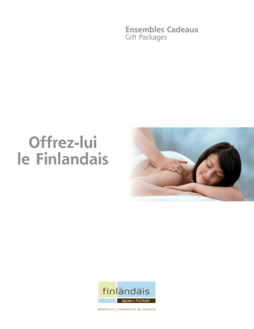 Ensembles Cadeaux Gift Packages Offrez-lui le Finlandais Ensembles Cadeaux Gift Packages Accès aux bains* 39 $ One access to baths* Accès aux bains en DUO* 78 $ Two accesses to baths* ••1 bouteille d’eau ••1 peignoir et 1 serviette (location) ••2 bouteilles d’eau ••2 peignoirs et 2 serviettes (location) ••1 bottle of water ••1 bathrobe and 1 towel (rental) ••2 bottles of water ••2 bathrobes and 2 towels (rental) * Valide du lundi au jeudi de 8h30 à 10h et 18h à 23h excepté jours fériés * Valide du lundi au jeudi de 8h30 à 10h et 18h à 23h excepté jours fériés *V alid Monday to Thursday 8:30 a.m. to 10 a.m. and 6 to 11 p.m. except holidays Accès aux bains 54 $ One access to baths * Valid Monday to Thursday 8:30 a.m. to 10 a.m. and 6 to 11 p.m. except holidays Accès aux bains en DUO Two accesses to baths ••2 bouteilles d’eau ••2 peignoirs et 2 serviettes (location) ••1 bouteille d’eau ••1 peignoir et 1 serviette (location) ••1 bottle of water ••1 bathrobe and 1 towel (rental) ••2 bottles of water ••2 bathrobes and 2 towels (rental) Valide en tout temps Valid at all times Valide en tout temps Valid at all times Massage suédois détente Relaxing Swedish massage 108 $ 130 $ ••1 massage 60 minutes ••1 accès aux bains ••1 bouteille d’eau ••1 peignoir et 1 serviette (location) ••15 $ au Bistro Lounge ••One 60-minute massage ••1 access to baths ••1 bottle of water ••1 bathrobe and 1 towel (rental) ••$15 coupon at the Bistro Lounge Massage suédois détente en DUO Relaxing Swedish massage DUO 260 $ ••2 massages 60 minutes DUO ••2 accès aux bains ••2 bouteilles d’eau ••2 peignoirs et 2 serviettes (location) ••30 $ au Bistro Lounge ••Two 60-minute massage DUO ••2 accesses to baths ••2 bottles of water ••2 bathrobes and 2 towels (rental) ••$30 coupon at the Bistro Lounge Bonifiez votre Ensemble Cadeau Add value to your Gift Set Bistro Lounge 15 $ Bistro Lounge ••Bonifier votre Ensemble Cadeau en y ajoutant un montant de 15 $ pour le bistro ••Bonifier votre Ensemble Cadeau en y ajoutant un montant de 30 $ pour le bistro ••Add value to your Gift Set by adding $15 for the Bistro ••Add value to your Gift Set by adding $30 for the Bistro 30 $ Promotion offerte sur achat de certificat cadeau SEULEMENT. Taxes en sus. Non monnayable et non échangeable. Ne peut être jumelé à d’autres promotions. This promotion is offered upon purchase of a gift certificate ONLY. Taxes extra. No cash value. Not exchangeable. Cannot be used with other promotions. Offrez-lui le Finlandais Forfaits Finlandais Packages Douce maman Deserving mother 120 min. : 155 $ Nuage de rêve Sweet dream 180 min. : 245 $ •• Beauté des mains et des pieds express 60 min. •• Facial Le Finlandais 60 min. •• Massage suédois détente 60 min. •• Inclut une bouteille d’eau et la location d’un peignoir et d’une serviette •• Massage femme enceinte 60 min. •• Beauté des pieds 60 min. •• Inclut une bouteille d’eau et la location d’un peignoir et d’une serviette (n’inclut pas l’accès aux bains) •• 60 min. massage for pregnant women •• 60 min. foot care •• Includes a bottle of water and the rental of a bathrobe and towel •• 60 min. express hand and foot care •• 60 min. Le Finlandais facial •• 60 min. Relaxing Swedish massage •• Includes a bottle of water and the rental of a bathrobe and towel (does not include baths access) aussi offert en duo also offered in duo Harmonie Harmony 90 min. : 165 $ •• Massage suédois détente et réflexologie 90 min. •• Inclut une bouteille d’eau et la location d’un peignoir et d’une serviette •• 90 min. exfoliation and wrap •• 60 min. Le Finlandais facial •• Includes a bottle of water and the rental of a bathrobe and towel 150 min. : 208 $ •• Facial Royal 90 min. •• Beauté des mains et des pieds express 60 min. •• Inclut une bouteille d’eau et la location d’un peignoir et d’une serviette •• 90 min. Royal facial •• 60 min. express hand and foot care •• Includes a bottle of water and the rental of a bathrobe and towel 150 min. : 230 $ •• Exfoliation et enveloppement 90 min. •• Facial Le Finlandais 60 min. •• Inclut une bouteille d’eau et la location d’un peignoir et d’une serviette •• 90 min. Relaxing Swedish massage and reflexology •• Includes a bottle of water and the rental of a bathrobe and towel Instant d’éclat Instant glow Peau neuve Rebirth Enchantement Enchantment 150 min. : 240$ •• Exfoliation et enveloppement 90 min. •• Massage suédois détente 60 min. •• Inclut une bouteille d’eau et la location d’un peignoir et d’une serviette aussi offert en duo •• 90 min. exfoliation and wrap •• 60 min. Relaxing Swedish massage •• Includes a bottle of water and the rental of a bathrobe and towel also offered in duo Élixir de bonheur Elixir of happiness 300 min. : 440 $ •• Exfoliation et enveloppement 90 min. •• Beauté des mains et des pieds express 60 min. •• Facial Le Finlandais 60 min. •• Massage suédois détente 90 min. •• Inclut une bouteille d’eau et la location d’un peignoir et d’une serviette (repas léger inclus) •• 90 min. exfoliation and wrap •• 60 min. express hand and foot care •• 60 min. Le Finlandais facial •• 90 min. Relaxing Swedish massage •• Includes a bottle of water and the rental of a bathrobe and towel (light lunch included) Heures d’ouverture : tous les jours de 8h30 à 23h. Business hours: every day from 8:30 a.m. to 11 p.m. Taxes en sus. Non monnayable et non échangeable. Ne peut être jumelé à d’autres promotions ou soins. Taxe extra. No cash value. Not exchangeable. Cannot be used with other promotions or treatments. Ensembles Cadeaux Hôtel & Spa Gift Packages Chambre