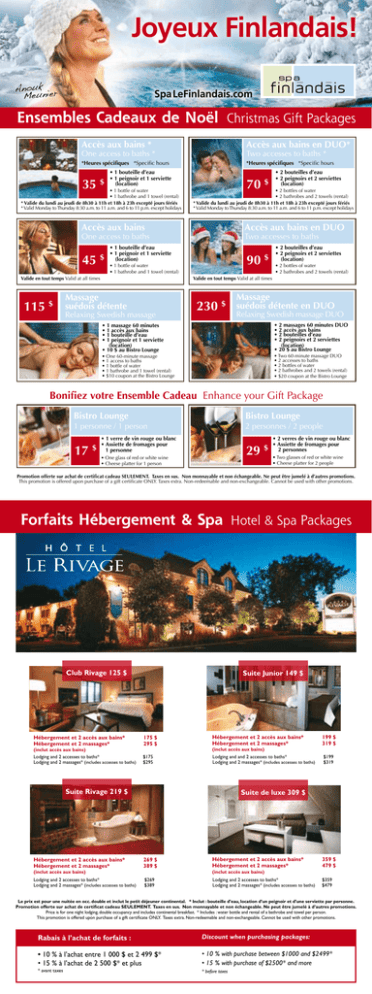 Joyeux Finlandais! Anouk r Meunie Spa LeFinlandais.com Ensembles Cadeaux de Noël Christmas Gift Packages Accès aux bains * Accès aux bains en DUO* *Heures spécifiques *Specific hours *Heures spécifiques *Specific hours One access to baths * 35 $ Two accesses to baths * • 1 bouteille d’eau • 1 peignoir et 1 serviette (location) • 1 bottle of water • 1 bathrobe and 1 towel (rental) * Valide du lundi au jeudi de 8h30 à 11h et 18h à 23h excepté jours fériés * Valid Monday to Thursday 8:30 a.m. to 11 a.m. and 6 to 11 p.m. except holidays 70 Accès aux bains en DUO One access to baths 45 115 Two accesses to baths • 1 bouteille d’eau • 1 peignoir et 1 serviette (location) 90 • 1 bottle of water • 1 bathrobe and 1 towel (rental) $ • 2 bouteilles d’eau • 2 peignoirs et 2 serviettes (location) • 2 bottles of water • 2 bathrobes and 2 towels (rental) Valide en tout temps Valid at all times Valide en tout temps Valid at all times $ • 2 bouteilles d’eau • 2 peignoirs et 2 serviettes (location) • 2 bottles of water • 2 bathrobes and 2 towels (rental) * Valide du lundi au jeudi de 8h30 à 11h et 18h à 23h excepté jours fériés * Valid Monday to Thursday 8:30 a.m. to 11 a.m. and 6 to 11 p.m. except holidays Accès aux bains $ $ Massage suédois détente Relaxing Swedish massage 230 $ Massage suédois détente en DUO Relaxing Swedish massage DUO • 2 massages 60 minutes DUO • 2 accès aux bains • 2 bouteilles d’eau • 2 peignoirs et 2 serviettes (location) • 20 $ au Bistro Lounge • 1 massage 60 minutes • 1 accès aux bains • 1 bouteille d’eau • 1 peignoir et 1 serviette (location) • 10 $ au Bistro Lounge • Two 60-minute massage DUO • 2 accesses to baths • 2 bottles of water • 2 bathrobes and 2 towels (rental) • $20 coupon at the Bistro Lounge • One 60-minute massage • 1 access to baths • 1 bottle of water • 1 bathrobe and 1 towel (rental) • $10 coupon at the Bistro Lounge Bonifiez votre Ensemble Cadeau Enhance your Gift Package Bistro Lounge Bistro Lounge 1 personne / 1 person 2 personnes / 2 people 17 $ • 1 verre de vin rouge ou blanc • Assiette de fromages pour 1 personne 29 • One glass of red or white wine • Cheese platter for 1 person $ • 2 verres de vin rouge ou blanc • Assiette de fromages pour 2 personnes • Two glasses of red or white wine • Cheese platter for 2 people Promotion offerte sur achat de certificat cadeau SEULEMENT. Taxes en sus. Non monnayable et non échangeable. Ne peut être jumelé à d’autres promotions. This promotion is offered upon purchase of a gift certificate ONLY. Taxes extra. Non-redeemable and non-exchangeable. Cannot be used with other promotions. Forfaits Hébergement & Spa Hotel & Spa Packages Club Rivage 125 $ Suite Junior 149 $ Hébergement et 2 accès aux bains* Hébergement et 2 massages* 175 $ 295 $ Hébergement et 2 accès aux bains* Hébergement et 2 massages* (inclut accès aux bains) Lodging and 2 accesses to baths* Lodging and 2 massages* (includes accesses to baths) $175 $295 Lodging and and 2 accesses to baths* Lodging and 2 massages* (includes accesses to baths) Suite Rivage 219 $ Hébergement et 2 accès aux bains* Hébergement et 2 massages* $199 $319 Suite de luxe 309 $ 269 $ 389 $ Hébergement et 2 accès aux bains* Hébergement et 2 massages* $269 $389 Lodging and 2 accesses to baths* Lodging and 2 massages* (includes accesses to baths) (inclut accès aux bains) Lodging and 2 accesses to baths* Lodging and 2 massages* (includes accesses to baths) 199 $ 319 $ (inclut accès aux bains) 359 $ 479 $ (inclut accès aux bains) $359 $479 Le prix est pour une nuitée en occ. double et inclut le petit déjeuner continental. * Inclut : bouteille d’eau, location d’un peignoir et d’une serviette par personne. Promotion offerte sur achat de certificat cadeau SEULEMENT. Taxes en sus. Non monnayable et non échangeable. Ne peut être jumelé à d’autres promotions. Price is for one night lodging, double occupancy and includes continental breakfast. * Includes : water bottle and rental of a bathrobe and towel per person. This promotion is offered upon purchase of a gift certificate ONLY. Taxes extra. Non-redeemable and non-exchangeable. Cannot be used with other promotions. Rabais à l’achat de forfaits : Discount when purchasing packages: • 10 % à l’achat entre 1 000 $ et 2 499 $* • 15 % à l’achat de 2 500 $* et plus • 10 % with purchase between $1000 and $2499* • 15 % with purchase of $2500* and more * avant taxes * before taxes