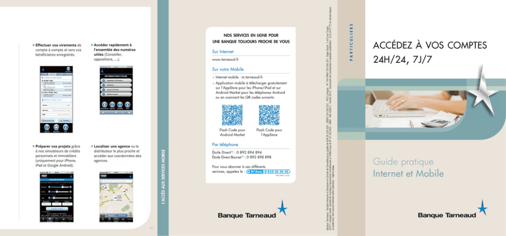 une banque toujours proche de vous > Accéder rapidement à l’ensemble des numéros utiles (Conseiller, oppositions, ….). Sur Internet www.tarneaud.fr Sur votre Mobile Internet mobile : m.tarneaud.fr Application mobile à télécharger gratuitement sur l’AppStore pour les iPhone/iPad et sur Android Market pour les téléphones Android ou en scannant les QR codes suivants. Flash Code pour Android Market Par téléphone > Localiser une agence ou le distributeur le plus proche et accéder aux coordonnées des agences. L’ACCÈS AUX SERVICES MOBILE > Préparer vos projets grâce à nos simulateurs de crédits personnels et immobiliers (uniquement pour iPhone, iPad et Google Android). Flash Code pour l’AppStore 21 Étoile Direct(1) : 0 892 894 894 Étoile Direct Bourse(1) : 0 892 898 898 Pour vous abonner à ces différents services, appelez le : PRIX APPEL LOCAL p a r t i c u l ie r s > Effectuer vos virements de compte à compte et vers vos bénéficiaires enregistrés. Banque Tarneaud - Société Anonyme à Directoire et Conseil de Surveillance au capital de EUR 26 529 328 - SIREN 754 500 551 - RCS Limoges - N° TVA FR69 754 500 551. Siège Social : 2 et 6 rue Turgot. 87011 Limoges Cedex. Société de courtage d’assurances immatriculée à l’ORIAS sous le N° 07 023 953 - DMO - Réf. 6292 E - Février 2012 - Document non contractuel à caractère publicitaire - (1) 0,34 € TTC la minute depuis un poste fixe, hors surcoût éventuel selon opérateur. Agence kiss nos services en ligne pour accédez à vos comptes 24h/24, 7j/7 Guide pratique Internet et Mobile bienvenue sur les services internet et mobile de votre banque Nous vous remercions d’avoir souscrit nos services Internet et Mobile pour suivre et gérer vos comptes. Simple, pratique et sécurisé, votre espace personnel vous permettra de réaliser un grand nombre d’opérations à tout moment, sans vous déplacer. En quelques clics, vous pourrez consulter le solde de vos comptes, imprimer un RIB, effectuer un virement, commander un carnet de chèques, mais aussi gérer vos contrats d’assurance vie, votre portefeuille titres ou encore accéder au meilleur de l’information financière. Ce guide d’utilisation est à votre disposition pour vous accompagner tout au long de la découverte de nos services Internet et Mobile. Nous vous souhaitons une bonne navigation. POUR TOUTES QUESTIONS CONTACTEZ NOUS Par téléphone Une équipe de Conseillers est à votre écoute, du lundi au vendredi de 8h à 21h et le samedi de 9h à 17h au 01 77 86 99 64 (prix d’un appel local). Si vous souhaitez joindre votre Conseiller habituel, vous retrouverez ses coordonnées dans votre espace personnel. Par e-mail À partir de la messagerie de votre espace personnel, vous pouvez : - adresser vos messages à nos équipes : [email protected] - contacter votre agence, - effectuer des demandes de documentation. Nos Conseillers s’engagent à répondre au plus vite à vos questions et vous assurent une assistance performante et de qualité. sommaire I - L’ACCÈS AU SERVICE INTERNET Votre espace de consultation et de gestion de comptes Comment vous connecter ? 4 6 COMPTES ET OPÉRATIONS. Le suivi de vos comptes au quotidien Consultez vos comptes Téléchargez vos écritures Imprimez vos RIB Suivez l’évolution de vos placements Gérez votre crédit renouvelable Étoile Avance Gérez vos crédits personnels et immobiliers Visualisez votre compte carte American Express Paramétrez vos alertes sur compte par SMS ou e-mail Réalisez vos opérations courantes Effectuez vos virements Commandez vos chéquiers Recevez vos relevés de compte en ligne 7 7 8 9 9 9 10 10 10 11 11 13 14 TITRES ET ASSURANCE VIE. Optimisez la gestion de vos portefeuilles Consultez vos portefeuilles titres Gérez et passez vos ordres en temps réel Accédez au meilleur de l’information financière Optimisez la gestion de vos contrats d’assurance vie Consultez la situation de vos contrats d’assurance vie Réalisez vos versements et arbitrages Visualisez vos opérations 15 15 15 15 16 16 16 16 CÔTÉ PRATIQUE. Les services pratiques Votre messagerie 17 18 II - L’ACCÈS AUX SERVICES MOBILE Comment y accéder Comment vous connecter Présentation des services mobile 19 20 20 I - L’ACCÈS AU SERVICE INTERNET www.tarneaud.fr le menu par onglets votre messagerie Vous permet de consulter le détail de notre offre. Vous pouvez contacter directement votre Conseiller, consulter vos messages et accéder à vos relevés de compte. votre profil Vous pouvez le personnaliser en modifiant vos coordonnées, en choisissant vos options de banque en ligne et en paramétrant vos alertes sur compte. la barre de navigation Vous donne accès à de nombreuses fonctionnalités de gestion de vos comptes. L’ACCÈS AU SERVICE INTEERNET votre espace de consultation et de gestion de comptes votre espace souscription et adhérent tarneaud plus Vous pouvez souscrire un produit en ligne et accéder aux avantages de votre Club Tarneaud Plus si vous êtes détenteur de notre convention Tarneaud Plus. assistance technique Posez vos questions directement à nos techniciens. 4 5 Pour vous connecter, munissez-vous de votre identifiant et de votre code confidentiel. le suivi de vos comptes au quotidien L’ACCÈS AU SERVICE INTEERNET L’ACCÈS AU SERVICE INTEERNET comment vous connecter ? Cliquez sur l’onglet dans la barre de navigation pour faire apparaître le menu ci-contre. Identifiant : ce numéro vous est communiqué par votre Conseiller à la souscription de votre abonnement Internet. Vous pouvez le retrouver sur vos relevés de compte. Code confidentiel : vous recevez ce code par courrier séparé, dans les 72 heures suivant la souscription de votre abonnement Internet. Lors de votre première connexion, vous devrez impérativement le personnaliser. consultez vos comptes Cliquez sur la rubrique de la barre de navigation afin de faire apparaître la synthèse de vos comptes. Cette synthèse v