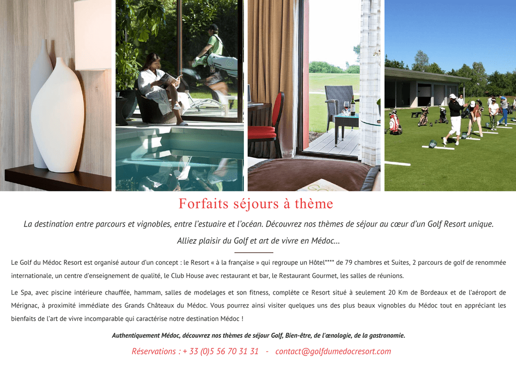 Forfaits séjours à thème La destination entre parcours et vignobles, entre l’estuaire et l’océan. Découvrez nos thèmes de séjour au cœur d’un Golf Resort unique. Alliez plaisir du Golf et art de vivre en Médoc… Le Golf du Médoc Resort est organisé autour d’un concept : le Resort « à la française » qui regroupe un Hôtel**** de 79 chambres et Suites, 2 parcours de golf de renommée internationale, un centre d’enseignement de qualité, le Club House avec restaurant et bar, le Restaurant Gourmet, les salles de réunions. Le Spa, avec piscine intérieure chauffée, hammam, salles de modelages et son fitness, complète ce Resort situé à seulement 20 Km de Bordeaux et de l’aéroport de Mérignac, à proximité immédiate des Grands Châteaux du Médoc. Vous pourrez ainsi visiter quelques uns des plus beaux vignobles du Médoc tout en appréciant les bienfaits de l’art de vivre incomparable qui caractérise notre destination Médoc ! Authentiquement Médoc, découvrez nos thèmes de séjour Golf, Bien-être, de l'œnologie, de la gastronomie. Réservations : + 33 (0)5 56 70 31 31 - [email protected] Nous vous proposons d’ores et déjà ces quelques thèmes dont vous pourrez vous inspirer pour concevoir votre séjour, nos équipes restant à votre disposition pour moduler et organiser votre programme au plus près de vos envies. Pour vos séjours en groupe, une étude précise vous sera proposée sur simple demande de votre part. Le Forfait Golf Le Forfait Séjour « Par Excellence » Le f o rf a it co m pr e nd : Le fo rf a it co m pr e nd : L’hébergement 1 nuit en chambre double et petits déjeuners buffet L’hébergement 2 nuits en chambre double et petits déjeuners buffet 1 green-fee par personne sur nos parcours « Les Châteaux » ou « Les Vignes » 1 dîner de bienvenue à « La Table du Médoc » (selon disponibilité) Tarif : A partir de 117 €uros par personne en chambre double. * selon périodes et catégorie de chambre. 2 green-fee par personne sur nos parcours « Les Châteaux » ou « Les Vignes » (selon disponibilité) L’accès libre à l'Espace Spa (piscine intérieure chauffée, hammam, solarium, terrasse de repos, espace Cardio-fitness). Tarif : A partir de 270 €uros par personne en chambre double. * selon périodes et catégorie de chambre. Le Plus : Accompagnants non golfeurs : les green-fee peuvent être remplacés par des soins au Spa Decléor, spécialiste de l’aromathérapie (réservation préalable souhaitée). Le Plus : Accompagnants non golfeurs : les green-fee peuvent être remplacés par des soins au Spa Decléor, spécialiste de l’aromathérapie (réservation préalable souhaitée). L’accès libre à l'Espace Spa (piscine intérieure chauffée, hammam, solarium, terrasse de repos, espace Cardio-fitness). Le Forfait « Golf Expérience » Le Forfait « Médoc Golf Pass » Découvrez les parcours du Golf du Médoc, deux parcours de championnat, deux Découvrez les Golfs du Médoc, trois clubs vous ouvrent leurs fairways, trois approches différentes du jeu. approches différentes du jeu : Le f o rf a it co m pr e nd : Le Golf du Médoc avec ses 2 parcours de compétition, le Golf de Lacanau, en forêt, à L’hébergement 3 nuits en chambre double et petits déjeuners buffet quelques pas de l’océan Atlantique, le Golf de Margaux, bordé par La Gironde...Le 3 green-fee sur nos parcours « Les Châteaux » ou « Les Vignes » (selon disponibilité) Médoc Golf Pass vous permet de découvrir les 3 golfs. L’accès libre à l'Espace Spa (piscine intérieure chauffée, hammam, solarium, terrasse de repos, espace Cardio-fitness). Le fo rf a it co m pr e nd : L’hébergement 3 nuits en chambre double et petits déjeuners buffet Le « Médoc Golf Pass », soit 3 green-fee sur un choix de 4 parcours L’accès libre à l'Espace Spa (piscine intérieure chauffée, hammam, solarium, Tarif : A partir de 327 €uros par personne en chambre double. * selon périodes et catégorie de chambre. terrasse de repos, espace Cardio-fitness). Tarif : A partir de 357 €uros par personne en chambre double. * selon périodes et catégorie de chambre. * Validité des offres année 2016, selon disponibilité. Prix indicatifs selon périodes et catégorie de chambre.