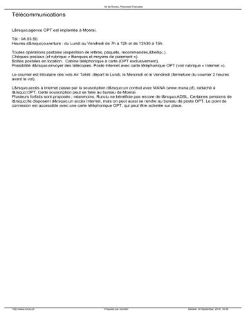 Ile de Rurutu, Polynesie Francaise Télécommunications L’agence OPT est implantée à Moerai. Tél : 94.03.50. Heures d’ouverture : du Lundi au Vendredi de 7h à 12h et de 12h30 à 15h. Toutes opérations postales (expédition de lettres, paquets, recommandés,….). Chèques postaux (cf rubrique « Banques et moyens de paiement »). Boîtes postales en location. Cabine téléphonique à carte (OPT exclusivement). Possibilité d’envoyer des télécopies. Poste Internet avec carte téléphonique OPT (voir rubrique « Internet »). Le courrier est tributaire des vols Air Tahiti: départ le Lundi, le Mercredi et le Vendredi (fermeture du courrier 2 heures avant le vol). L’accès à internet passe par la souscription d’un contrat avec MANA (www.mana.pf), rattaché à l’OPT. Cette souscription peut se faire au bureau de Moerai. Plusieurs forfaits sont proposés ; néanmoins, Rurutu ne bénéficie pas encore de l’ADSL. Certaines pensions de l’île disposent d’un accès Internet, mais on peut aussi se rendre au bureau de poste OPT. Le point de connexion est accessible avec une carte téléphonique OPT, qui peut être achetée sur place. http://www.rurutu.pf Propulsé par Joomla! Généré: 30 September, 2016, 14:30