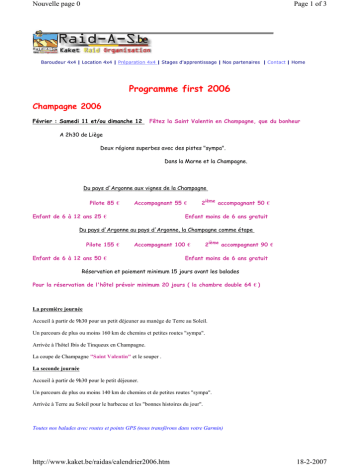 Nouvelle page 0 Page 1 of 3 Baroudeur 4x4 | Location 4x4 | Préparation 4x4 | Stages d'apprentissage | Nos partenaires | Contact | Home Programme first 2006 Champagne 2006 Février : Samedi 11 et/ou dimanche 12 Fêtez la Saint Valentin en Champagne, que du bonheur A 2h30 de Liège Deux régions superbes avec des pistes "sympa". Dans la Marne et la Champagne. Du pays d'Argonne aux vignes de la Champagne Pilote 85 € Accompagnant 55 € Enfant de 6 à 12 ans 25 € 2ième accompagnant 50 € Enfant moins de 6 ans gratuit Du pays d'Argonne au pays d'Argonne, la Champagne comme étape Pilote 155 € Accompagnant 100 € Enfant de 6 à 12 ans 50 € 2ième accompagnant 90 € Enfant moins de 6 ans gratuit Réservation et paiement minimum 15 jours avant les balades Pour la réservation de l'hôtel prévoir minimum 20 jours ( la chambre double 64 € ) La première journée Accueil à partir de 9h30 pour un petit déjeuner au manège de Terre au Soleil. Un parcours de plus ou moins 160 km de chemins et petites routes "sympa". Arrivée à l'hôtel Ibis de Tinqueux en Champagne. La coupe de Champagne "Saint Valentin" et le souper . La seconde journée Accueil à partir de 9h30 pour le petit déjeuner. Un parcours de plus ou moins 140 km de chemins et de petites routes "sympa". Arrivée à Terre au Soleil pour le barbecue et les "bonnes histoires du jour". Toutes nos balades avec routes et points GPS (nous transférons dans votre Garmin) http://www.kaket.be/raidas/calendrier2006.htm 18-2-2007 Nouvelle page 0 Page 2 of 3 Mars : Samedi 04 et dimanche 05 Voir ROAD L’Oriental Maroc 2006 « Le Maroc de JC autrement » Avril :du 09 au 15 Le 8 au soir, bateau avec cabine 4 couchettes de Almeria à Nador Oujda (le souk) le 9 – Figuig (la palmeraie) le 10 – Merzouga (les dunes) le 11 – Tinerhir (Gorges du Todra) le 12 – Midelt (la montagne) le 13 – Saïdia (la mer) le 14 – Nador (le port d’embarquement) le 15 Prise en charge depuis l'Espagne– hôtels de luxe en demi pension Merzouga « le bivouac » 4 étoiles et la balade à dromadaire Road book - Assistance technique Tarif disponible fin novembre réservation avant fin Février Demandez-nous vos fiches d'inscription Tracé ouvert à tous où vous ne risquez pas d’endommager votre 4x4 Paiement au compte : 340-0346566-23 TEL: +32(0)85 511 720 FAX: +32(0)85 513 599 MOB:+32(0)477 349 621 Email:raid-a-s @ kaket.be ( organisation sous réserve du nombre de participants ) Pays d’Argonne 2006 Mai : Samedi 27 ou Dimanche 28 SAMEDI UN PARCOURS DE PLUS DE 270 KM DE CHEMINS ET PETITES ROUTES "SYMPA" UNE COUPURE APRES 150 KM, AU TUNNEL, BOISSONS ET PETITE RESTAURATION ARRIVEE A TINQUEUX (REIMS) LOGEMENT A L'HOTEL IBIS (ou équivalent) A 20 H COURTE LIAISON POUR NOTRE "SUPER RESTO" DU SOIR DIMANCHE ACCUEIL A PARTIR DE 9 H POUR LE PETIT DEJEUNER A L'HOTEL DISTRIBUTION DES ROAD BOOK http://www.kaket.be/raidas/calendrier2006.htm 18-2-2007 Nouvelle page 0 Page 3 of 3 UN PARCOURS DE PLUS DE 130 KM DE CHEMINS ET PETITES ROUTES "SYMPA" DECOUVERTE DES VIGNES DE CHAMPAGNE ET DU PAYS D'ARGONNE ARRIVEE A Terre au Soleil VERS 14H POUR LE BARBECUE FINAL LES BONNES HISTOIRES DU WEEK END. Toutes nos balades avec routes et points GPS (que nous transférons dans votre Garmin) NEW Bientôt nos balades sur TRIPY Road book électronique OUVERT A TOUS, VOUS NE RISQUEZ PAS D'ENDOMMAGER VOTRE 4X4 ROAD BOOK 30 € PARTICIPANT 150 € ENFANT DE -de 12 ANS 50 € RESERVATION ET PAIEMENT AVANT LE 1er MAI PAIEMENT AU COMPTE 340-0346566-23 ORGANISATION SOUS RESERVE DU NOMBRE DE PARTICIPANTS UNE FORMULE TOUT COMPRIS: Lunch de bienvenue. Une boisson au Tunnel. La coupe de champagne en apéritif et le souper gastronomique. La nuit d'hôtel en chambre double (single +32€). Tarif enfant si logement avec les parents (sous réserve de disponibilité de chambres adaptées). Le petit déjeuner. Le barbecue final (boissons comprises). Tracé ouvert à tous où vous ne risquez pas d’endommager votre 4x4 Demandez-nous vos fiches d'inscription Paiement au compte : 340-0346566-23 TEL: +32(0)85 511 720 FAX: +32(0)85 513 599 MOB:+32(0)477 349 621 Email:raid-a-s @ kaket.be ( organisation sous réserve du nombre de participants ) http://www.kaket.be/raidas/calendrier2006.htm 18-2-2007