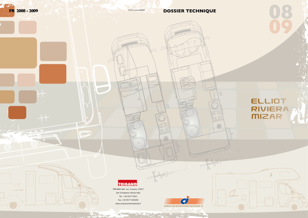 FR 2008 - 2009 FR Ed. 01 printed 08/2008 DOSSIER TECHNIQUE TRIGANO SpA: Loc. Cusona, 53037 San Gimignano (Siena) Italy Tel. +39 0577 6501 Fax +39 0577 650200 www.caravansinternational.it w w w. c a r av a n s i n t e r n a t i o n a l . i t 08 09 00-01 DIMENSIONS Largeur extérieure maximale Longueur ext.max (sans porte-moto) Longueur ext. max (avec porte-moto) Longueur ext.max (avec porte-moto rallongé) Hauteur intérieure / extérieure Matière paroi/toit Épaisseur plancher/paroi/toit PLACES Places homologuées Places homologuées (avec porte-moto/ptac supérieur à 3500 Kg) Places couchage LITS Lit double en capucine Lit double arrière Lit double dinette Lit simple dinette et banquette Lit simple arrière (n.2) Lit superposé COFFRES (OUVERTURE UTILE) Coffre garage Coffre de soute Coffre à volume variable INSTALLATIONS Plaque de cuisson (avec allumage électronique) / four à gaz / grill Évier cuisine Réfrigérateur trimixte (220V 12V,GAZ) (capacité brute totale réfrigérateur) Chauffe-eau (boiler) 10 litres Thermoventilation en capucine Centrale de commandes électronique Prise de courant intérieure 12V / 230V Pack hors gel Capacité réservoir eaux propres / eaux usées / WC cassette Chauffage de série 1ère option chauffage 2ème option chauffage Hotte aspirante Corffre à gaz (nombre de bonbonnes) EXTERIEUR Marche-pied d’accès à la cellule Baies Lanterneau (40x40 cm) / Panoramique Midi Heki (500x700 mm) / Lanterneau transparent (400x400 mm) / Lanterneau toilette (28x28 cm) Poubelle (intégrée dans la porte) Porte avec Baie Ouvrante Galerie avec échelle Lumière extérieure Fixations porte-vélo Porte-vélo ( poids maxi 50 Kg) Porte-moto (poids 100 kg) Attelage (non monté) Pare-chocs peint Carters feux avant et arrière Porte avec Baie Fixe Carter supérieur arrière Moustiquaire pour porte cellule INTERIEUR Sièges pivotants cabine conducteur / Sièges pivotants passager Housses de sièges cabine Rideau de séparation cabine Rideau supplémentaire nuit Revêtement intérieur standard / revêtement intérieur en option Habillage paroi de capucine / capucine équipée Rallonge table dinette Porte rigide cabine douche Moquette cabine / cellule Rampe d’accès au garage pour moto/ rangement Rampe d’accès au garage Emplacement LCD/ support LCD 15 notes Um ELLIOT Easy E 603 P ELLIOT Easy E 605 ELLIOT Easy E 655 ELLIOT E 655 ELLIOT Easy E 703 P ELLIOT E 703 P ELLIOT Easy E 706 ELLIOT E 706 ELLIOT Easy E 759 P ELLIOT E 759 P ELLIOT E 756 M ELLIOT E 759 ( g) (g ) ( g) ( g) (g)(h) mm mm mm mm mm mm 2300 6260 1950 / 2700 POLYESTER / POLYESTER 50 / 30 / 30 2300 6210 1990 / 2900 POLYESTER / POLYESTER 50 / 30 / 30 2310 6710 6710 7250 1990 / 3200 POLYESTER / POLYESTER 75 / 30 / 30 2310 6860 7110 7450 1990 / 2900 POLYESTER / POLYESTER 75 / 30 / 30 2310 7040 1990 / 3200 POLYESTER / POLYESTER 75 / 30 / 30 2310 7145 1990 / 2900 POLYESTER / POLYESTER 75 / 30 / 30 2310 7310 1990 / 3020 POLYESTER / POLYESTER 75 / 30 / 30 2310 7240 1990 / 3020 POLYESTER / POLYESTER 75 / 30 / 30 ( g) N° 3 4 4 4 (ELLIOT Easy E 706) 6 (ELLIOT E 706) 4 6 5 (g ) N° - - 4 (ELLIOT Easy E 655) 6 (ELLIOT E 655) 4 (ELLIOT Easy E 655) / 6 (ELLIOT E 655) / - 4/- -/- -/- -/6 -/6 N° 3 -(4) 5 6 4 7 4 7 6 L x P mm L x P mm L x P mm L x P mm L x P mm L x P mm 1980X1300 2160X700 - 2160x1680 2160x1150(690) 2160x830 (n.2) 2160X1680 1860X1250 1050(840)X2160 (N.2) 1980X1300 2160X1215 - 2160X1680 1870X1250 1890X650 1900X840(720) (N.2) 2160X1425(1250) 2160X1210(870) - 2160X1680 1875X1250 1770X660 750X1900 (N.2) 2160X1680 2160X1470(1340) 1870X1250 - L x P mm L x P mm L x P mm 970x420 - 720x1070 (n.2) 670x1070 (N.2) 970x420 - - - 1670x1070 920x1130 (n.2) - 1670x1070 970x1170 (n.2) - N° 3 INTEGRE 80 3 ENCASTRE 80 3 INTEGRE 110 3 INTEGRE 141 3 INTEGRE 115 3 ENCASTRE 110 3 INTEGRE 141 3 INTEGRE 141 N.P. N.P. STD STD STD STD N.P. N.P. STD STD N.P. N.P. N.P. STD N.P. STD litres Analogique 1|3 OPT 75 / 105 / 17 Analogique 1|3 OPT 100 / 105 / 17 Analogique 1|3 OPT 100 + 55 / 105 + 55 / 17 Analogique 1|3 OPT 50 (capacite’ max 105) / 105 / 17 Analogique 1|3 OPT 100 / 108 / 17 Analogique 1|3 OPT 50 (capacite’ max 105) / 105 / 17 N° X Kg Truma Combi C4 Truma Combi C6 Truma Combi C6 EH N.P. 2 x 15 kg Truma S3002 N.P. N.P. N.P. 2 x 15 kg Analogique 1|3 OPT 50 (capacite’ max 105) / 105 / 17 Truma S3002 N.P. N.P. N.P. 2 x 15 kg Truma Combi C4 Truma Combi C6 Truma Combi C6 EH N.P. 2 x 15 kg Truma S3002 N.P. N.P. N.P. 2 x 15 kg Truma Combi C4 Truma Combi C6 Truma Combi C6 EH N.P. 2 x 15 kg Truma Combi C4 Truma Combi C6 Truma Combi C6 EH N.P. 2 x 15 kg Analogique 1|3 OPT 50 (capacite’ max 105) / 98 + 40 / 17 Truma Combi C4 Truma Combi C6 Truma Combi C6 EH N.P. 2 x 15 kg N° INTEGRE SIMPLE Plastoform 2 / OPT / - / 1 INTEGRE SIMPLE Plastoform 2 / OPT / - / 1 INTEGRE DOUBLE Plastoform 2 / OPT / - / 1 INTEGRE SIMPLE Plastoform 2 / OPT / - / 1 ELECTRIQUE Plastoform 2 / OPT / - / 1 INTEGRE SIMPLE Plastoform 2 / OPT / - / 1 INTEGRE DOUBLE Plastoform 3 / OPT / - / 1 INTEGRE DOUBLE Plastoform 2 / OPT / - / 1 N.P. N.P. N.P. N.P. STD OPT N.P. OPT N.P. STD N.P. N.P. OPT N.P. N.P. OPT N.P. STD OPT N.P. OPT N.P. STD N.P. OPT OPT N.P. N.P. OPT N.P. STD OPT OPT OPT N.P. STD N.P. OPT OPT N.P. N.P. N.P. N.P. STD OPT OPT OPT N.P. STD N.P. N.P. OPT N.P. N.P. OPT N.P. STD OPT N.P. OPT N.P. STD N.P. OPT OPT N.P. N.P. N.P. N.P. N.P. N.P. N.P. OPT N.P. STD N.P. N.P. OPT N.P. N.P. OPT N.P. STD OPT N.P. OPT N.P. STD N.P. OPT OPT N.P. N.P. OPT N.P. N.P. N.P. N.P. OPT N.P. STD N.P. OPT OPT STD / STD STD OPT OPT ELLIOT STD / ELLIOT OPT STD / STD STD OPT N.P. ELLIOT STD / ELLIOT OPT N.P. / N.P. OPT OPT N.P. ELLIOT STD / ELLIOT OPT STD / STD STD OPT OPT ELLIOT STD / ELLIOT OPT N.P. / N.P. OPT OPT N.P. ELLIOT STD / ELLIOT OPT STD / STD STD OPT OPT ELLIOT STD / ELLIOT OPT N.P. / N.P. OPT OPT N.P. ELLIOT STD / ELLIOT OPT N.P. / N.P. OPT OPT OPT ELLIOT STD / ELLIOT OPT poches poches poches poches STD N.P. STD / OPT N.P. / N.P. N.P. STD / OPT N.P. OPT STD / OPT N.P