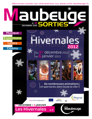 R et r o u ve z t o u t e s l e s i nfo r m a t i o n s s u r w w w. v i l l e - m a u b e u g e . f r Maubeuge N° 12 décembre 2012 sorties Musique Expositions Loisirs Cinéma 1er décembre > 6 janvier Les Hivernales p.4 Les temps forts du mois de décembre 2012 loisirs du 1er décembre au 6 janvier maubeuge les hivernales Cette année encore, la ville et ses associations vous proposent de nombreuses animations et spectacles dans toute la ville. La place Vauban accueuillera notamment une patinoire (voir infos en dernière page) pour de bons moments de joie et de détente en famille ou entre amis ! Découvrez le programme détaillé en pages 4 et 5 de ce numéro. • 02/12 : Bal country line dance • 08/12 : Inauguration des illuminations • 08 et 09/12 : Marché de Noël • du 21/12 au 06/01 : Patinoire • 22/12 : Feu d’artifice Contact : 03 27 53 43 40 Infos p. 4 et 5 musique / danse 8 décembre maison folie soirée moovance Secteur 7 vous propose de célébrer les fêtes avant l’heure en se retrouvant autour d’un petit buffet apéritif, dans une soirée rythmée par la danse et la musique, le samedi 8 décembre à La Maison Folie Maubeuge, à partir de 21 h. Au programme de cette soirée, shows et démonstrations des artistes qui gravitent autour de l’Association Secteur 7, et Dj Urkel aux platines pour ouvrir la piste de danse aux adeptes de la Salsa, du Ragga, de l’Orientale, de l’Africaine, de la Housedance...et du Hip Hop !!! Au programme : Seven Feet Under, Cresh’N Do, Triaade, Do Not 4 Get et bien d’autres encore... Rendez-vous donc le samedi 8 décembre pour la Soirée Moovance !!! Contact : www.secteur7.fr 2 Infos p. 6 exposition du 24/11 au 9/12 maison folie lidia hudzik Exposition Lidia Hudzik à la Maison Folie du mardi au dimanche inclus de 14 h à 19 h. Formée à l’école des beaux-arts de Cracovie en Pologne, Lidia Hudzik est une artiste peintre et pratique l’artthérapie. Au sein de l’abstraction de ses toiles, c’est une lumière délicate qui révèle les formes de ses sujets. • Visite de l’exposition avec l’artiste. • Visites de groupes sur demande. • Entrée libre. Contact : 03 27 68 52 56 Infos p. 7 aux alentours 14 décembre louvroil sly johnson Sly Johnson est connu pour être l’un des meilleurs beatboxers, accompagné d’un sampleur, il se lance dans des réinterprétations de titres de son répertoire. • En première partie AKM en solo. • Espace Culturel Casadesus à 20 h. • Tarif : 8 € / 6 € Contact : 03 27 39 37 30 Infos p. 7 3 Agenda des manifestations de décembre 2012 Hivernales Hivernales Hivernales 2012 Les Le 02/12 Bal country line dance au profit du Téléthon, animé par René Guylline (Association Chaparal Country Club). à la salle Abbé Bras à 14 h - Tarif : 5 €. Contact : 06 89 20 60 95 ou 06 30 67 16 73 Repas de Noël organisé par l’association « Voir Ensemble » à la salle des fêtes du faubourg de Mons. 9 Salon international multicollections « La Collect’Lions » (Lion’s Club Maubeuge Hainaut) à l’Espace Sculfort de 9 h à 18 h. Tarif : 2 € (au profit du Téléthon). Gratuit pour les enfants de moins de 12 ans accompagnés. Restauration sur place : repas + 1 boisson : 12 € e Contact : 06 14 26 86 10 ou 06 85 21 39 37 Le 08/12 Inauguration des illuminations du centre-ville, du marché de Noël et du Téléthon. à 16 h 30 à l’Espace Sculfort : départ du bus illuminé. Les 08 et 09/12 Marché de Noël par l’association du quartier de la gare de Douzies à l’Espace Sculfort. Samedi : ouverture de 11 h à 21 h avec repas bavarois à 20 h 30. Dimanche : ouverture de 10 h à 20 h, animations de 14 h 30 à 18 h 30 : présence de « Big Balloon », un échassier-sculpteur 4 de ballon et d’un musicien jouant de l’orgue de barbarie lumineux. Entrée gratuite. Samedi et dimanche : animation maquillage par le lycée Jeanne d’Arc d’AulnoyeAymeries. Présence du Téléthon. Contact : 03 27 64 13 33 Le 09/12 Venue du Père Noël à l’Espace Sculfort de 15 h à 17 h. Du 11 au 15/12 « L’Homme cirque » Spectacle de cirque grand public animé par David Dimitri, organisé par le Théâtre du Manège du mardi 11 au samedi 15 décembre : à 14 h 30 jeudi 13 et vendredi 14 décembre : à 20 h sous le Chapiteau - Parking Roosevelt. Tarifs : 11 € / 8 € Contact : 03 27 65 65 40 Le 12/12 Déambulation de clowns dès 14 h 30 en centre-ville assurée par Yves Domary. Circuit : Place Vauban, rue du 145e R.I, avenue Albert 1er, avenue Roosevelt, place des Nations, avenue Mabuse, avenue de France, avenue de la Gare, boulevard de l’Europe. Le 13/12 Goûter de Noël organisé par l’association « Maubeuge Bienvenue », à 15 h à la salle des fêtes du faubourg de Mons. Contact : 03 27 68 43 27 Le 13/12 Bus illuminé à la crèche « Frimousse » à 17 h. Le 14/12 Bus illuminé Visite gratuite des illuminations de la ville. à 17 h 45 et 18 h 30. Tout public. Départ et arrivée à la gare (arrêt de bus « Bus illuminé »). Le 15/12 Déambulation musicale de Noël en centre-ville : « La fanfare des pères Noël » dès 15 h 30. Circuit : Place Vauban, rue du 145e R.I, avenue Albert 1er, avenue Roosevelt, place des Nations, avenue Mabuse, avenue de France, avenue de la Gare, boulevard de l’Europe. « Noël au faubourg de Mons » De 15 h à 18 h devant l’église du faubourg de Mons. Chalets avec vin chaud, boissons chaudes, gaufres, barbe à papa. Présence de la maison du Père Noël, distribution de friandises et petits cadeaux. Tombola gratuite. Chants de Noël à 16 h 30 à l’église par la chorale de Feignies « Diapason ». Contact : 03 27 65 23 33 Venue du Père Noël en centre-ville de 14 h 30 à 18 h Dîner-spectacle « Les déglingués » à 20 h à la Maison Folie par l’association « Le Théâtre de l’étincelle ». Contact : 03 27 62 11 92 (sur réservation) Passage du bus illuminé Lobbes, Thuin, Binche, Mons et Le Quesnoy. (accueil, chocolat chaud, dis