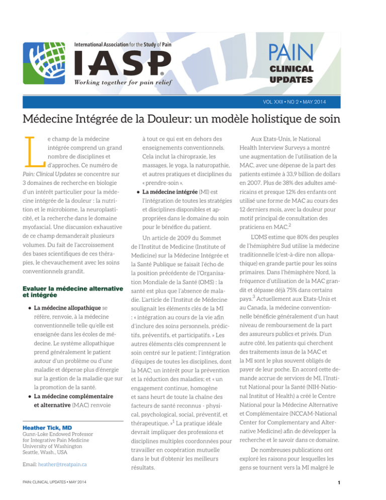 ® VOL XXI••NO NO 21 • JUNE 2013 VOL XXII MAY 2014 Médecine Intégrée de la Douleur: un modèle holistique de soin Vol.ÊXXI,ÊIssueÊ1Ê JuneÊ2013 L Editorial Board e champ de la médecine Editor-in-Chief intégrée comprend un grand JaneÊC.ÊBallantyne,ÊMD,ÊFRCA nombre de disciplines et Anesthesiology,ÊPainÊMedicine USA d’approches. Ce numéro de Pain: Clinical Updates se concentre sur AdvisoryÊBoard 3 domaines de recherche en biologie MichaelÊJ.ÊCousins,ÊMD,ÊDSC d’unPainÊMedicine,ÊPalliativeÊMedicine intérêt particulier pour la médeAustralia cine intégrée de la douleur : la nutri- à tout ce qui est en dehors des Aux Etats-Unis, le National PsychosocialÊAspectsÊofÊChronicÊPelvicÊPain enseignements conventionnels. Health Interview Surveys a montré Cela inclut la chiropraxie, les une augmentation de l’utilisation de la massages, le yoga, la naturopathie, MAC, avec une dépense de la part des Pain is unwanted, is unfortunately and remains for survival (i.e., et autres pratiques et disciplines common, du patients estiméeessential à 33,9 billion de dollars evading danger) and facilitating medical diagnoses. This complex amalgamation of « prendre-soin ». en 2007. Plus de 38% des adultes amésensation, emotions, and thoughts manifests itself as pain behavior. Pain is a moti• La médecine intégrée (MI) est ricains et presque 12% des enfants ont vating factor for physician consultations1 and for emergency department visits and is l’intégration de toutes les stratégies utilisé une forme de MAC au cours des tion et le microbiome, la neuroplasti- et disciplines disponibles et ap- 12 derniers mois, avec la douleur pour cité, et la recherche dans le domaine propriées dans le domaine du soin motif principal de consultation des myofascial. Une discussion exhaustive pour le bénéfice du patient. praticiens en MAC.2 de ce champ demanderait plusieurs Un article de 2009 du Sommet L’OMS estime que 80% des peuples volumes. Du fait de l’accroissement de l’Institut de Medicine (Institute of de l’hémisphère Sud utilise la médecine des bases scientifiques de ces théra- Medicine) sur la Médecine Intégrée et traditionnelle (c’est-à-dire non allopa- pies, le chevauchement avec les soins la Santé Publique se faisait l’écho de thique) en grande partie pour les soins conventionnels grandit. la position précédente de l’Organisa- primaires. Dans l’hémisphère Nord, la tion Mondiale de la Santé (OMS) : la fréquence d’utilisation de la MAC gran- santé est plus que l’absence de mala- dit et dépasse déjà 75% dans certains die. L’article de l’Institut de Médecine pays.3 Actuellement aux Etats-Unis et • La médecine allopathique se soulignait les éléments clés de la MI au Canada, la médecine convention- réfère, renvoie, à la médecine : « intégration au cours de la vie afin nelle bénéficie généralement d’un haut conventionnelle telle qu’elle est d’inclure des soins personnels, prédic- niveau de remboursement de la part enseignée dans les écoles de mé- tifs, préventifs, et participatifs. » Les des assureurs publics et privés. D’un decine. Le système allopathique autres éléments clés comprennent le autre côté, les patients qui cherchent prend généralement le patient soin centré sur le patient; l’intégration des traitements issus de la MAC et autour d’un problème ou d’une d’équipes de toutes les disciplines, dont la MI sont le plus souvent obligés de maladie et dépense plus d’énergie la MAC; un intérêt pour la prévention payer de leur poche. En accord cette de- sur la gestion de la maladie que sur et la réduction des maladies; et « un mande accrue de services de MI, l’Insti- la promotion de la santé. Evaluer la médecine alternative et intégrée engagement continue, homogène tut National pour la Santé (NIH-Natio- • La médecine complémentaire et sans heurt de toute la chaîne des nal Institut of Health) a créé le Centre et alternative (MAC) renvoie facteurs de santé reconnus - physi- National pour la Médecine Alternative cal, psychological, social, préventif, et et Complémentaire (NCCAM-National 1 Heather Tick, MD Gunn-Loke Endowed Professor for Integrative Pain Medicine University of Washington Seattle, Wash., USA Email: [email protected] PAIN: CLINICAL UPDATES • MAY 2014 thérapeutique. » La pratique idéale Center for Complementary and Alter- devrait impliquer des professions et native Medicine) afin de développer la disciplines multiples coordonnées pour recherche et le savoir dans ce domaine. travailler en coopération mutuelle De nombreuses publications ont dans le but d’obtenir les meilleurs exploré les raisons pour lesquelles les résultats. gens se tournent vers la MI malgré le 1 coût. Parmi les raisons citées ressort la maintenant ceux du SIDA/VIH.6 Les dus aux radicaux libres, entrave les différence fondamentale entre MI et comptes des erreurs médicales - depuis mécanismes de guérison, et réduit le soin conventionnel : l’objectif princi- le rapport de l’Institut de Médecine en pH à des niveaux où les réactions enzy- 7 pal de la MI est la santé plutôt que la 1999, « To err is human » , en passant matiques normales essentielles pour le maladie. Il existe un équilibre entre par un article de B. Starfield8 en 2000, fonctionnement cellulaire ne sont plus 9 les précisions d’un diagnostic donné, puis à un autre de J.T. James en 2013 - optimisées. Un régime anti-inflamma- comme un disque intervertébral L4-L5 mettent en lumière le lourd bilan porté toire comme le régime méditerranéen dégénératif, et la totalité du patient - par le système de soin prodigué par les - qui comprend beaucoup de végétaux, corps, esprit et âme. Ainsi, la MI porte hôpitaux, qui se portent maintenant légumes, fruits, céréales complètes, ème plus d’attention sur des facteurs tels au 3 l’obésité, le statut nutritionnel,