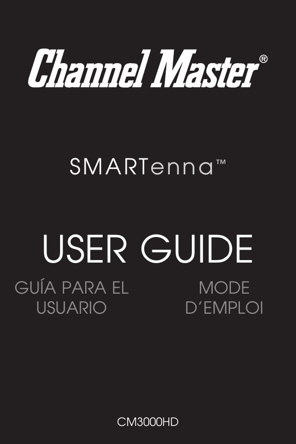 SMARTenna ™ USER GUIDE GUÍA PARA EL USUARIO CM3000HD MODE D’EMPLOI This page intentionally left blank. Table of Contents Product Overview.........................................................................................2 Package Contents and Accessories.......................................3 Danger Information.....................................................................................4 CM3000HD Installation Instructions Indoor Use, Table Top.........................................................................6 Outdoor Use, Wall Mounting.......................................................7 Outdoor Use, Mast Mounting.....................................................9 Operating Instructions...........................................................................10 Features and Benefits............................................................................11 Customizing Your SMARTenna......................................................11 Product Return Policy and Warranty....................................12 Índice Perspectiva general del producto.........................................14 Contenido del paquete y accesorios................................14 Información sobre peligros..............................................................15 Instrucciones de instalación de la CM3000HD Interiores, sobremesa........................................................................17 Uso en Exteriores, Montaje en Pared.............................18 Uso en Exteriores, Montaje en Mástil..............................20 Instrucciones de Operación...........................................................22 Características y Beneficios............................................................22 Personalizar su SMARTenna.............................................................22 Garantía y póliza para la devolución del producto.............................................................................................23 Index Présentation du Produit.......................................................................25 Contenu et Accessoires de L'emballage........................26 Conseils de Sécurité................................................................................26 Instructions D'installation CM3000HD a Utilisation intérieure, Support....................................................29 Utilisation à L'extérieur, Montage Mural......................30 Utilisation à L'extérieur, Montage du Mât.................32 Mode d'emploi..............................................................................................33 Particularités et données techniques..................................34 Personnalisation de Votre SMARTenna..............................34 Politique de reprise de marchandise et garantie...................................................................................................35 1 CM3000HD Outdoor & Indoor 360° Signal Reception Antenna Antena de Recepción de señal a 360°, para interiores y exteriores Reception du signal d’antenne à 360 ° en Extérieur & en Intérieur 360˚ TV SIGNAL RECEPTION RECEPCIÓN DE SEÑAL DE TV a 360° RÉCEPTION DU SIGNAL TV à 360 ˚ CM-3000HD Product Overview The Channel Master CM3000HD is a unique new digital HDTV antenna designed for indoor or outdoor installations. It is engineered to be easy to install in any location to meet your needs. Every antenna is made of the finest components to exceed consumer expectations. That means peace of mind for years to come. 2 S M A R Te n n a ™ Product Features • Designed for both indoor and outdoor installations • Excellent for HDTV reception • Easy installation indoors or outdoors • Omni directional performance • UV stabilized plastics and weather resistant design • Can be painted to match the décor of your home Package Contents and Accessories 1. Antenna Unit 2. Four Table top feet for indoor use 3. Four (10 mm) self-tapping screws for attaching the feet to the antenna unit 4. Mast/Wall mount for outdoor use 5. Four (55 mm) self-tapping screws for wall mounting 6. Two U-bolts and four butterfly nuts for mast mounting 7. Two (15mm) self-tapping screws for attaching the outdoor metal mount to the antenna unit. 8. Two (10mm) round head square neck screws for outdoor metal mount 9. Connector weather boot 10.90 degree F-type adapter 3 WATCH FOR WIRES! You can be KILLED if this antenna comes near electric power lines! READ INSTRUCTIONS WARNING AND SAFETY INFORMATION Please read this user's manual before operating this product. The information contained in this document is subject to change without notice. Features or specifications may be different depending on the type of product model purchased. 4 S M A R Te n n a ™ Follow These Procedures for the Safest Installation 1. Perform as much antenna assembly on the ground as possible. 2. Watch out for overhead power lines. Check the distance to the power lines before you start installing. WE RECOMMEND YOU STAY A MINIMUM OF TWICE THE MAXIMUM LENGTH OF THE ANTENNA ASSEMBLY AWAY FROM ALL POWER LINES. 3. Do not use a metal ladder. 4. Remember, even the slightest touch of an antenna to a power line can cause a fatal shock. 5. Do NOT try to do the job on a windy day. 6. Have a friend as a spotter when you’re on the roof. They can see things you can’t. 7. If you start to drop an antenna, move away from it and let it fall. 8. If any part of the antenna should come into contact with a power line CALL YOUR LOCAL POWER COMPANY! DO NOT TRY TO REMOVE IT YOURSELF! They will remove it safely. 9. Mast, lead-in, and metal guy wires are excellent conductors of electrical current - - keep them away from power lines too. 10.Be sure your family and friends understand the danger of touching an overhead power line. Tell them never to try to remove any object in contact with a power line (TV antenna, mast or anything else). 11.Make sure that the antenna mast assembly is