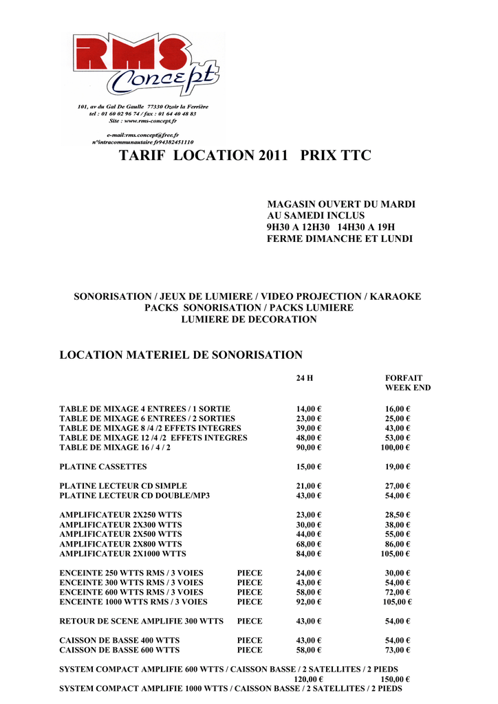 TARIF LOCATION 2011 PRIX TTC MAGASIN OUVERT DU MARDI AU SAMEDI INCLUS 9H30 A 12H30 14H30 A 19H FERME DIMANCHE ET LUNDI SONORISATION / JEUX DE LUMIERE / VIDEO PROJECTION / KARAOKE PACKS SONORISATION / PACKS LUMIERE LUMIERE DE DECORATION LOCATION MATERIEL DE SONORISATION 24 H FORFAIT WEEK END TABLE DE MIXAGE 4 ENTREES / 1 SORTIE TABLE DE MIXAGE 6 ENTREES / 2 SORTIES TABLE DE MIXAGE 8 /4 /2 EFFETS INTEGRES TABLE DE MIXAGE 12 /4 /2 EFFETS INTEGRES TABLE DE MIXAGE 16 / 4 / 2 14,00 € 23,00 € 39,00 € 48,00 € 90,00 € 16,00 € 25,00 € 43,00 € 53,00 € 100,00 € PLATINE CASSETTES 15,00 € 19,00 € PLATINE LECTEUR CD SIMPLE PLATINE LECTEUR CD DOUBLE/MP3 21,00 € 43,00 € 27,00 € 54,00 € AMPLIFICATEUR 2X250 WTTS AMPLIFICATEUR 2X300 WTTS AMPLIFICATEUR 2X500 WTTS AMPLIFICATEUR 2X800 WTTS AMPLIFICATEUR 2X1000 WTTS 23,00 € 30,00 € 44,00 € 68,00 € 84,00 € 28,50 € 38,00 € 55,00 € 86,00 € 105,00 € ENCEINTE 250 WTTS RMS / 3 VOIES ENCEINTE 300 WTTS RMS / 3 VOIES ENCEINTE 600 WTTS RMS / 3 VOIES ENCEINTE 1000 WTTS RMS / 3 VOIES PIECE PIECE PIECE PIECE 24,00 € 43,00 € 58,00 € 92,00 € 30,00 € 54,00 € 72,00 € 105,00 € RETOUR DE SCENE AMPLIFIE 300 WTTS PIECE 43,00 € 54,00 € CAISSON DE BASSE 400 WTTS CAISSON DE BASSE 600 WTTS PIECE PIECE 43,00 € 58,00 € 54,00 € 73,00 € SYSTEM COMPACT AMPLIFIE 600 WTTS / CAISSON BASSE / 2 SATELLITES / 2 PIEDS 120,00 € 150,00 € SYSTEM COMPACT AMPLIFIE 1000 WTTS / CAISSON BASSE / 2 SATELLITES / 2 PIEDS 150,00 € 180,00 € SYSTEM PORTABLE 80 WTTS / BATTERIE AUTONOMIE 6H/ RECHARGEABLE / LECTEURCD MP3 INTEGRE + 2 MICROS HF / EXTENTION MICRO / ENTREE LIGNE / MIXAGE CLEF USB 57,00 € 60,00 € MICRO FIL SENNHEISER OU SHURE KIT MICROS INSTRUMENTS AUDIOPHONY KIT MICROS INSTRUMENTS SENNHEISER MICRO INSTRUMENT MICRO CUIVRE 11,50 € 22,20 € 40,00 € 11,50 € 11,50 € 13,00 € 25,00 € 50,00 € 13,00 € 13,00 € MICRO MAIN H.F SENNHEISER MICRO SERRE TETE H.F SENNHEISER MICRO CRAVATE H.F SENNHEISER 30,00 € 30,00 € 30,00 € 35,00 € 35,00 € 35,00 € 6,10 € 7,00 € PIED DE MICRO + PERCHETTE LOCATION KARAOKE LECTEUR DVD AVEC 2 MICROS MAIN + 10 DISQUES DVD ( ENTRE 100 ET 150 TITRES ) 80,00 € 100,00 € DISQUE DVD SUPPLEMENTAIRE 4,50 € 5,00 € LOCATION VIDEO PROJECTION VIDEO PROJECTEUR 3500 LUMENS VIDEO PROJECTEUR 1500 LUMENS ECRAN SUR PIED 244X183 ECRAN SUR PIED 180X150 80,00 € 60,00 € 35,00 € 15,00 € 100,00 € 80,00 € 40,00 € 20,00 € LOCATION MATERIEL ANIMATION LUMIERE TOUS LES JEUX DE LUMIERE SONT ANIMES MUSICALEMENT PAR UN MICRO INCORPORE BOULE A FACETTES 30 CM + MOTEUR ET PROJECTEUR 12,00 € 13,50 € 22,00 € 24,50 € BOULE A FACETTES 50 CM + MOTEUR ET PROJECTEUR GOBOLIGHT/ PROJECTION IMAGES ET COULEURS 18,00 € 20,00 € NEW FLOWER LEDS / 40 RAYONS EN PROJECTION 20,00 € 23,00 € NEW ORION / PROJECTEUR 180 LEDS DE COULEURS 26,00 € 30,00 € ANDROMEDA / PROJECTEUR 92 LEDS DE COULEURS 18,00 € 20,00 € CALYPSO / PROJECTEUR A 156 LEDS DE COULEURS 21,00 € 24,00 € DOUBLE BOULE DISCO / 3 ROTATIONS A 360° 35,00 € 40,00 € NEW BARRE SUR PIED COMPRENANT 4 PROJECTEURS FLOWER A LEDS CLRS / ENCHAINEMENT DES PROGRAMMES SUR LA MUSIQUE . 35,00 € 40,00 € NEW KALEIDO/ PROJECTION KALEIDOSCOPIQUE DE CLRS 22,00 € 25,00 € CRATER / PROJECTEUR MULTIRAYONS DE COULEURS 18,00 € 20 ,00 € PROJECTEUR DE SCENE PROJECTEUR PAR 56 / 300 WTTS + FILTRE CLRS 6,00 € 7,00 € PROJECTEUR PAR 64/ 1000 WTTS + FILTRE CLRS 11,00 € 13,00 € PROJECTEUR PAR 36 / RAYON CONCENTRE 3,40 € 4,00 € 2 PROJECTEURS 4X 500 WTTS / 4 COULEURS DICKROIQUE / 2 PIEDS + 1 CONTROLEUR MODULATEUR / VARIATEUR / TOUS CABLES DE LIAISON . 58,00 € 65,00 € DECORATION LUMIERE « NOUVEAU « BOITE AMBRE / A POSER AU SOL POUR ECLAIRAGE MURAL / 120 WTTS / PRISE ENTREE ET SORTIE 7,00 € 8,00 € PROJECTEUR LEDS PAR 56 / A POSER AU SOL OU ACCROCHE / ENCHAINEMENT DES COULEURS AUTOMATIQUE OU MUSIC 13,00 € 15,00 € RAMPE DE LEDS POUR ECLAIRAGE MURAL FONDU ENCHAINEE DE COULEURS / GRAND POUVOIR COUVRANT 35,00 € 40,00 € LASER MULTI POINTS ROUGE ET VERT EN MOUVEMENT / MULTIPROGRAMME TRES GRAND POUVOIR COUVRANT 13,00 € 15,00 € MACHINE A EFFET FLAMME / ECLAIRAGE LEDS / FLAMME HAUTEUR 1,50M 26,00 € FIRE / PROJECTEUR SIMULATEUR EFFET FLAMMES 22,00 € WATER / PROJECTEUR EFFET D’EAU 22,00 € PSY / PROJECTEUR SIMULATEUR DE REFLET D’EAU 22,00 € 30,00 € 25,00 € 25,00 € 25,00 € PROJECTEUR DE POURSUITE PROJECTEUR DE POURSUITE 1000 WTTS AVEC PIED PROJECTEUR DE POURSUITE 575 HMI AVEC PIED 34,00 € 90,00 € 40,00 € 100,00 € 15,00 € 9,00 € 17,00 € 10,00 € 11,00 € 31,00 € 13,00 € 34,00 € REGIE ANIMATION LUMIERE MODULATEUR/GRADATEUR/CHENILLARD 6 VOIES DISPACHING 10 VOIES MARCHE / ARRET STROBOSCOPE STROBOSCOPE 300 JOULES / REGLAGE ECLAIRS STROBOSCOPE 1500 JOULES / REGLAGE ECLAIRS LASERS LASER VERT 80 MMWTTS PROJECTION DANS L’ESPACE PROGRAMME AUTOMATIQUE SUR LA MUSIQUE 80,00 € 100,00 € LASER 40 MMWTTS VERT DEFILEMENT MUSICAL 30,00 € 40,00 € LASER 3 COULEURS 120 MWTTS 80,00 € 100,00 € LUMIERE NOIRE REGLETTE ET 1 TUBE LUMIERE NOIRE 1,20M REGLETTE ET 2 TUBES LUMIERE NOIRE 1,20M PROJECTEUR LUMIERE NOIRE 400 WTTS BARRE LEDS LUMIERE NOIRE PUISSANCE 200 WTTS 6,00 € 12,00 € 27,00 € 14,00 € 7,00 € 14,00 € 30,00 € 16,00 € NEW 28,00 € 12,00 € 30,00 € 30,00 € 15,00 € 40,00 € 20,00 € 55,00 € 30,00 € 59,00 € MACHINE A FUMEE MACHINE A FUMEE GROS DEBIT CDE + LIQUIDE PETITE MACHINE A FUMEE CDE + LIQUIDE MACHINE A BROUILLARD + LIQUIDE MACHINE A BULLES MACHINE A BULLES + LIQUIDE MACHINE A BULLES GROS DEBIT + LIQUIDE PIEDS ET PORTIQUE PIED REGLABLE POUR UN PROJECTEUR PIED REGLABLE (H3M) + 1 BARRE 8 ACCROCHES PORTIQUE (H MAX 3M) LONGUEUR 4M (2X2M) LOCATION 8,00 € 10,00 € 38,00 € SONORISATION ENSEMBLE 2 X 250 WTTS 1 TABLE DE MIXAGE 6 ENTREES 1 DOUBLE LECTEUR CD / MP3 1 AMPLI 2 X 250 WTTS 2 ENCEINTES 250 WTTS 1 MICRO DJ 1 CASQUE TOUS CABLES DE LIAISON 