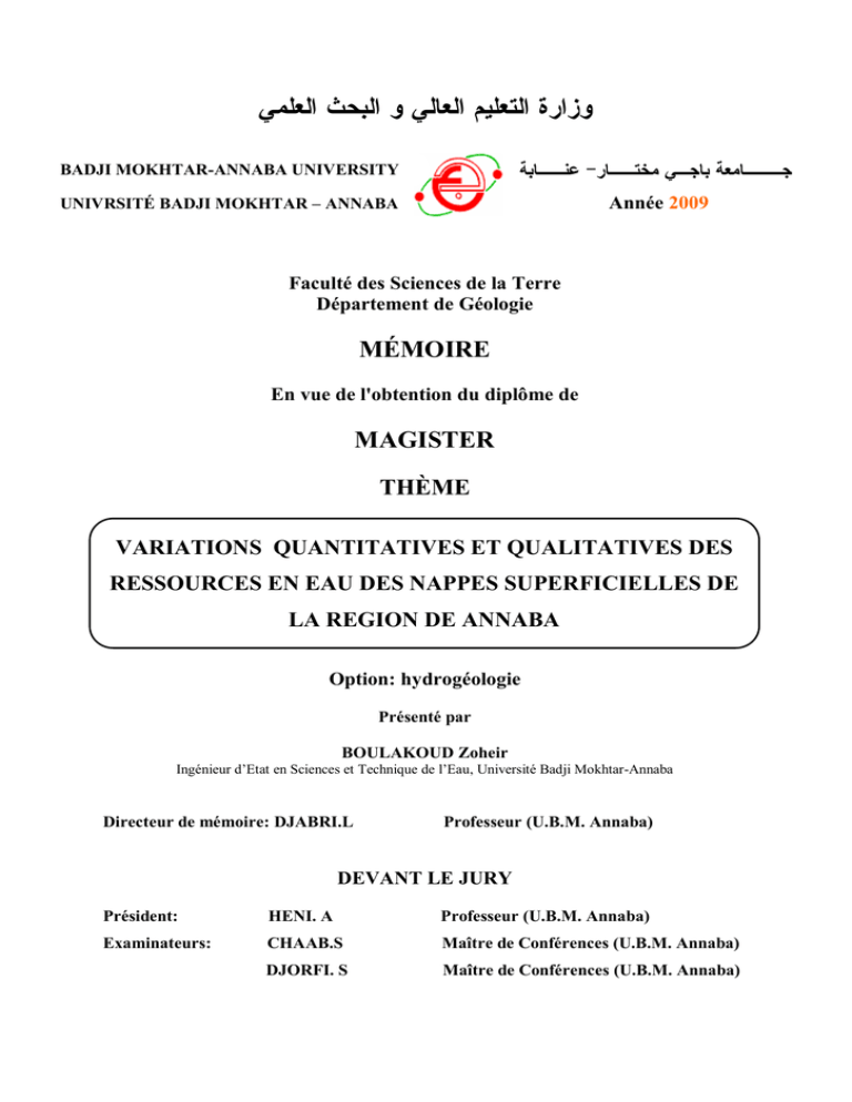 BADJI MOKHTAR-ANNABA UNIVERSITY UNIVRSITÉ BADJI MOKHTAR – ANNABA Année 2009 Faculté des Sciences de la Terre Département de Géologie MÉMOIRE En vue de l'obtention du diplôme de MAGISTER THÈME VARIATIONS QUANTITATIVES ET QUALITATIVES DES RESSOURCES EN EAU DES NAPPES SUPERFICIELLES DE LA REGION DE ANNABA Option: hydrogéologie Présenté par BOULAKOUD Zoheir Ingénieur d’Etat en Sciences et Technique de l’Eau, Université Badji Mokhtar-Annaba Directeur de mémoire: DJABRI.L Professeur (U.B.M. Annaba) DEVANT LE JURY Président: HENI. A Professeur (U.B.M. Annaba) Examinateurs: CHAAB.S Maître de Conférences (U.B.M. Annaba) DJORFI. S Maître de Conférences (U.B.M. Annaba) VARIATIONS QUANTATATIVES ET QUALITITATIVES DES RESSOURCES EN EAU DES NAPPES SUPERFICIELLES DE LA REGION DE ANNABA Résumé L'eau est un élément constituTif fondamental de la vie, est en a-nnt de toute activité économique. C’est une ressource de plus en plus polluée. Selon l'O.M.S, trois à quatre millions de personnes meurent chaque année dans les pays pauvres de maladies liées à la mauvaise qualité de l'eau. La croissance industrielle, démographique, et l'urbanisation de la région de Annaba$ et la présence d'un dense réseau de route3. Ont provoqué une augmejtation des déchets ildustriels, les canaux des eaux usées, a conduit à la détérioration $e l’environnement et la pollution de l'eau, en particulier les eaux de surface (les eaux des cours d’eau de la région) par les éléments chimiques et en particulier les métaux lourds dont nous essayons dans cette étude de connaître leurs sources dans la région, leurs mouvements et leurs concentrations dans les oueds oued Zied, oued El Hout, oued Mellah et oted Meboudja). Au cours de l’année 2007, nous avons fait quelques campagnes des mesures chimiques de l'eau des forages, puits, et des oueds en vue de déterminer la source et la concentration des éléments chimiques. Les analyses chimiques qui ont été faites, nous a permis d'établir des courbes de variation des concentrations des éléments, et à différentes périodes de temps. Les résultats d'analyse de ces courbes a preuvé la présence d'éléments (métaux lourds) au niveau des oueds à des concentrations différentes indiquant la pollution des eaux par ces éléments. La pollution de l'eau des oueds par ces éléments résultant de la présence de canaux des eaux usées au niveau de ces oueds où se déversent directement, des déchets urbains ainsi que l’impact de trafic routier. La présence de ces éléments à des différentes concentrations d'un endroit à un autre à travers les oueds, témoignant d'un mouvement de transition dans l’oued depuis le début jusqu’à la fin, vers la mer. Cette pollution présente une menace majeure l’entourage de la région, et en grande partie sur la santé et la vie des habitants. Mots-clés : Nappe aquifère, Eaux souterraines, Eléments majeurs, Concentration, Les eaux de surface, La pollution, Oued, Zied, El Hout, Mellah, Meboudja, Les déchets industriels. 2007 Remerciement Au mon Dieu Le Clément et Le Miséricordieux, le grand merci Lui revient de nous avoir à elaborer ce mémoire de dissertation scientifique. La réalisation de ce travail n’aurait pu mené à terme sans le support constant de mon directeur de mémoire Mr. DJABRI Larbi. Je désir lui adresser un merci tout particulier, ses précieux commentaires, et ses conseils pertinents m’ont grandement aidé tout au long des différentes étapes inhérentes au processus de recherche et à l’élaboration de ce mémoire. Je voudrais également remercier les membres de jury, pour avoir bien voulu lire, commenter, et débattre mon mémoire. Je remercie toute personne, qui de prés ou de loin ayant généreusement contribuée à l’élaboration de ce mémoire, surtout Mr. ZUINI .D et Mr. BOULAKOUD.Med.S Tous les directeurs d’institutions et administrations des wilayas de Annaba, Taref, et de Guelma. Je voudrais remercie encore mes enseignants du département de Géologie de l’université d’Annaba, et mes collègues de la promotion de Poste Graduation hydrogéologie et minière. Si par mégarde, j’ai oublié quelqu’un, qu’il me pardonne et qu’il soit remercié pour tous. BOULAKOUD Zoheir DEDICACE Je dédie ce modeste travail à : L’esprit de mon père Ma mère Mes sœurs et mes frères Tous les gens que j’aime et qui m’aiment BOULAKOUD Zoheir Liste des figures Figure 1. Situation géographique de la zone d’étude …………………...………………….…..…....4 Figure 2. Carte du réseau hydrographique de la zone d’étude………………………………..…...…7 Figure 3 : Situation géographique et géologique des plaines de la région de Annaba (D’après Strojexport, 1975 ; modifié)……………………………………………….…….10 Figure 4 : Situation géographique du massif de l’Edough. (D’après Hilly, 1962 modifiée)………...11 Figure 5 : Colonne lithologique du massif de l'Edough (d'après Aissa D. E, 1985) ……….…….…14 Figure 6. Carte géologique schématique du massif de l'Edough et des ses environs. Hilly, 1962…..17 Figure 7. Précipitations annuelles médianes « normales» (1965-1995), (D’après ANRH-GTZ ,2003) In Azzedine MEBARKI et Jean-Pierre LABORDE……………………….….……21 Figure 8.Variation des précipitations moyennes mensuelles……………………………………..…..23 Figure 9.Variation annuelle des précipitations……………………………………………….………25 Figure 10 : Variations mensuelles des températures………………………………………….……...26 Figure 11. Diagramme ombrothermique…………………………………………………….……….28 Figure12. La représentation de l'infiltration dans la région……………………………….…………34 Figure 13.Représentation graphiq
