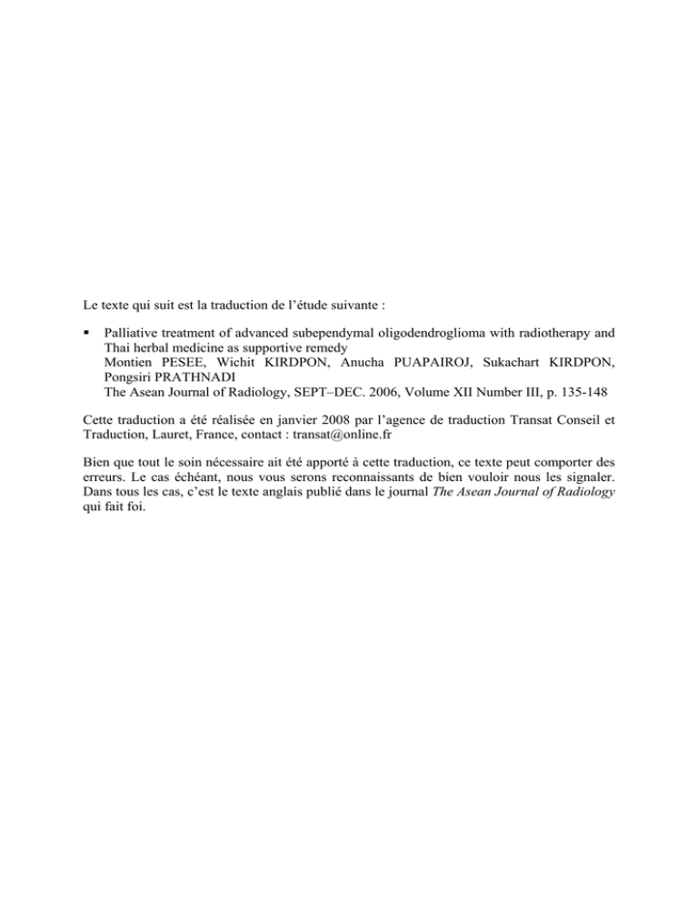 Le texte qui suit est la traduction de l’étude suivante : Palliative treatment of advanced subependymal oligodendroglioma with radiotherapy and Thai herbal medicine as supportive remedy Montien PESEE, Wichit KIRDPON, Anucha PUAPAIROJ, Sukachart KIRDPON, Pongsiri PRATHNADI The Asean Journal of Radiology, SEPT–DEC. 2006, Volume XII Number III, p. 135-148 Cette traduction a été réalisée en janvier 2008 par l’agence de traduction Transat Conseil et Traduction, Lauret, France, contact : [email protected] Bien que tout le soin nécessaire ait été apporté à cette traduction, ce texte peut comporter des erreurs. Le cas échéant, nous vous serons reconnaissants de bien vouloir nous les signaler. Dans tous les cas, c’est le texte anglais publié dans le journal The Asean Journal of Radiology qui fait foi. THE ASEAN JOURNAL OF RADIOLOGY SEPT. – DEC. 2006 Volume XII Numéro III TRAITEMENT PALLIATIF DE L’OLIGODENDROGLIOME DE HAUT GRADE PAR LA RADIOTHÉRAPIE ET LA PHYTOTHÉRAPIE THAÏLANDAISE EN TRAITEMENT D’APPOINT Montien PESEE M.D1 Wichit KIRDPON Ph.D2 Anucha PUAPAIROJ M.D3 Sukachart KIRDPON M.D4 Pongsiri PRATHNADI M.D5 RÉSUMÉ OBJECTIF : Évaluer l’effet adjuvant du produit de phytothérapie thaïlandaise Vilac Plus en complément de la radiothérapie palliative standard par rapport au contrôle historique des rapports issus de la littérature sur les oligodendrogliomes sous-épendymaires. MÉTHODES : Un oligodendrogliome sous-épendymaire non opérable chez un jeune garçon de 14 ans a été traité par radiothérapie palliative et traitement d’appoint concurrent par phytothérapie thaïlandaise (Vilac Plus). RÉSULTATS : Le résultat a révélé une réponse complète de l’oligodendrogliome sousépendymaire de haut grade. Le patient témoigne d'une bonne qualité de vie aujourd'hui, 43 mois après le diagnostic et le début du traitement. En outre, on a aussi observé une amélioration du diabète insipide, et le patient est toujours en vie avec un score de performance de Karnofsky de 100 %. Nous en sommes actuellement au 43ème mois de suivi depuis le diagnostic initial et le début du traitement (craniotomie et biopsie tumorale). CONCLUSION : Les résultats de la radiothérapie d’un oligodendrogliome sous-épendymaire non opérable utilisant la phytothérapie thaïlandaise comme traitement d’appoint se sont révélés très satisfaisants, avec une bonne qualité de vie. Cette association thérapeutique présente une modalité de traitement très prometteuse et économique, et vient confirmer le concept de l’approche complémentaire du traitement anticancéreux. Mots clés : oligodendrogliome sous-épendymaire, radiothérapie palliative, phytothérapie thaïlandaise pour le neurochirurgien, en raison de leur profondeur et de l’importance des structures adjacentes. De plus, des risques opératoires, tels qu'une lésion du champ visuel, une hémorragie thalamique postopératoire, une embolie pulmonaire, un hygrome sous-dural ou un déficit neurologique, ont été rapportés1-4. Par conséquent, dans les cas avancés, la radiothérapie palliative est la seule méthode de traitement disponible, sans INTRODUCTION Les oligodendrogliomes sousépendymaires sont rares et se présentent sous la forme de néoplasmes intracrâniens de la matrice germinale sous-épendymaire à croissance lente1-4. Les traitements standards sont chirurgicaux. De par leur nature de tumeur intraventriculaire, les oligodendrogliomes représentent un défi majeur 1 Service de radiothérapie, Département de Radiologie, Hôpital Srinagarind, Faculté de médecine, Université de Khon Kaen, Thaïlande, 40002 2 Service de médecine nucléaire, Département de Radiologie, Hôpital Srinagarind, Faculté de médecine, Université de Khon Kaen, Thaïlande, 40002 3 Département de pathologie, Hôpital Srinagarind, Faculté de médecine, Université de Khon Kaen, Thaïlande, 40002 4 Département de pédiatrie, Faculté de médecine, Université de Khon Kaen, Thaïlande, 40002 5 Département de chirurgie, Faculté de médecine, Université de Chiang Mai, Thaïlande, 50000 135 THE ASEAN JOURNAL OF RADIOLOGY SEPT. – DEC. 2006 Volume XII Numéro III fournir de résultats complètement satisfaisants en raison de l’effet de masse de la tumeur, ou de l’œdème tumoral et péritumoral associés, qui causent une augmentation de la pression intracrânienne. L’œdème cérébral aigu peut entraîner une hernie cérébrale subite. Le présent rapport porte sur un cas d’oligodendrogliome sous-épendymaire non opérable traité par radiothérapie palliative et phytothérapie thaïlandaise (Vilac Plus) comme traitement d’appoint. Il a été prouvé que le produit tonique ne présentait aucune toxicité orale aiguë dans le cadre d’une étude sur animaux5. Aucune trace de prednisolone ou de déxamethasone n’a été détectée6. Dans une étude in vitro, Vilas Plus a témoigné d’un important pouvoir antioxydant7. L’efficacité de la recette de la solution tonique phytothérapeutique thaïlandaise a été prouvée en termes d’activité antitumorale8. Elle contient trois plantes comestibles, un champignon entier nommé Ganoderma Lucidum, des feuilles d’Houttuynia Cordata Thunb et des racines de Boesenbergia Pandurata Holtt (Krachai)8. La procédure de ce projet a été approuvée par le Comité d’éthique humaine de l’Université de Khon Kaen (HE 480745). OBJECTIF Évaluer l’effet symptomatique de la phytothérapie thaïlandaise, particulièrement de Vilac Plus, en complément d'une radiothérapie palliative, par rapport au contrôle historique des rapports issus de la littérature sur les oligodendrogliomes sous-épendymaires. Cette étude a été menée dans le Service de radiothérapie, Département de Radiologie, Faculté de médecine, Université de Khon Kaen, Khon Kaen, Thaïlande. RAPPORT DE CAS Un jeune garçon thaïlandais de 14 ans s’est présenté avec des antécédents de p