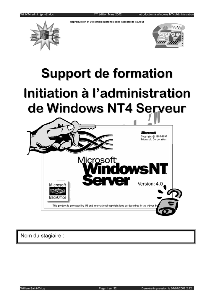 WinNT4 admin (privé).doc 1 ère édition Mars 2002 Introduction à Windows NT4 Administration Reproduction et utilisation interdites sans l’accord de l’auteur Support de formation Initiation à l’administration de Windows NT4 Serveur Nom du stagiaire : William Saint-Cricq Page 1 sur 32 Dernière impression le 07/04/2002 2:12 WinNT4 admin (privé).doc 1 ère édition Mars 2002 Introduction à Windows NT4 Administration Avertissement Ce support n’est ni un manuel d’utilisation (pour cela, consultez la documentation jointe à votre logiciel ou micro), ni un outil d’auto-formation. Ce support est un complément à vos notes personnelles pour les formations sur la gestion et maintenance micro-informatique. Modification et utilisation interdites sans l’accord de l’auteur de ce support. L’auteur de ce support sur le web : http://www.e-wsc.com Vous y trouverez des mises à jour, de nouveaux supports… William Saint-Cricq Page 2 sur 32 Dernière impression le 07/04/2002 2:12 WinNT4 admin (privé).doc 1 ère édition Mars 2002 Introduction à Windows NT4 Administration Sommaire ! INTRODUCTION ..........................................................................................................5 1. Qu’est-ce Windows NT Server ?............................................................................................................ 5 2. Différences avec Windows NT WorkStation ? ..................................................................................... 6 ! NOTION DE DOMAINE................................................................................................7 1. Qu’est-ce qu’un groupe de travail ? ..................................................................................................... 7 2. Qu’est-ce qu’un domaine ?.................................................................................................................... 8 ! INSTALLATION DE WINDOWS NT.............................................................................9 ! LES COMPTES UTILISATEURS .........................................................................10 1. Gestion des comptes utilisateurs ....................................................................................................... 10 1.a Types de compte d’utilisateur. ..................................................................................................... 10 1.a.1 Comptes créés........................................................................................................................... 10 1.a.2 Invité........................................................................................................................................... 10 1.a.3 Administrateur............................................................................................................................ 10 1.b Compte d’utilisateur pour le domaine .......................................................................................... 10 1.c Compte d’utilisateur en local ........................................................................................................ 10 2. Création d’un compte utilisateur......................................................................................................... 11 2.a Généralités................................................................................................................................... 11 2.b Création d’un compte ................................................................................................................... 12 2.c Supprimer et renommer un compte utilisateur............................................................................. 17 ! GESTION DES GROUPES 1. Groupe local .......................................................................................................................................... 19 2. Groupe global........................................................................................................................................ 19 ! PERMISSION DE PARTAGE ET NTFS.....................................................................20 1. Permission de partage ......................................................................................................................... 20 2. Permission NTFS .................................................................................................................................. 21 2.a Permissions NTFS individuelles .................................................................................................. 21 2.b Permissions standards NTFS de dossiers................................................................................... 22 2.c Permissions standards NTFS de fichiers..................................................................................... 22 3. Combinaison des permissions de partage et NTFS.......................................................................... 22 ! EXEMPLE PRATIQUE ...............................................................................................24 1. Présentation de l’entreprise................................................................................................................. 24 William Saint-Cricq ........................................................................18 Page 3 sur 32 Dernière impression le 07/04/2002 2:12 WinNT4 admin (privé).doc 1 ère édition Mars 2002 Introduction à Windows NT4 Administration 2. Description du réseau local ................................................................................................................. 24 3. Stratégie de groupes ............................................................................................................................ 26 4. Stratégie de permissions ..................................................................................................................... 28 5. Accès par utilisateur....................