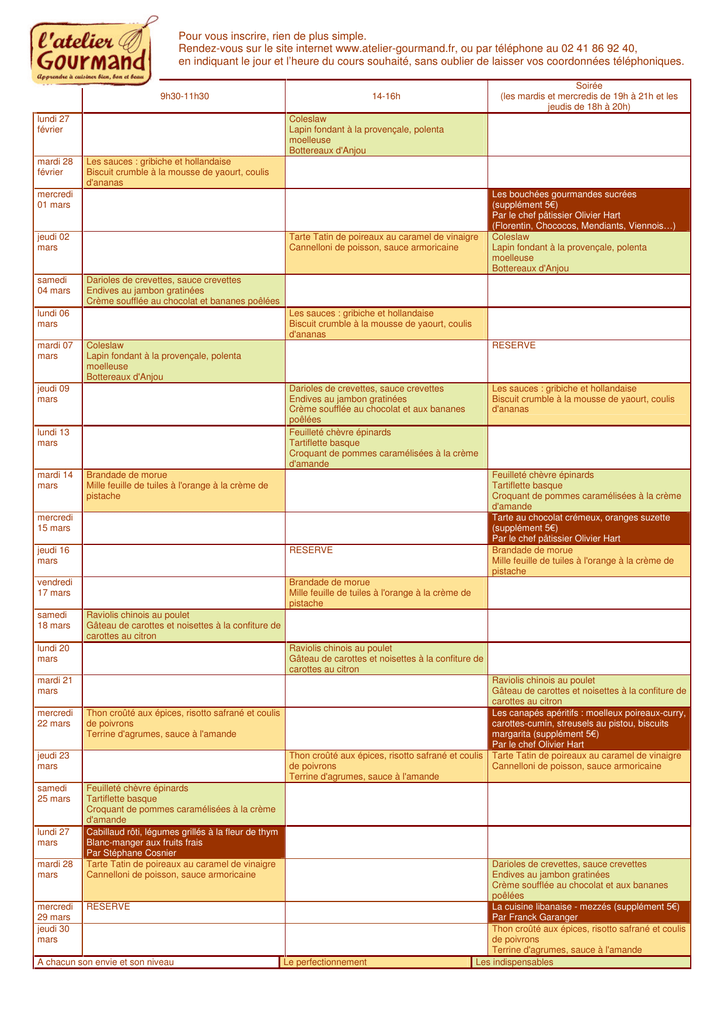 Pour vous inscrire, rien de plus simple. Rendez-vous sur le site internet www.atelier-gourmand.fr, ou par téléphone au 02 41 86 92 40, en indiquant le jour et l’heure du cours souhaité, sans oublier de laisser vos coordonnées téléphoniques. Thy 9h30-11h30 lundi 27 février mardi 28 février 14-16h Coleslaw Lapin fondant à la provençale, polenta moelleuse Bottereaux d'Anjou Les sauces : gribiche et hollandaise Biscuit crumble à la mousse de yaourt, coulis d'ananas mercredi 01 mars jeudi 02 mars samedi 04 mars Tarte Tatin de poireaux au caramel de vinaigre Cannelloni de poisson, sauce armoricaine Coleslaw Lapin fondant à la provençale, polenta moelleuse Bottereaux d'Anjou jeudi 09 mars lundi 13 mars mardi 14 mars Brandade de morue Mille feuille de tuiles à l'orange à la crème de pistache Les sauces : gribiche et hollandaise Biscuit crumble à la mousse de yaourt, coulis d'ananas Darioles de crevettes, sauce crevettes Endives au jambon gratinées Crème soufflée au chocolat et aux bananes poêlées Feuilleté chèvre épinards Tartiflette basque Croquant de pommes caramélisées à la crème d'amande mercredi 15 mars jeudi 16 mars RESERVE vendredi 17 mars Brandade de morue Mille feuille de tuiles à l'orange à la crème de pistache samedi 18 mars lundi 20 mars mardi 21 mars Les bouchées gourmandes sucrées (supplément 5 ) Par le chef pâtissier Olivier Hart (Florentin, Chococos, Mendiants, Viennois…) Coleslaw Lapin fondant à la provençale, polenta moelleuse Bottereaux d'Anjou Darioles de crevettes, sauce crevettes Endives au jambon gratinées Crème soufflée au chocolat et bananes poêlées lundi 06 mars mardi 07 mars Soirée (les mardis et mercredis de 19h à 21h et les jeudis de 18h à 20h) RESERVE Les sauces : gribiche et hollandaise Biscuit crumble à la mousse de yaourt, coulis d'ananas Feuilleté chèvre épinards Tartiflette basque Croquant de pommes caramélisées à la crème d'amande Tarte au chocolat crémeux, oranges suzette (supplément 5 ) Par le chef pâtissier Olivier Hart Brandade de morue Mille feuille de tuiles à l'orange à la crème de pistache Raviolis chinois au poulet Gâteau de carottes et noisettes à la confiture de carottes au citron Raviolis chinois au poulet Gâteau de carottes et noisettes à la confiture de carottes au citron Raviolis chinois au poulet Gâteau de carottes et noisettes à la confiture de carottes au citron mercredi Thon croûté aux épices, risotto safrané et coulis Les canapés apéritifs : moelleux poireaux-curry, 22 mars de poivrons carottes-cumin, streusels au pistou, biscuits Terrine d'agrumes, sauce à l'amande margarita (supplément 5 ) Par le chef Olivier Hart jeudi 23 Thon croûté aux épices, risotto safrané et coulis Tarte Tatin de poireaux au caramel de vinaigre mars de poivrons Cannelloni de poisson, sauce armoricaine Terrine d'agrumes, sauce à l'amande samedi Feuilleté chèvre épinards 25 mars Tartiflette basque Croquant de pommes caramélisées à la crème d'amande lundi 27 Cabillaud rôti, légumes grillés à la fleur de thym mars Blanc-manger aux fruits frais Par Stéphane Cosnier mardi 28 Tarte Tatin de poireaux au caramel de vinaigre Darioles de crevettes, sauce crevettes mars Cannelloni de poisson, sauce armoricaine Endives au jambon gratinées Crème soufflée au chocolat et aux bananes poêlées mercredi RESERVE La cuisine libanaise - mezzés (supplément 5 ) 29 mars Par Franck Garanger jeudi 30 Thon croûté aux épices, risotto safrané et coulis mars de poivrons Terrine d'agrumes, sauce à l'amande A chacun son envie et son niveau Le perfectionnement Les indispensables