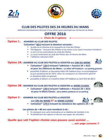 CLUB DES PILOTES DES 24 HEURES DU MANS Adhésion exclusivement réservée à tout pilote ayant participé aux 24 Heures du Mans OFFRE 2016 Choix de 4 options Option 1 : ADHERER AU CLUB DES PILOTES Cotisation* 60 € incluant la dotation suivante : le polo ou la chemise et la casquette du Club des Pilotes The Register - Annuaire des Pilotes et les mises à jour (pour nouveaux membres) Le pin’s et les autocollants du Club des Pilotes La carte nominative du Club des Pilotes des 24 Heures du Mans l’adhésion statutaire ACO Option 2A : ADHERER AU CLUB DES PILOTES et ASSISTER aux 24H DU MANS Cotisation* 120 € incluant l’adhésion « Passion 24 » ACO et pour les 24heures du Mans : un billet VIP Paddock + un parking gratuits possibilité d’obtenir un deuxième billet VIP Paddock pour un accompagnant au prix exceptionnel de 195 € (Pour les vainqueurs au classement général ce deuxième billet est gratuit) possibilité d’obtenir un troisième billet VIP Paddock au tarif ACO de 385 € Option 2B : ADHERER AU CLUB DES PILOTES et ASSISTER au MANS CLASSIC Cotisation* 120 € incluant l’adhésion « Passion 24 » ACO et pour le Mans Classic : deux billets paddock et un parking Option 3 : ADHERER AU CLUB DES PILOTES et ASSISTER aux 24h DU MANS ET au MANS CLASSIC Cotisation* 170 € incluant les dotations des options 2A + 2B Nota : Les pilotes de + 80 ans sont membres à vie : Ils reçoivent une carte nominative et un diplôme de membre à vie Ils bénéficient des options ci-dessus sans payer de cotisation Quelle que soit l’option choisie vous pouvez aussi assister … … voir page suivante !! Offre 2016 – Page 1 … vous pouvez aussi assister dans des CONDITIONS EXCEPTIONNELLES : aux épreuves du WEC - World Endurance Championship 2016 (sauf 24 Heures du Mans) aux épreuves du ELMS - European Le Mans Series 2016 aux épreuves de ALMS - Asian Le Mans Series 2016 un billet VIP paddock + un parking gratuits sur demande pour chaque épreuve Calendriers 24 Heures du Mans 18-19 juin 2016 Le Mans Classic 8-9-10 juillet 2016 WEC www.fiawec.com ELMS www.europeanlemansseries.com ALMS www.asianlemansseries.com Réservation obligatoire un mois avant l’épreuve Autres événements réservés au Club des Pilotes des 24 Heures du Mans Rétromobile – 3 au 7 février 2016 – Paris Expo porte de Versailles Le Club des Pilotes des 24 Heures du Mans sera accueilli comme chaque année sur le Stand Porsche le 3 février à 19 heures Dîner Rolex 24 Heures du Mans - samedi 18 juin Le Club des Pilotes des 24 Heures du Mans est invité par la Société ROLEX au Club House du Golf de Mulsanne, le samedi 18 juin au soir. Les places sont limitées. Les Grandes Heures Automobiles – Linas-Monthléry – 24 & 25 septembre Le Club des Pilotes des 24 Heures du Mans est invité par Franz Hummel, créateur de l’évènement et membre de notre Club. Sur demande, 2 pass tout accès et un parking Officiel seront offerts aux membres du Club des Pilotes. Pour participer à ces événements, réservation obligatoire aupès de Marie-Reine Beaumesnil : [email protected] PAIEMENT En ligne sur le site - http://www.pilotes24hdumans.com/ Par Carte bancaire directement à Marie-Reine Beaumesnil Par Virement : IBAN – FR76 3005 6009 5709 5700 1396 161 - Code BIC CCFRFRPP Par Chèque bancaire en Euro seulement à l’ordre de : Club des Pilotes, Circuit des 24 heures du Mans, 72019 Le Mans cedex 2, France * Cotisation annuelle 2016 valable pour l’année civile Offre 2016 – Page 2