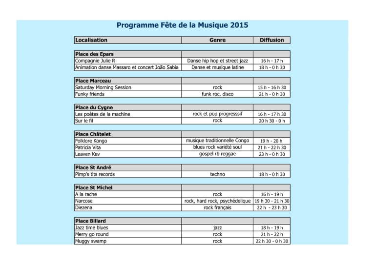 Programme Fête de la Musique 2015 Localisation Genre Diffusion Danse hip hop et street jazz Danse et musique latine 16 h - 17 h 18 h - 0 h 30 Place Marceau Saturday Morning Session Funky friends rock funk roc, disco 15 h - 16 h 30 21 h - 0 h 30 Place du Cygne Les poètes de la machine Sur le fil rock et pop progresssif rock 16 h - 17 h 30 20 h 30 - 0 h musique traditionnelle Congo blues rock variété soul gospel rb reggae 19 h - 20 h 21 h - 22 h 30 23 h - 0 h 30 techno 18 h - 0 h 30 Place des Epars Compagnie Julie R Animation danse Massaro et concert João Sabia Place Châtelet Folklore Kongo Patricia Vita Leaven Kev Place St André Pimp's tits records Place St Michel A la rache Narcose Diezena Place Billard Jazz time blues Merry go round Muggy swamp rock 16 h - 19 h rock, hard rock, psychédelique 19 h 30 - 21 h 30 rock français 22 h - 23 h 30 jazz rock rock 18 h - 19 h 21 h - 22 h 22 h 30 - 0 h 30 Place Saint Pierre Clémacasange pop rock 21 h - 0 h 30 blues rock pop rock 19 h 30 - 0 h 30 Place de l'étape aux vins Poêle percée Jam Session jazz 20 h 30 - 0 h Cathédrale Portail Nord Y'a d'la voix Scène de famille chorale chorale 19 h - 21 h 30 21 h 45 - 22 h 45 pop variété française 15 h - 17 h folk populaire 19 h 30 - 0 h jeux vocaux improvisations pop rock 16 h - 18 h 20 h - 22 h 30 chansons françaises 20 h 30 - 22 h 30 rock hip hop rap percussions slam 19 h 30 - 20 h 20 h 30 - 0 h danse now style danse hip hop 19 h - 0 h 30 20 h - 20 h 30 Place Cazalis (Le Sully) Challenger Cloître Notre Dame (bistrot de la cathédrale) Simon Geffriaud accompagné de ses musiciens Jardins de l'évêché Les blouses Brothers Rue de la Poissonnerie Au fil de la voix Le bon la butte et la raison Rue Noël Ballay Ouaouarons Boulevard Chasles Les potes rient Non stop Esplanade de la Résistance Blendys class Queen's body The Underground hip hop percussions rap 20 h - 23 h 30 kiosque à musique Arbre de vie Au 36 du mois Cochet Théo gospel chanson française guitaristes 17 h - 19 h 20 h 30 - 22 h 22 h - 23 h 30 Rue Sainte Même La bande à fernande chansons françaises 20 h - 0 h variété internationale pop rock 20 h - 23 h rock 20 h 30 - 0 h 30 chorale 19 h - 20 h blues chorale folk rock 14 h - 20 h 52 rue du Grand Faubourg Gospel Messengers choral gospel 18 h 30 - 22 h Skatepark de Beaulieu DJ Zarbi électro house 16 h - 0 h 30 Parc Noël Ballay Insociable techno 16 h - 0 h 30 Parc Léon Blum Ball is tick Reggae 16 h - 0 h 30 Rue Mal de Lattre de Tassigny Patatrack Rue de la Clouterie (Bardepoch) Les Stunders Conservatoire Scène de famille Rue du Grand Faubourg (boulangerie) B Mignot Music Live