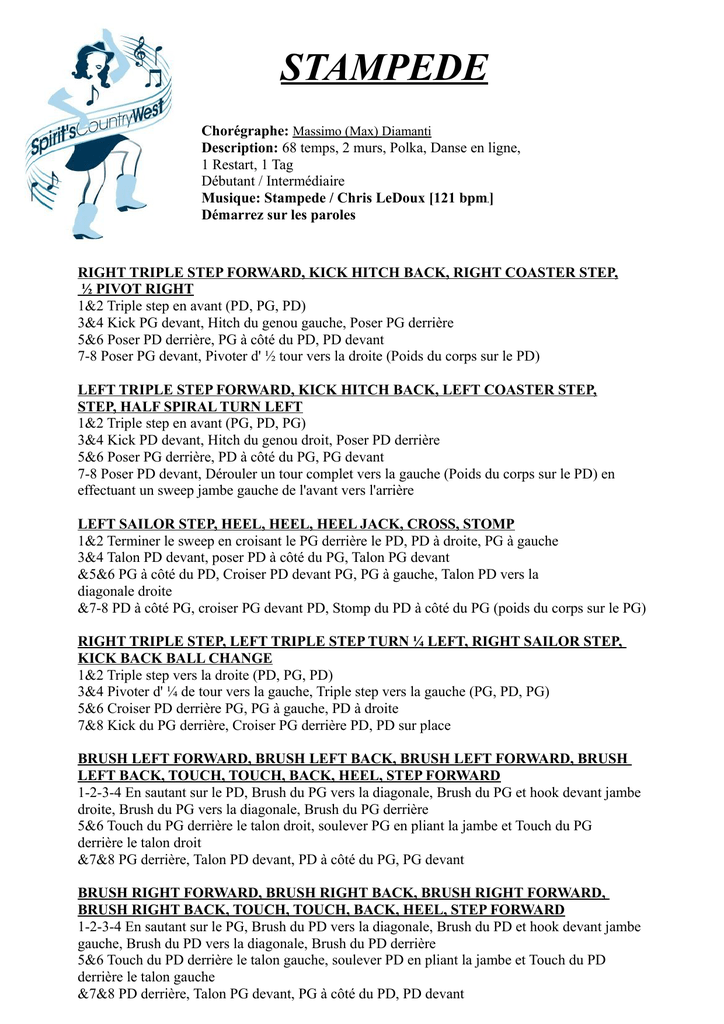 STAMPEDE Chorégraphe: Massimo (Max) Diamanti Description: 68 temps, 2 murs, Polka, Danse en ligne, 1 Restart, 1 Tag Débutant / Intermédiaire Musique: Stampede / Chris LeDoux [121 bpm ] Démarrez sur les paroles RIGHT TRIPLE STEP FORWARD, KICK HITCH BACK, RIGHT COASTER STEP, ½ PIVOT RIGHT 1&2 Triple step en avant (PD, PG, PD) 3&4 Kick PG devant, Hitch du genou gauche, Poser PG derrière 5&6 Poser PD derrière, PG à côté du PD, PD devant 7-8 Poser PG devant, Pivoter d' ½ tour vers la droite (Poids du corps sur le PD) LEFT TRIPLE STEP FORWARD, KICK HITCH BACK, LEFT COASTER STEP, STEP, HALF SPIRAL TURN LEFT 1&2 Triple step en avant (PG, PD, PG) 3&4 Kick PD devant, Hitch du genou droit, Poser PD derrière 5&6 Poser PG derrière, PD à côté du PG, PG devant 7-8 Poser PD devant, Dérouler un tour complet vers la gauche (Poids du corps sur le PD) en effectuant un sweep jambe gauche de l'avant vers l'arrière LEFT SAILOR STEP, HEEL, HEEL, HEEL JACK, CROSS, STOMP 1&2 Terminer le sweep en croisant le PG derrière le PD, PD à droite, PG à gauche 3&4 Talon PD devant, poser PD à côté du PG, Talon PG devant &5&6 PG à côté du PD, Croiser PD devant PG, PG à gauche, Talon PD vers la diagonale droite &7-8 PD à côté PG, croiser PG devant PD, Stomp du PD à côté du PG (poids du corps sur le PG) RIGHT TRIPLE STEP, LEFT TRIPLE STEP TURN ¼ LEFT, RIGHT SAILOR STEP, KICK BACK BALL CHANGE 1&2 Triple step vers la droite (PD, PG, PD) 3&4 Pivoter d' ¼ de tour vers la gauche, Triple step vers la gauche (PG, PD, PG) 5&6 Croiser PD derrière PG, PG à gauche, PD à droite 7&8 Kick du PG derrière, Croiser PG derrière PD, PD sur place BRUSH LEFT FORWARD, BRUSH LEFT BACK, BRUSH LEFT FORWARD, BRUSH LEFT BACK, TOUCH, TOUCH, BACK, HEEL, STEP FORWARD 1-2-3-4 En sautant sur le PD, Brush du PG vers la diagonale, Brush du PG et hook devant jambe droite, Brush du PG vers la diagonale, Brush du PG derrière 5&6 Touch du PG derrière le talon droit, soulever PG en pliant la jambe et Touch du PG derrière le talon droit &7&8 PG derrière, Talon PD devant, PD à côté du PG, PG devant BRUSH RIGHT FORWARD, BRUSH RIGHT BACK, BRUSH RIGHT FORWARD, BRUSH RIGHT BACK, TOUCH, TOUCH, BACK, HEEL, STEP FORWARD 1-2-3-4 En sautant sur le PG, Brush du PD vers la diagonale, Brush du PD et hook devant jambe gauche, Brush du PD vers la diagonale, Brush du PD derrière 5&6 Touch du PD derrière le talon gauche, soulever PD en pliant la jambe et Touch du PD derrière le talon gauche &7&8 PD derrière, Talon PG devant, PG à côté du PD, PD devant ROCK FORWARD, RECOVER, LEFT TRIPLE STEP TURN ½ LEFT, TURN ½ LEFT RIGHT SCUFF, STEP RIGHT BACK, COASTER STEP 1-2 Rock PG devant, Revenir poids du corps sur le PD 3&4 ½ tour vers la gauche, PG devant, PD derrière PG, PG devant 5&6 Scuff PD devant, Pivoter ½ tour vers la gauche avec hitch du genou droit, Poser PD derrière 7&8 Poser PG derrière, PD à côté du PG, PG devant HEEL SWITCH, RIGHT TOE BEHIND, ¼ TURN STEP RIGHT BACK, LEFT HEEL, STEP, PIVOT 1&2&3&4 Pointer PD à droite, PD à côté du PG, Pointer PG à gauche, PG à côté du PD, Talon PD devant, PD à côté du PG, Talon PG devant &5&6 PG à côté PD, Touch du PD derrière, Poser PD derrière, Pivoter d' ¼ de tour vers la gauche en posant le talon PG devant &7-8 PG à côté du PD, PD devant, Pivoter d' ½ tour vers la gauche (poids du corps sur le PG) Restart au 3ème mur ROCK FORWARD, RECOVER, ROCK BACK, RECOVER 1-2 Rock PD devant, Revenir poids du corps sur le PG 3-4 Rock PD derrière, Revenir poids du corps sur le PG REPEAT TAG A la fin du 6ème mur, répéter les 4 derniers temps 3 fois RESTART Restart au 3èmemur après les 64 premiers temps Se reporter impérativement à la feuille de danse originale du chorégraphe qui seule fait foi Source: Kickit [Ajouté aux archives: 9-Apr-2009] Mise en page et traduction: Ghislaine Corbel Association Spirit's Country West-95420 Magny en Vexin http://www.EveryOneWeb.fr/spiritscountrywest Stampede Choreographed by Massimo (Max) Diamanti Description:68 count, 2 wall, beginner/intermediate polka line dance Musique:Stampede by Chris LeDoux [121 bpm / Stampede / Available on iTunes ] Start dancing on lyrics RIGHT TRIPLE STEP FORWARD, KICK HITCH BACK, RIGHT COASTER STEP, ½ PIVOT RIGHT 1&2Chassé forward right, left, right 3&4Kick left forward, hitch left knee, step left back 5&6Step right back, step left together, step right forward 7-8Step left forward, turn ½ right (weight to right) LEFT TRIPLE STEP FORWARD, KICK HITCH BACK, LEFT COASTER STEP, STEP, HALF SPIRAL TURN LEFT 1&2Chassé forward left, right, left 3&4Kick right forward, hitch right knee, step right back 5&6Step left back, step right together, step left forward 7-8Step right forward, full spiral turn left (weight to right. Let left leg sweep out) LEFT SAILOR STEP, HEEL, HEEL, HEEL JACK, CROSS, STOMP 1&2Sweep/cross left behind right, step right together, step left to side 3&4Touch right heel forward, step right together, touch left heel forward &5&6Step left together, cross right over left, step left to side, touch right heel diagonally forward &7-8Step right together, cross left over right, stomp right together (weight to left) RIGHT TRIPLE STEP, LEFT TRIPLE STEP TURN ¼ LEFT, RIGHT SAILOR STEP, KICK BACK BALL CHANGE 1&2Chassé side right, left, right 3&4Step left to side, turn ¼ left and step right together, step left to side 5&6Cross right behind left, step left together, step right to side 7&8Kick left back, cross left behind right, step right in place BRUSH LEFT FORWARD, BRUSH LEFT BACK, BRUSH LEFT FORWARD, BRUSH LEFT BACK, TOUCH, TOUCH, BACK, HEEL, STEP FORWARD 1-2-3-4Hop right forward, brush left diagonally forward, brush/hook left over right, brush left diagonally forward 5&6Touch left toe behind right heel, bend left (behind right knee) and scuff right back, touch left toe behind right heel &7&8Step left back, touch right heel forward, step right together, step left forward BRUSH RIGHT FORWARD, BRUSH R