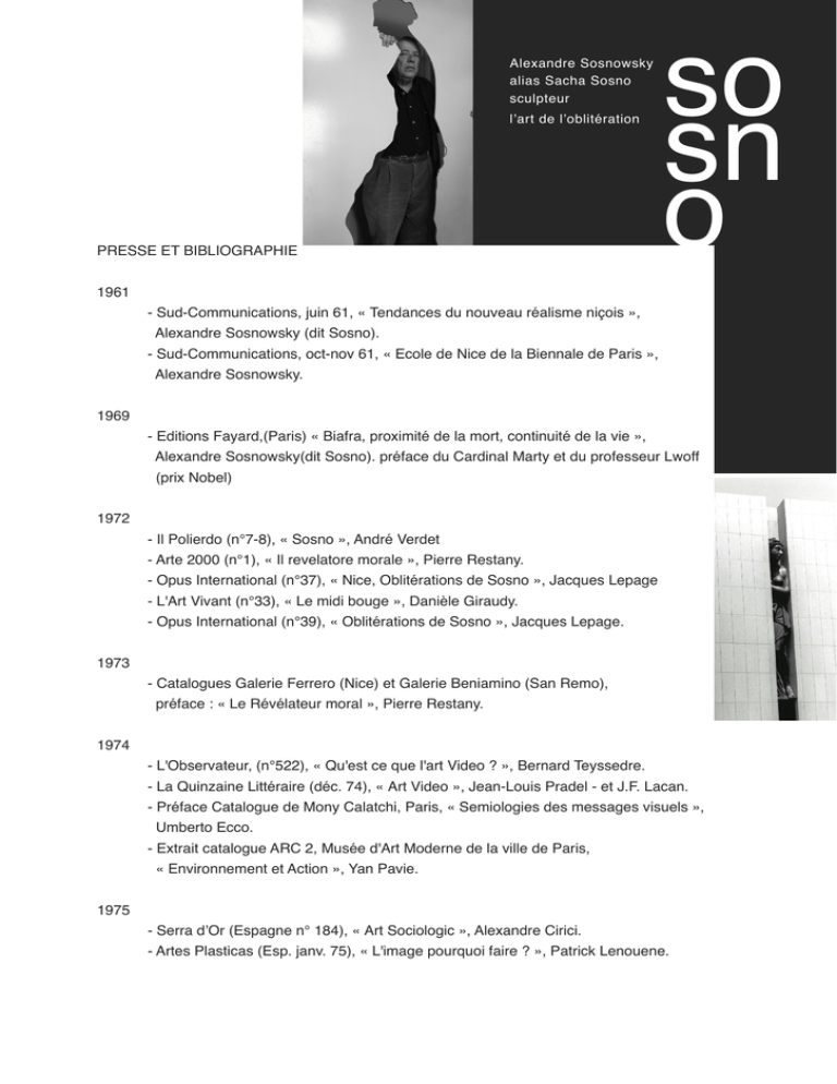 Alexandre Sosnowsky alias Sacha Sosno sculpteur l’art de l’oblitération PRESSE ET BIBLIOGRAPHIE so sn o 1961 - Sud-Communications, juin 61, « Tendances du nouveau réalisme niçois », Alexandre Sosnowsky (dit Sosno). - Sud-Communications, oct-nov 61, « Ecole de Nice de la Biennale de Paris », Alexandre Sosnowsky. 1969 - Editions Fayard,(Paris) « Biafra, proximité de la mort, continuité de la vie », Alexandre Sosnowsky(dit Sosno). préface du Cardinal Marty et du professeur Lwoff (prix Nobel) 1972 - Il Polierdo (n°7-8), « Sosno », André Verdet - Arte 2000 (n°1), « Il revelatore morale », Pierre Restany. - Opus International (n°37), « Nice, Oblitérations de Sosno », Jacques Lepage - L'Art Vivant (n°33), « Le midi bouge », Danièle Giraudy. - Opus International (n°39), « Oblitérations de Sosno », Jacques Lepage. 1973 - Catalogues Galerie Ferrero (Nice) et Galerie Beniamino (San Remo), préface : « Le Révélateur moral », Pierre Restany. 1974 - L'Observateur, (n°522), « Qu'est ce que l'art Video ? », Bernard Teyssedre. - La Quinzaine Littéraire (déc. 74), « Art Video », Jean-Louis Pradel - et J.F. Lacan. - Préface Catalogue de Mony Calatchi, Paris, « Semiologies des messages visuels », Umberto Ecco. - Extrait catalogue ARC 2, Musée d'Art Moderne de la ville de Paris, « Environnement et Action », Yan Pavie. 1975 - Serra d’Or (Espagne n° 184), « Art Sociologic », Alexandre Cirici. - Artes Plasticas (Esp. janv. 75), « L'image pourquoi faire ? », Patrick Lenouene. /2 - Opus International (n°55), « L'Art Sociologique », Jean-Louis Pradel. Préface catalogue du Centre Culturel de Villeparisis (France), « Sosno peint sur fond du monde », Dany Bloch. - Préface du catalogue de l'ICC (Anvers - Belgique), « Oblitérations de Sosno », Bernard Tesseydre. 1976 - Nice-Matin (nov.76.), « L'Ecole de Nice et réalité ? », Jean Tronchon, - Commercio de Porto (Portugal),7 déc., « Sosno, correspondente de guerra vagamundo e pintor », Jaime Ferreira. - Skira, « Sosno : J'oblitère pour y voir plus clair », Bernard Tesseydre. - Editions Fayard (Paris), « 99 omelettes », Frederik Elles et Sacha Sosno. 1977 - El Universal (Venezuela), 18 juin « Sosno pinta sobre fondo de mondo », Dany Bloch. - El Universal (Venezuela),30 sept., « LaPiramide , Sosno ». - El National (Venezuela), 1er oct., « Sosno, la problematica de la communication » 1983 - Musée Chéret, déc.83 / janv.84, communiqué de presse, Marc Sanchez. - Musée Chéret, , « Les oblitérations de Sosno », Jean Mouraille. - Catalogue du Musée Chéret, préfaces : « l'hommage au sens », Daniel Biga, et « Du fragment à l'oblitération », Jean Forneris et Claude Fournet. 1984 - Halle Sud n°3, (Nice - Genève), « Situation Nice 1984 », Jacques Lepage. 1985 - Nice-Matin, fév., « Acropolis : Arman et Sosno sur le parvis », Nicole Laffont. - Provence Médicale, « Sosno », A. Ribière.. - Nouvel Observateur, (avr. 85), France Huser, - The Wilton Bulletin (USA), 15/16 mai, « The classical tradition in recent work at Aldrich Museum », Joanna Lawrence. - Lifestyles (USA), juin« Classical studies », Kathie Beals. - L’Express Paris, « Les rendez-vous de la Fiac : L'avant garde », Otto Hahn. - Vogue, déc., « Sosno : les sentiers de la réussite », Nicole Cimadore. so sn o /3 1986 - Art Magazine (USA), « L'Ecole de Nice : a missing book », - Robert Pincus-Witten. - Nice-Matin, « l'Art par effraction », Nicole Laffont. - Suddeutsche Zeitung (Allemagne), déc, « Traume, und Alptraûme von Munchen », Vera Botterbush. - Préfaces catalogue Galerie de la Salle, St Paul de Vence « Variations sur la liberté » « Si nous parlions de beauté classique », Pierre Restany . « Sacha Sosno toujours Sisyphe », France Delville (signé Avida Ripolin). « Entries : L’ecole de Nice, a missing book » (extrait), Robert Pincus-Witten. 1987 - Préface catalogue Galerie de la Salle, « Variations sur les espaces sensibles » (St Paul de Vence), Claude Fournet et « Go », Daniel Biga. - Préfaces catalogue de l'Orangeraie (Genève), « L'Ere du vide », Michel Thévoz, et Xavier Girard, « J'écris ces lignes à l'angle de Canal street… ». 1988 - Préface catalogue du Queen's Museum (USA), « Classical myth and imagery in contempory Art », Barbara Matilsky. - Ed. Meridien Klinckiek (Paris), « Titres », Francoise Armengaud. - Préface catalogue Norton Museum (USA), « Notes for privates journal », Robert Pincus-Witten. - Cimaise, « Un secret coincé entre deux évidences », André Verdet. - Nice-Matin, juillet , « Sosno, l'art du non-dit », Nicole Laffont. - Jardin des Modes, août, « Douceur de marbre », Dominique Legay. - Elle, Elle en France, E. Valentin. - Palm Beach News, déc., « Artful "Emptiness" becomes fulfillment of sculptor's work », Millie Wolf. - Arts Magazine, déc., « Entries : Nice again », Robert Pincus-Witten. - Esthétique et Théorie des Arts , Direction : Professeur Daniel Charles et Clement Rosset. 1989 - Sculpture, janv-fév, « Elysée Palace project », Jessica Atholz, Sacha Sosno. - Elle Magazine, fév, (USA), « Riviera Roué », Kathleen Beckett Young et Sabine Cassel. - The Tampa Tribune, mars (USA), « Artist molds old images into a new one », Joanne Milani. - Sarasota Herold Tribune, fév, « Artist faces challenge with David », Joan Altabe, so sn o /4 - Nice-Matin , juin 89, « Sosno, l'appel du vide ou variations sur les coupes », Tristan Roux. - Préfaces et textes catalogue du Tampa museum of Art, Andrew Maass, « Sosno ou la métonymie de l’éléphant », Sylvain Ledieu, et « Notes from a private journal », Robert Pincus-Witten. - Art & Text, hiver 89, présenté par Allen Weiss , « On Obliteration – Extraits », Emmanuel Levinas, Françoise Armengaud. 1990 - Editions de La Différence, Paris, « De l'oblitération » , Emmanuel Lévinas, entretien avec Françoise Armengaud, à propos de l’œuvre de Sacha Sosno, pho
