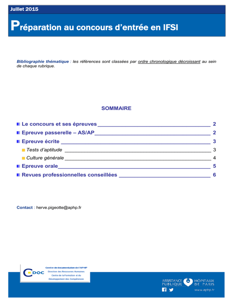 Juillet 2015 Préparation au concours d’entrée en IFSI Bibliographie thématique : les références sont classées par ordre chronologique décroissant au sein de chaque rubrique. SOMMAIRE Le concours et ses épreuves _____________________________________ 2 Epreuve passerelle – AS/AP______________________________________ 2 Epreuve écrite _________________________________________________ 3 Tests d’aptitude ____________________________________________________ 3 Culture générale ____________________________________________________ 4 Epreuve orale__________________________________________________ 5 Revues professionnelles conseillées ______________________________ 6 Contact : [email protected] Le concours et ses épreuves LAFARGUE (François)/LAFARGUE (Vincent) Réussir le concours d'entrée en IFSI : catégorie B. Paris : Hachette, 2014, 270p.. PRE 2.2 LAF BICHART (Raymonde)/BONJEAN (Valérie) DUCASTEL (Anne), éd. IFSI. Malakoff : Foucher, 2014, 191p.. PRE 2.2 BIC LEFRANC (Sylvie), éd. Concours infirmier 2015. Malakoff : Initiatives Santé : Lamarre, 2014, XIII+285p., ann.. PRE 2.2 LEF JABRANE (Badia)/MOUTARLIER (Muriel) IFSI Tout-en-un. Levallois-Perret : Groupe Studyrama, 2014, 429p., ann.. PRE 2.2 JAB CATTIAUX (Christiane)/MULLER (Nicolas) Comité d'Entente des Formations Infirmières et Cadres. (C.E.F.I.E.C.). Villeneuve-Saint-Georges. FRA Concours IFSI 2015 : annales corrigées. Issy-les-Moulineaux : Elsevier Masson, 2014, 238p.. PRE 2.2 CAT BRAIN (Marie)/DAVROULT (Gisèle)/ZEMB BREISTROFFER (Yannick) Le tout IFSI. Malakoff : Foucher, 2014, 595p.. PRE 2.2 BRA BONAMY (Sabine)/CLEMENT (Jérome) Concours infirmier 2015 : tout-en-un. Noisy-le-grand : Setes, 2014, 369p., tabl.. PRE 2.2 BON GOURSOLAS BOGREN (Nathalie)/ABCHICHE (Bernard) IFSI Concours d'entrée. Malakoff : Foucher, 2014, 223p.. PRE 2.2 GOU Epreuve passerelle – AS/AP BONAMY (Sabine)/CLEMENT (Jérome) Concours infirmier pour AS-AP Epreuve de sélection 2015. Noisy-le-grand : Setes, 2014, 204p., tabl.. COTE : PRE 2.2 BON Centre de documentation de l'AP-HP 2/6 JABRANE (Badia) Concours IFSI pour les AS-AP. Levallois-Perret : Groupe Studyrama, 2014, 211p., ann.. COTE : PRE 2.2 JAB GUILBERT LAVAL (Catherine)/RAME (Alain)/COMBRES (André) Concours infirmier pour candidats AS-AP : méthodologie, entraînement, annales. Malakoff : Initiatives Santé : Lamarre, 2014, XVIII+232p., ann.. COTE : PRE 2.2 GUI AUTORI (Joseph)/ASPIRAN (André)/LAURENT (Denise) DUCASTEL (Anne), éd. IFSI : spécial AS/AP : l'examen pour les aides-soignants et les auxiliaires de puériculture. Malakoff : Foucher, 2014, 189p.. COTE : PRE 2.2 AUT CHRETIEN (Euphrasie)/JEANGUIOT (Nicole)/KOLIVANOFF (Nadine)/SCANDARIATO (Michèle) Réussir son concours infirmier 2014 : épreuve passerelle AS/AP. Paris : De Boeck : Estem, 2013, 235p.. COTE : PRE 2.2 CHR REBIH JOUHET (Louisa)/LAHCENE (Tewfik) Concours IFSI : passerelle AS /AP. Paris : Nathan, 2013, 212p., ann.. COTE : PRE 2.2 REB LAPERCHE (Valérie)/PERCHE (Olivier) Concours IFSI : épreuve d'admission AS/AP (épreuve passerelle). Issy-les-Moulineaux : Elsevier Masson, 2013, X+130p.. COTE : PRE 2.2 LAP BISUTTI (Isabelle) Concours infirmier pour les AS-AP : entrée en IFSI : épreuve écrite. Paris : Vuibert, 2012, 141p., ann.. COTE : PRE 2.2 BIS Epreuve écrite Tests d’aptitude CUQ (Sébastien) Tests d'aptitudes numériques aux concours d'entrée I.F.S.I. : rappels de cours, exercices, autoévaluation, tests type concours. Paris : Ellipses : Marketing, 2015, 234p.. COTE : PRE 2.2.2 CUQ Centre de documentation de l'AP-HP 3/6 MYERS (Bernard)/PRIET (Benoît)/SOUDER (Dominique) Les tests d'aptitude au concours IFSI 2015 : 15 concours blancs, 1500 exercices. Paris : Dunod, 2015, IX+374p.. COTE : PRE 2.2.2 MYE SOUDER (Dominique) Entraînement aux tests d'aptitude numérique. Paris : Dunod, 2014, V+201p.. COTE : PRE 2.2.2 SOU COMBRES (André) 500 tests d'aptitude. Entraînement rapide : IFSI. Malakoff : Initiatives Santé : Lamarre, 2014, 256p.. COTE : PRE 2.2.2 COM BEAL (Valérie) DUCASTEL (Anne), éd. IFSI. Les tests d'aptitude. Malakoff : Foucher, 2014, 252p.. COTE : PRE 2.2.2 BEA BOISSE (Christelle) JAFFRE (Christelle), ill. Tout l'entraînement intensif aux tests d'aptitude IFSI. Paris : Dunod, 2014, VI+537p.. COTE : PRE 2.2.2 BOI COMBRES (André) LORAUX (Jean-Claude), collab. Les maths du concours infirmier. Rueil-Malmaison : Lamarre, 2014, VIII+199p.. COTE : PRE 2.2.1 COM Culture générale BILLET (Marie)/GENDRE (Christine) La culture générale sanitaire et sociale 2015 : concours IFSI, AS, AP, orthophoniste, concours sociaux. Paris : Dunod, 2015, 195p., index. COTE : PRE 2.2.1 BIL DENOYER (Marie-Christine) Concours IFSI grands thèmes sanitaires et sociaux le tout-en-un. Issy-les-Moulineaux : Elsevier Masson, 2015, 408p., fig.. COTE : PRE 2.2 DEN LAVIGNE (Catherine) Réussir l'épreuve de culture générale : catégorie B. Paris : Hachette, 2015, 139p.. COTE : PRE 2.2.1 LAV Centre de documentation de l'AP-HP 4/6 BEAL (Valérie)/PEAN (Marie)/BICHART (Raymonde) DUCASTEL (Anne), éd. IFSI. L'épreuve écrite de culture générale : étude d'un texte d'actualité sanitaire et sociale. Malakoff : Foucher, 2014, 317p., index, ann.. COTE : PRE 2.2.1 BEA GASSIER (Jacqueline)/SIMONOT (Mélinée) Concours IFSI : entraînement épreuve écrite : culture générale. Issy-les-Moulineaux : Elsevier Masson, 2014, 371p.. COTE : PRE 2.2.1 GAS BAUMEIER (Elisabeth) Les thèmes sanitaires et sociaux. Paris : Nathan, 2014, 312p.. COTE : PRE 2 BAU REFALO (Patrick) Concours IFSI : grands problèmes sanitaires et sociaux. Issy-les-Moulineaux : Elsevier Masson, 2014, X+232p.. COTE : PRE 2.2 REF Epreuve orale SERRIERE (Virginie) Concours infirmier : entrée en IFSI : épreuve orale. Paris : Vuibert, 2015, 189p., ann.. COTE : PRE 2.2 SER JABRANE (Badia) BRUNET (Laurence), éd. L'épreuve orale IFSI. Levallois-Perret : Groupe Studyrama, 2015, 158p., ann.. COTE : PRE 2.2.1 JAB BEAL (Valérie)/MOIGNAU (Anne-Laure)/VILLEMAGNE (Val