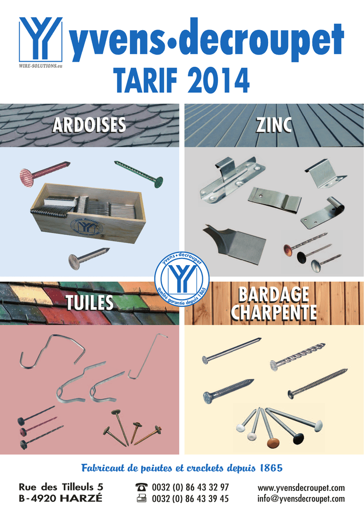 TARIF 2014 WIRE-SOLUTIONS.eu ZINC té decrou pe 18 65 i al qu TUILES ns• ve t y ARDOISES ga is ran tie depu BARDAGE CHARPENTE Fabricant de pointes et crochets depuis 1865 Rue des Tilleuls 5 B - 4920 HARZÉ 0032 (0) 86 43 32 97 0032 (0) 86 43 39 45 www.yvensdecroupet.com [email protected] SOMMAIRE WIRE-SOLUTIONS.eu Conditions générales de vente 3 Conditions tarif 4 CROCHETS D’ARDOISES Palettisation - Conditionnement - Etiquetage Crochets d'ardoises - boîtes de 5 kg Crochets d'ardoises - boîtes à nombre fixe : - Ø 2,7 mm en 500 pièces Ø 3,0 mm en 500 pièces Ø 2,4 mm et 2,7 mm à nombre fixe 5 6 7 8 9 CROCHETS POUR TUILES 10 POINTES - Cuivre - Inox F17 - 430 - Inox 18/10 - 304 - Inox 316 - Galva bio - Acier - Acier ordinaire 12 13 14 16 17 18 20 FIXATIONS POUR FAÎTIÈRES 22 FIXATIONS POUR TOITURES ZINC 24 ACCESSOIRES ET FIXATIONS DIVERSES 25 GRIGNOTEUSES TURBO 29 Formulaire de demande - Crochet hors standard 30 Contacts 32 crampons tempête cuivre rouge, crampons solins zingués, crampons clôture galvanisés, fil acier recuit, feuillard perforé galvanisé, colliers à pointes avec charnières, colliers avec embase à visser, pointes à visser pour colliers à embase, crochets de sécurité homologués, crochets de sécurité traditionnels, œillets de sécurité, arrêts de neige, arrêts de neige à accrocher, barrières anti-pigeons, crapaudines, attaches “S“, tirefonds galva chaud, rondelles galva + joint epdm, tiges filetées avec écrous 2 CONDITIONS GÉNÉRALES DE VENTE WIRE-SOLUTIONS.eu 1. Opposabilité Les marchés et fournitures sont effectués aux conditions générales suivantes sauf dérogation expresse et écrite. L'acheteur reconnaît également la prééminence de nos conditions sur ses éventuelles conditions propres. 2. Prix Nos prix s'entendent ex-usine et taxes non comprises, sauf stipulation contraire. 3. Transport Le transport, même exécuté par nos soins, se fait aux risques et périls de l'acheteur. Il fera l'objet d'une facturation séparée. 4. Livraison - La livraison a lieu au départ de notre usine. - Les délais de livraison ne sont donnés qu'à titre indicatif. Nous n'admettons pas de dommages et intérêts ou annulation de commande pour retard de livraison. - Pour des raisons techniques, nous nous réservons le droit de faire des livraisons partielles ou les quantités demandées avec une tolérance de 10 %. 5. Paiement Toutes nos factures sont payables à l'échéance indiquée. En cas de non-paiement à l'échéance, nous nous réservons le droit de considérer la vente comme résolue de plein droit et sans mise en demeure. Toute somme non payée à l'échéance porte de plein droit et sans mise en demeure, intérêt au taux légal belge majoré de 2 %, avec un taux d'intérêt de 12 % minimum. En cas de non-paiement d'une facture à son échéance, nous nous réservons le droit d'augmenter son montant de 10 % avec minimum 50 € à titre d'indemnité forfaitaire et irréductible, en plus de l'intérêt prévu au paragraphe précédent. Lorsque le crédit de l'acheteur se détériore, nous nous réservons le droit, même après exécution partielle d'un marché, d'exiger de l'acheteur les garanties que nous jugeons convenables en vue de la bonne exécution des engagements pris. Le refus d'y satisfaire nous donne le droit d'annuler tout ou partie du marché. Le vendeur se réserve la propriété des marchandises jusqu'à complet paiement. Les risques sont à charge de l'acheteur. Les acomptes pourront être conservés pour couvrir les pertes éventuelles à la revente. En cas de revente des marchandises, même transformées, appartenant au vendeur, l'acheteur lui cède dès à présent, à titre de gage, toutes les créances résultant de leur revente. 6. Garantie et responsabilité Les fabrications ou exécutions spécifiques ne sont garanties qu'avec les tolérances d'usage. Les réclamations : - en cas de vices cachés ne seront pas reçues si elles ne sont pas précisées, par écrit dans un délai d'un mois à dater de la découverte du vice et au plus tard un an après la livraison. - en cas de vices apparents si elles ne sont pas précisées par écrit dans un délai de huit jours. La preuve des dommages incombera à l'acheteur. Si la réclamation est recevable et fondée, la responsabilité du vendeur reste limitée au prix des marchandises livrées ; Aucun autre dommage, de l'acheteur ou d'un tiers ne fera l'objet d'un dédommagement. 7. Tribunaux En cas de contestation, les Tribunaux de Liège ou les Tribunaux du domicile de l'acheteur, au choix du vendeur, sont seuls compétents. 3 CONDITIONS TARIF WIRE-SOLUTIONS.eu Chers Clients, Nous avons le plaisir de vous adresser notre nouveau tarif 2014 prix bruts. Pour vos conditions particulières, et les remises quantitatives, les données vous sont communiquées en courrier annexe. Tous les prix indiqués s'entendent franco à destination, avec un minimum d'une palette de 150 kg par envoi pour l'étranger et de 100 kg par envoi pour la Belgique, en quantités panachées. En dessous de ces minima, une participation aux frais de port sera facturée, calculée sur base des tarifs de nos transporteurs. Les articles couramment de stock ou à faible délai sont clairement repérés. Les autres marchandises seront fabriquées ou approvisionnées moyennant un délai variable qui vous sera communiqué par A.R.C. Une confirmation reprenant tous les articles de votre commande, la valorisation unitaire et totale ainsi que la date d'expédition vous est faxée dans les 48 heures. Nous insistons sur votre meilleure attention à la vérification de ce document afin d'éviter erreurs et désagréments. Tous les conditionnements BRICO sont disponibles moyennant supplément : - sachets PVC 1 kg 0,50 € le sachet (brut) - boîtes carton 1 kg 0,50 € la boîte (brut) - seaux plastique 1 kg 1,00 € le seau (brut) - seaux plastique 5 kg 2,50 € le seau (brut) Veuillez nous consulter pour plus d’i