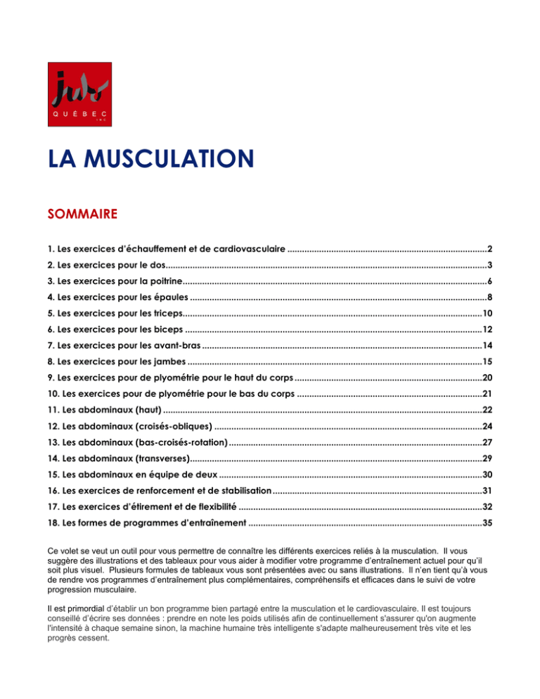 LA MUSCULATION SOMMAIRE 1. Les exercices d’échauffement et de cardiovasculaire ..................................................................................2 2. Les exercices pour le dos....................................................................................................................................3 3. Les exercices pour la poitrine.............................................................................................................................6 4. Les exercices pour les épaules ..........................................................................................................................8 5. Les exercices pour les triceps...........................................................................................................................10 6. Les exercices pour les biceps ..........................................................................................................................12 7. Les exercices pour les avant-bras ...................................................................................................................14 8. Les exercices pour les jambes .........................................................................................................................15 9. Les exercices pour de plyométrie pour le haut du corps .............................................................................20 10. Les exercices pour de plyométrie pour le bas du corps ............................................................................21 11. Les abdominaux (haut) ...................................................................................................................................22 12. Les abdominaux (croisés-obliques) ..............................................................................................................24 13. Les abdominaux (bas-croisés-rotation) ........................................................................................................27 14. Les abdominaux (transverses)........................................................................................................................29 15. Les abdominaux en équipe de deux ............................................................................................................30 16. Les exercices de renforcement et de stabilisation ......................................................................................31 17. Les exercices d’étirement et de flexibilité ....................................................................................................32 18. Les formes de programmes d’entraînement ................................................................................................35 Ce volet se veut un outil pour vous permettre de connaître les différents exercices reliés à la musculation. Il vous suggère des illustrations et des tableaux pour vous aider à modifier votre programme d’entraînement actuel pour qu’il soit plus visuel. Plusieurs formules de tableaux vous sont présentées avec ou sans illustrations. Il n’en tient qu’à vous de rendre vos programmes d’entraînement plus complémentaires, compréhensifs et efficaces dans le suivi de votre progression musculaire. Il est primordial d’établir un bon programme bien partagé entre la musculation et le cardiovasculaire. Il est toujours conseillé d’écrire ses données : prendre en note les poids utilisés afin de continuellement s'assurer qu'on augmente l'intensité à chaque semaine sinon, la machine humaine très intelligente s'adapte malheureusement très vite et les progrès cessent. 1. EXERCICES D’ÉCHAUFFEMENT ET DE CARDIOVASCULAIRE EXERCICES D’ÉCHAUFFEMENT ET DE CARDIOVASCULAIRE JUDO QUÉBEC – LA MUSCULATION 2 2. LES EXERCICES POUR LE DOS EXERCICES POUR LE DOS 3 JUDO QUÉBEC – LA MUSCULATION LES EXERCICES POUR LE DOS (SUITE) EXERCICES POUR LE DOS JUDO QUÉBEC – LA MUSCULATION 4 LES EXERCICES POUR LE DOS (SUITE) EXERCICES POUR LE DOS 5 JUDO QUÉBEC – LA MUSCULATION 3. LES EXERCICES POUR LA POITRINE EXERCICES POUR LA POITRINE JUDO QUÉBEC – LA MUSCULATION 6 LES EXERCICES POUR LA POITRINE (SUITE) EXERCICES POUR LA POITRINE 7 JUDO QUÉBEC – LA MUSCULATION 4. LES EXERCICES POUR LES ÉPAULES EXERCICES POUR LES ÉPAULES JUDO QUÉBEC – LA MUSCULATION 8 LES EXERCICES POUR LES ÉPAULES (SUITE) EXERCICES POUR LES ÉPAULES 9 JUDO QUÉBEC – LA MUSCULATION 5. LES EXERCICES POUR LES TRICEPS EXERCICES POUR LES TRICEPS JUDO QUÉBEC – LA MUSCULATION 10 LES EXERCICES POUR LES TRICEPS (SUITE) EXERCICES POUR LES TRICEPS 11 JUDO QUÉBEC – LA MUSCULATION 6. LES EXERCICES POUR LES BICEPS EXERCICES POUR LES BICEPS JUDO QUÉBEC – LA MUSCULATION 12 LES EXERCICES POUR LES BICEPS EXERCICES POUR LES BICEPS 13 JUDO QUÉBEC – LA MUSCULATION 7. LES EXERCICES POUR LES AVANT-BRAS EXERCICES POUR LES AVANT-BRAS JUDO QUÉBEC – LA MUSCULATION 14 8. LES EXERCICES POUR LES JAMBES EXERCICES POUR LES JAMBES 15 JUDO QUÉBEC – LA MUSCULATION LES EXERCICES POUR LES JAMBES (SUITE) EXERCICES POUR LES JAMBES JUDO QUÉBEC – LA MUSCULATION 16 LES EXERCICES POUR LES JAMBES (SUITE) EXERCICES POUR LES JAMBES 17 JUDO QUÉBEC – LA MUSCULATION LES EXERCICES POUR LES JAMBES (SUITE) EXERCICES POUR LES JAMBES JUDO QUÉBEC – LA MUSCULATION 18 LES EXERCICES POUR LES JAMBES (SUITE) EXERCICES POUR LES JAMBES 19 JUDO QUÉBEC – LA MUSCULATION 9. LES EXERCICES DE PLYOMÉTRIE POUR LE HAUT DU CORPS EXERCICES DE PLYOMÉTRIE POUR LE HAUT DU CORPS JUDO QUÉBEC – LA MUSCULATION 20 10. LES EXERCICES DE PLYOMÉTRIE POUR LE BAS DU CORPS EXERCICES DE PLYOMÉTRIE POUR LE BAS DU CORPS 21 JUDO QUÉBEC – LA MUSCULATION 11. LES ABDOMINAUX (HAUT) ABDOMINAUX (HAUT) JUDO QUÉBEC – LA MUSCULATION 22 LES ABDOMINAUX (HAUT) (SUITE) ABDOMINAUX HAUT 23 JUDO QUÉBEC – LA MUSCULATION 12. LES ABDOMINAUX (CROISÉS-OBLIQUES) ABDOMINAUX (CROISÉS-OBLIQUES) JUDO QUÉBEC – LA MUSCULATION 24 LES ABDOMINAUX (CROISÉS-OBLIQ