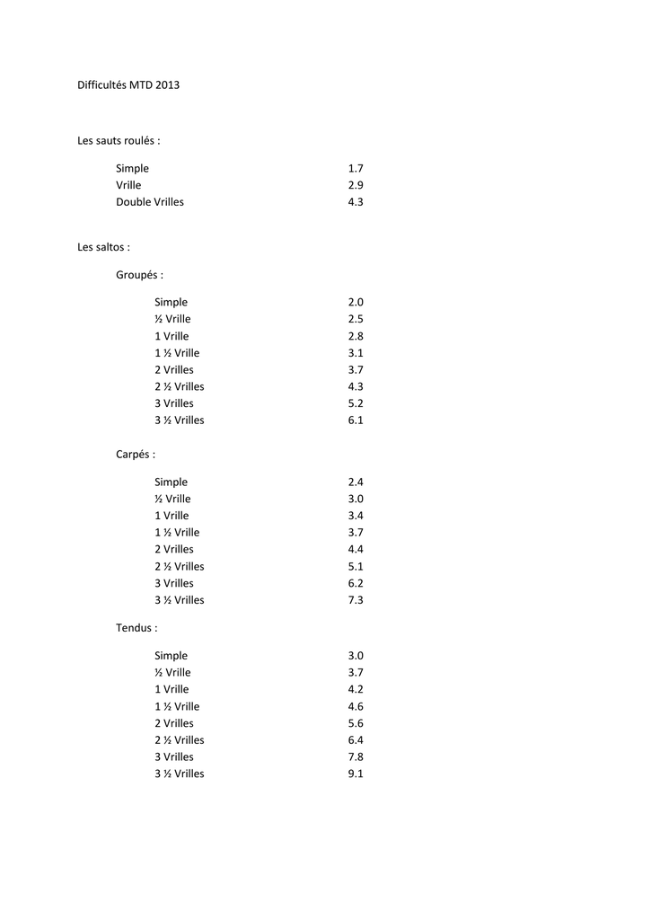Difficultés MTD 2013 Les sauts roulés : Simple Vrille Double Vrilles 1.7 2.9 4.3 Les saltos : Groupés : Simple ½ Vrille 1 Vrille 1 ½ Vrille 2 Vrilles 2 ½ Vrilles 3 Vrilles 3 ½ Vrilles 2.0 2.5 2.8 3.1 3.7 4.3 5.2 6.1 Carpés : Simple ½ Vrille 1 Vrille 1 ½ Vrille 2 Vrilles 2 ½ Vrilles 3 Vrilles 3 ½ Vrilles 2.4 3.0 3.4 3.7 4.4 5.1 6.2 7.3 Tendus : Simple ½ Vrille 1 Vrille 1 ½ Vrille 2 Vrilles 2 ½ Vrilles 3 Vrilles 3 ½ Vrilles 3.0 3.7 4.2 4.6 5.6 6.4 7.8 9.1 Les 1 ½ saltos : Groupés : Simple 1 Vrille 2 Vrilles 3 Vrilles 2.4 3.2 4.1 5.6 Carpés : Simple 1 Vrille 2 Vrilles 3 Vrilles 2.8 3.8 4.9 6.7 Tendus : Simple 1 Vrille 2 Vrilles 3 Vrilles 3.5 4.7 6.1 8.3 Les doubles saltos : Groupés : Simple ½ Vrille 1 Vrille 1 ½ Vrille 2 Vrilles 2 ½ Vrilles 3 Vrilles 3 ½ Vrilles 4.2 4.6 5.4 5.8 6.4 6.8 7.4 8.2 Carpés : Simple ½ Vrille 1 Vrille 1 ½ Vrille 2 Vrilles 2 ½ Vrilles 3 Vrilles 3 ½ Vrilles 5.0 5.5 6.0 6.2 7.1 7.7 8.9 9.8 Tendus : Simple ½ Vrille 1 Vrille 1 ½ Vrille 2 Vrilles 2 ½ Vrilles 3 Vrilles 3 ½ Vrilles 6.3 6.9 7.5 7.8 8.9 9.6 11.1 12.3 Les 2 ½ saltos : Groupés : Simple 1 Vrille 2 Vrilles 3 Vrilles 4.8 5.6 6.5 8.0 Carpés : Simple 1 Vrille 2 Vrilles 3 Vrilles 5.7 6.7 7.7 9.5 Tendus : Simple 1 Vrille 2 Vrilles 3 Vrilles 7.1 8.3 9.7 11.9 Les triples saltos : Groupés : Simple ½ Vrille 1 Vrille 1 ½ Vrille 2 Vrilles 2 ½ Vrilles 3 Vrilles 3 ½ Vrilles 7.6 7.9 8.4 8.5 9.3 9.7 10.8 11.5 Carpés : Simple ½ Vrille 1 Vrille 1 ½ Vrille 2 Vrilles 2 ½ Vrilles 3 Vrilles 3 ½ Vrilles 9.1 9.5 10.1 10.2 11.2 11.6 13.0 13.8 Tendus : Simple ½ Vrille 1 Vrille 1 ½ Vrille 2 Vrilles 2 ½ Vrilles 3 Vrilles 3 ½ Vrilles 11.4 11.8 12.6 12.7 14.0 14.5 16.2 17.2