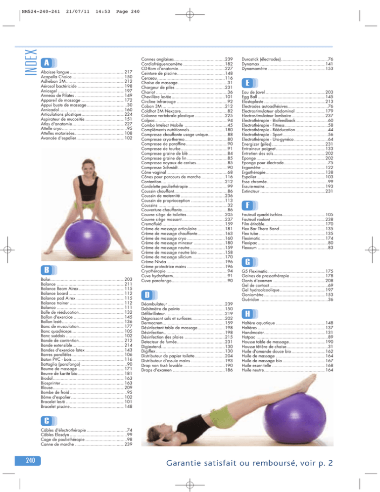 INDEX NM524-240-241 21/07/11 14:53 Page 240 A Abaisse langue ..........................................217 Acapella Choice ........................................150 Adheban 3M.............................................212 Aérosol bactéricide ....................................198 Aniosgel ...................................................197 Anneau de Pilates ......................................149 Appareil de massage .................................172 Appui buste de massage ...............................30 Arnicadol ..................................................160 Articulations plastique.................................224 Aspirateur de mucosités ..............................151 Atlas d'anatomie........................................227 Attelle cryo..................................................95 Attelles motorisées ......................................108 Avancée d'espalier.....................................102 B Balai.........................................................203 Balance ....................................................211 Balance Beam Airex ...................................115 Balance board ...........................................112 Balance pad Airex .....................................115 Balance trainer ..........................................112 Balanco ....................................................111 Balle de rééducation...................................132 Ballon d'exercice .......................................145 Ballon lesté................................................136 Banc de musculation...................................177 Banc quadriceps ........................................105 Banc suédois .............................................102 Bande de contention...................................212 Bande extensible........................................214 Bandes d'exercice latex ..............................143 Barres parallèles ........................................106 Baton PVC - bois ........................................116 Battaglia (parafango) ...................................90 Baume de massage ....................................171 Beurre de karité bio....................................181 Biodal.......................................................163 Biosprinter.................................................163 Blouse.......................................................209 Bombe de froid ............................................95 Bôme d'espalier .........................................102 Bracelet lesté .............................................101 Bracelet piscine..........................................148 Cannes anglaises .......................................239 Cardiofréquencemètre ................................182 CD-Rom d'anatomie....................................227 Ceinture de piscine.....................................148 Cerceau ....................................................116 Chaise de massage ......................................31 Chargeur de piles ......................................231 Chariot .......................................................36 Chevillère lestée.........................................101 Circline infrarouge .......................................92 Coban 3M ................................................212 Coldhot 3M Nexcare....................................82 Colonne vertebrale plastique .......................225 Colpac........................................................94 Combo Intelect Mobile .................................45 Compléments nutritionnels ...........................180 Compresse chauffante usage unique...............88 Compresse cryo-thermo.................................80 Compresse de paraffine................................90 Compresse de tourbe....................................91 Compresse graine de blé ..............................84 Compresse graine de lin ...............................85 Compresse noyaux de cerises........................85 Compresse Schmidt ......................................90 Cône vaginal...............................................68 Cônes pour parcours de marche ..................116 Contention.................................................212 Cordelette pouliethérapie ..............................99 Coussin chauffant.........................................86 Coussin de maternité ..................................236 Coussin de proprioception ..........................113 Coussins .....................................................32 Couverture chauffante...................................86 Couvre siège de toilettes .............................205 Couvre siège massant .................................237 Cremafluid ................................................159 Crème de massage articulaire .....................181 Crème de massage chauffante.....................163 Crème de massage cryo .............................160 Crème de massage minceur ........................180 Crème de massage neutre...........................159 Crème de massage neutre bio .....................158 Crème de massage silicium .........................170 Crème Nivéa.............................................196 Crème protectrice mains .............................196 Cryothérapie ...............................................94 Cuve hydrotherm..........................................91 Cuve parafango...........................................90 D Déambulateur ............................................239 Debitmètre de pointe ..................................150 Défibrillateur..............................................219 Dégraissant sols et surfaces .........................202 Dermacrem................................................159 Désinfectant table de massage.....................198 Désinfection...............................................198 Désinfection des plaies ...............................215 D