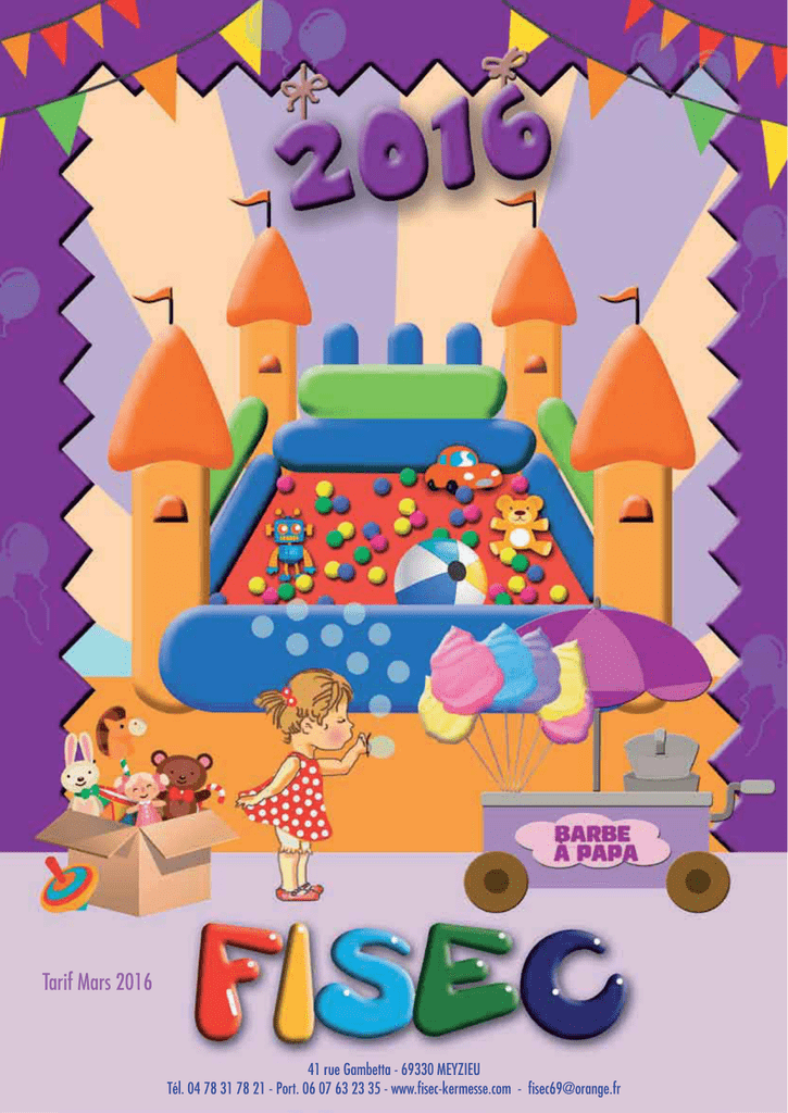 Tarif Mars 2016 Tarif Mars 2015 41 rue Gambetta - 69330 MEYZIEU Tél. 04 78 31 78 21 06 07- 63 23 35 41 rue Port. Gambetta 69330 MEYZIEU www.fisec-kermesse.com [email protected] Tél. 04 78 31 78 21 - Port. 06 07 63 23 35 - www.fisec-kermesse.com - [email protected] Madame, Monsieur, Je suis très heureux de vous présenter la version 2016 de notre catalogue spécial Fête d’écoles. Voici les nouveautés pour cette année : Z Une quarantaine de jouets pour vous offrir un plus grand choix Z De nouveaux packs de tombola clés en mains Toutes les structures, les jeux, les appareils et les jouets peuvent être mis à disposition soit chez FISEC à Meyzieu soit chez COTILLONS DECORSHOP à Pont-Evêque. Il suffit de le préciser lors de vos réservations. Ne tardez pas à les réserver ! Depuis deux ans, nous avons changé notre politique de prix. En effet, il n’y a plus de remises quantitatives mais nous vous proposons des prix attractifs. Nous vous invitons à comparer avec la concurrence et vous pourrez ainsi le vérifier par vous-même. Nous disposons cette année d’une gamme très large de produits à petit prix puisque pas moins de 226 articles sont présents en dessous de 50 centimes pièce. Vous retrouverez l’ensemble de notre catalogue sur notre NOUVEAU site : www.fisec-kermesse.com Je vous prie d’agréer, madame, monsieur, l’expression de mes sincères salutations. Thomas MONHARD 2 /JHH<DM@ Location structures gonflables Location jeux d’attraction Location loto ••••••••••••••••••••••••••••••••••••••••••••••••••••••••••••••••••••••••••••••••••••••••••••••••••••••••••••••••••••••••••••••••••••••••••••••••••••••••••••••••••••••••••••••••••••••••••• ••••••••••••••••••••••••••••••••••••••••••••••••••••••••••••••••••••••••••••••••••••••••••••••••••••••••••••••••••••••••••••••••••••••••••••••••••••••••••••••••••••••••••••••••••••••••••••••••••••••• ••••••••••••••••••••••••••••••••••••••••••••••••••••••••••••••••••••••••••••••••••••••••••••••••••••••••••••••••••••••••••••••••••••••••••••••••••••••••••••••••••••••••••••••••••••••••••••••••••••••••••••••••••••••••••••••••••••••••• Accessoires de loto ••••••••••••••••••••••••••••••••••••••••••••••••••••••••••••••••••••••••••••••••••••••••••••••••••••••••••••••••••••••••••••••••••••••••••••••••••••••••••••••••••••••••••••••••••••••••••••••••••••••••••••••••••••••••• Location matériels alimentaires Fournitures alimentaires Lâcher de ballons •••••••••••••••••••••••••••••••••••••••••••••••••••••••••••••••••••••••••••••••••••••••••••••••••••••••••••••••••••••••••••••••••••••••••••••••••••••••••••••••••••••••••••••••••••••••• •••••••••••••••••••••••••••••••••••••••••••••••••••••••••••••••••••••••••••••••••••••••••••••••••••••••••••••••••••••••••••••••••••••••••••••••••••••••••••••••••••••••••••••••••••••••••••••••••••••••••• •••••••••••••••••••••••••••••••••••••••••••••••••••••••••••••••••••••••••••••••••••••••••••••••••••••••••••••••••••••••••••••••••••••••••••••••••••••••••••••••••••••••••••••••••••••••••••••••••••••••••••••••••••••••••••••• Ballons et accessoires ••••••••••••