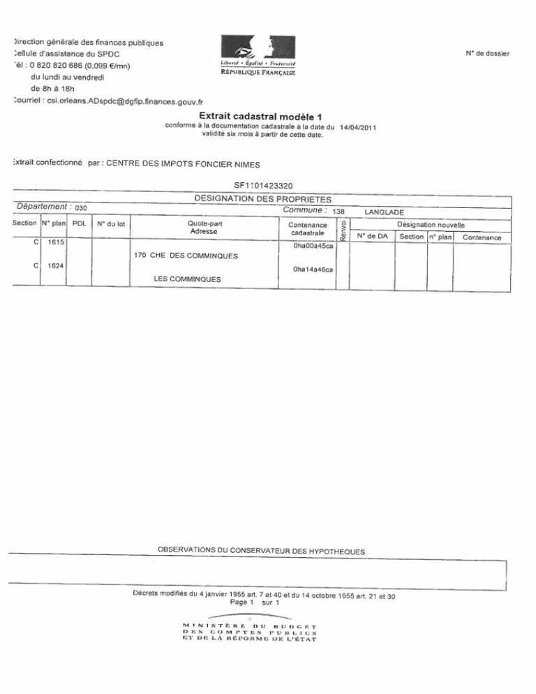 Jirectlon générale des finances publiques .etlule d'assistance du SPDC -él : 0820820686 N° de dossier L-ib,jO/r (0,099 €/mn) • ÉHlJlil; F,.~tl!iïlill FRANÇAISE REPUBUQUE du lundi au vendredi • deBhà18h ~ourriel : [email protected] Extrait cadastral modèle 1 conforme à la documentation cadastrale à la date du 14/04/2011 validité six mois à partir de cette date. ixtrait confectionné par: CENTRE DES IMPOTS FONCIER NIMES SF1101423320 Département: DESIGNATION Section N° plan POL C 1615 C 1624 DES PROPRIETES 030 Commune: N' du lot Quote-part Adresse 138 Contenance cadastrale LANGLADE Désignation nouvelle 0 ::c al 0:: N' de DA OhaOOa45ca 170 CHE DES COMMINQUES Oha14a46ca LES COMMINQUES OBSERVATIONS DU CONSERVATEUR DES HYPOTHEQUES Décrets modifiés du 4 janvier 1955 art. 7 et 40 et du 14 octobre 1955 art. 21 et 30 Page 1 sur 1 MINIS'rt;ItF_ <;. nu o M (> l' l, S HT OB LA lu2f'ORMB D Po S RUDGF.T l' L' I~ I~ r C S DE L'lSTAT Section n' plan Contenance SECOND OPJGINAL PROCES- VERBAL DESCRIPTIF L'AN DEUX MILLE ONZE ET LE VINGT-TROIS MAI DESIGNATION DES BIENS Situé à LANGLADE (30), 57 rue Velat des Cornrninques: une maison d'habitation avec piscine et terrain attenant, le tout cadastré lieu-dit Les Comminques section C n? 1615 pour une contenance de 45 ca et section C n° 1624 pour une contenance de 14 a 46 ca. DESCRIPTION DU BIEN EXTERIEUR On accède à l'immeuble par un portail métallique coulissant situé au n° 57 rue du Velat des Cornrninques (photo 1). Le portail coulissant métallique motorisé s'ouvre sur la parcelle cadastrée n° 1623 qui selon l'acte de vente reçu aux minutes de Maître Thierry GADEL Notaire à SAINT MAMERT DU GARD est le fonds servant des parcelles n° 1624 et 1615 qui bénéficient d'une servitude de passage et d'acqueduc. La parcelle 1623 permet donc d'accéder aux parcelles saisies à pied et en voiture par une allée en pavés autobloquants (photo 2). 3 La parcelle n? 1623 est totalement ouverte sur la parcelle n? 1624 (photo 2 bis). Sur la parcelle n° 1624 sont implantés un abri voiture ainsi qu'une villa (photo 3). L'abri voiture est implanté côté Ouest (photos 4 et 5). Il est bâti en aggloméré avec charpente bois recouverte de tuiles. Un petit abri vélo est adossé à l'abri voiture. 4 .1 La villa est implantée au Sud de la parcelle n° 1624. Devant la villa, le sol est carrelé de pavés autobloquants et en partie herbeux (photo 6). A l'Ouest et à l'Est la parcelle est clôturée par un muret de clôture en aggloméré surélevé d'un grillage. Côté Est le mur de clôture est longé par un petit fossé d'écoulement des eaux pluviales (photo 7). 5 Au Sud de la parcelle le séjour - salon s'ouvre sur une terrasse carrelée en pierre, couverte d'un auvent. La terrasse est équipée d'un barbecue bâti (photos 8 et 9) Quatre marches carrelées descendent sur un jardin pelousé, arboré de plusieurs palmiers et lauriers roses. Côté Est une haie de cyprès est plantée jusqu'au bout de la parcelle (photos 10 et 11). 6 Face au séjour est implantée une piscine réalisée en traditionnel carrelée. La piscine est vide, elle est bordée d'une terrasse et d'un pool house bâti en aggloméré équipé d'un barbecue, d'une cuisine d'été et d'un local technique (photos 12, 13 et 14). Equipement de la cuisine d'été: une cuisinière, un évier, une douche, un wc indépendant et un bar. 7 En limite côté Sud, le jardin est clôturé par un muret en aggloméré surélevé d'un grillage. Une dalle a été réalisée sur laquelle est posé un abri de jardin (photo 15). La parcelle 1615 Au Sud n'est pas clôturée. Elle est recouverte d'herbe haute. INTERIEUR La villa est élevée de deux étages sur rez-de-chaussée. Elle est d'une superficie de 189.44 m2 selon le certificat de surface «LOI CARREZ» dressé par la société AGENDA L'EXPERTISE IMMOBILIERE. La maison est construite en aggloméré. L'enduit est de couleur beige. Il est noirci sur toute sa surface. On accède à la porte d'entrée de la villa par un escalier de six marches (photo 16). 8 REZ DE CHAUSSEE Le hall carrelé dessert un escalier montant à l'étage, un séjour et une cuisine (photo 17). un escalier descendant d'un demi-étage, Les murs du dégagement sont enduits de couleur blanche, le plafond est également enduit. A gauche en rentrant, je relève la présence d'un placard fermé par deux portes coulissantes. Une porte vitrée s'ouvre à gauche sur une cuisine: Sol carrelé de couleur beige. Les murs de la cuisine sont en partie faïencés à mi-hauteur et enduits de couleur gris clair en partie supérieure. Le plafond est également enduit de couleur blanche. Je relève la présence d'un dégât des eaux au plafond. Une fenêtre en aluminium coulissante s'ouvre sur le côté Nord, la fenêtre est protégée par une grille métallique extérieure. La cuisine est équipée d'éléments bas avec évier deux bacs, plaque de cuisson à induction, une friteuse GAGGENAU, un grill GAGGENAU et un four de marque DE DIETRICH. Une niche bâtie abrite le réfrigérateur et le congélateur (photo 18). 9 A droite en rentrant dans la cuisine: marbre. un coin repas de deux-trois places avec plateau en En bout de la cuisine une cloison en bois sépare la cuisine d'une petite pièce s'ouvrant directement sur la terrasse côté piscine. Cette pièce est fermée par une porte en pin (photo 19). Le sol est carrelé de manière identique tout comme les murs et le plafond. Une baie vitrée coulissante deux vantaux en aluminium équipée d'un bloc volet roulant en aluminium. Face à la porte d'entrée de la maison s'étend un séjour - salon. Le séjour est ajouré par deux baies vitrées en aluminium, équipées de volets roulants électriques (photos 20 et 21). Le sol est carrelé de couleur beige, les murs sont enduits de couleur saumon et le plafond est enduit de couleur blanche. La pièce est chauffée par un poêle à bois et par des convecteurs électriques. 10 Côté Est l