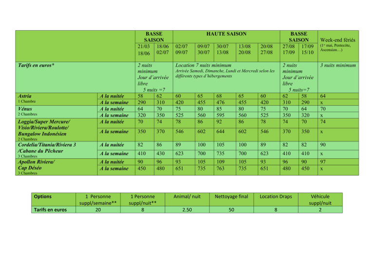BASSE SAISON 21/03 18/06 18/06 02/07 Tarifs en euros* Astria 1 Chambre Vénus 2 Chambres Loggia/Super Mercure/ Visio/Riviera/Roulotte/ Bungalow Indonésien HAUTE SAISON 02/07 09/07 09/07 30/07 30/07 13/08 13/08 20/08 Location 7 nuits minimum A la nuitée A la semaine A la nuitée A la semaine A la nuitée 2 nuits minimum Jour d’arrivée libre 5 nuits =7 58 62 290 310 64 70 320 350 70 74 60 420 75 525 78 65 455 80 560 86 68 476 85 595 92 65 455 80 560 86 A la semaine 350 370 546 602 644 A la nuitée 82 86 89 100 A la semaine 410 430 623 A la nuitée A la semaine 90 450 96 480 93 651 BASSE SAISON 27/08 17/09 17/09 15/10 20/08 27/08 Weekend fériés (1er mai, Pentecôte, Ascension…) 3 nuits minimum 60 420 75 525 78 2 nuits minimum Jour d’arrivée libre 5 nuits=7 62 58 310 290 70 64 350 320 74 70 602 546 370 350 x 105 100 89 82 82 90 700 735 700 623 410 410 x 105 735 109 763 105 735 93 651 96 480 90 450 97 x Arrivée Samedi, Dimanche, Lundi et Mercredi selon les différents types d’hébergements 64 x 70 x 74 2 Chambres Cordelia/Titania/Riviera 3 /Cabane du Pêcheur 3 Chambres Apollon Riviera/ Cap Déséo 3 Chambres Options Tarifs en euros 1 Personne suppl/semaine** 20 1 Personne suppl/nuit** 8 Animal/ nuit Nettoyage final Location Draps 2.50 50 8 Véhicule suppl/nuit 2