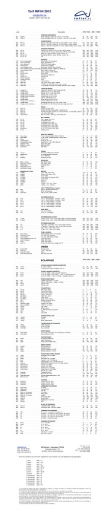 Tarif INFINI 2012 [email protected] GSM: 0475 46 38 30 code Description HTVA TVAC 1 SEM. 1 MOIS 001 002 CONF 1 CONF 2 KITS SON CONFERENCE Ampli-mélangeur 120w, CD, 1 micro, 2 h-p, pieds Ampli-mélangeur 200w, CD, 4 micros, 1 micro HF, 2 h-p, pieds 50 90 60 109 200 360 425 765 003 004 005 KIT D-J KIT D-J KIT D-J KITS SON DISCO Mix DJ, 2 CDJ 200, 2 Nexo PS 10, ampli 2x200 w, micro, casque Mix DJ, 2 CDJ 200, 2 Nexo PS 15, ampli 2x500 w, micro, casque Mix DJ, 2 CDJ 200, 4 Nexo PS 15, 2 subs, amplis 4x800w, micro, casque 90 110 165 109 133 200 360 440 660 765 935 1400 KITS SON CONCERTS Yamaha 01V, micros, 4 PS 15, 4 PS 10 (mon), amplis Yamaha LS9-16, micros, 4 PS 15+sub, 4 PS 15 (mon), amplis Midas 24 + racks, 2 Alpha E, 6 PS 15 (mon) / 4c Soundcraft MH340 + racks, MH340, 12 ps15 / 8c fhe 200 300 400 700 400 242 370 484 850 484 800 900 1600 2800 1600 1700 2100 3400 5000 3400 006 KIT 12 007 KIT 16 008 KIT 24 009 KIT 40 / 40 010 KIT 32 / 32 100 101 102 103 104 105 106 108 109 110 112 116 119 120 140 141 143 micro condensateur micro dynamique micro spéciaux micros piano micro émetteur main micro émetteur cravate ou serre-tête micro emetteur main DI box DI box stereo Platine Lecteur CD Lecteur cassette Lecteur Mini-disc tuner FM disco-bar disco-bar disco-bar SOURCES AKG, Crown, AT, Sennheiser Shure, Sennheiser, E-V PZM, PCC, flexible pupitre Shoeps blm3, Yamaiko Sennheiser 100/300, Shure SC4/58 Sennheiser 100/300 + MKE40 ou MIPRO 55 Shure UR4D + tete sm 58 active / passive ; BSS, RADIAL active APEX Technics SL 1200/1210 Yamaha, JB Yamaha Sony Yamaha, Sony 2 SL 1200, mix DJ, micro, casque 2 CD Pioneer CDJ 200, mix DJ, micro, casque 2 CD Pioneer CDJ 2000, mix Pioneer MDJ 800, micro, casque 10 6 10 20 30 41 50 2,5 4 12,5 10 10 10 8 41 41 125 13 8 13 25 37 50 60 3 5 15 13 13 13 10 50 50 150 30 18 30 60 90 123 200 8 12 38 30 30 30 24 123 123 380 70 42 70 140 210 287 350 18 28 88 70 70 70 56 287 287 880 151 161 162 163 164 165 167 168 169 170 mixage DJ mixage scene mixage scene mixage scene numerique mixage scene numerique mixage scene mixage scene mixage scene numerique mixage scene mixage scene numerique TABLE DE MIXAGE Dateq styx, Rodec mx 180, Pioneer djm 800 Mackie 12+2/2, 4 aux, effet interne Mackie 16+2/2, 4 aux, effet interne Yamaha 01V ; 12+2/2, 4 aux Yamaha LS9 16; 16 in, 8 out A&H GL 3300 32/8/2, 8 aux Midas venice 24+4/4/2, 6 aux Yamaha LS9 32; 32 in, 16 out Soundcraft MH3 40; 40 in, 8 gr, 8 vca, 12 aux Soundcraft VI 4: 48in, 32 out, local rack, stage rack, multi 16 25 41 50 75 82 92 150 300 750 20 30 50 62 90 100 112 180 370 900 48 75 123 150 225 246 276 450 900 2250 112 175 287 350 510 574 644 1050 2100 5000 172 173 174 176 178 Rack 16 Rack 24 Rack 40 Rack EQ rack sources RACKS PCM 70, 6 comp. DBX M 2000, M 3000, 8 comp DBX, 4 gate Drawmer PCM 96, SPX 990, M 2000, D2, 8 comp Drawmer, 2 comp DBX, 6 gate Dr. 3 eq 2x30 ; BSS, Altair soit: CD jb 300, + MD sony, soit 2 CD jb 300 20 82 100 50 20 25 100 120 62 25 60 250 300 150 60 140 600 700 350 140 180 181 182 183 184 185 186 188 8 / 10 20 / 30 32 / 40 40 / 50 48 / 60 48 / 80 ethersound 4 / 50 MULTIPAIRES 8 à 12 paires, 10 à 15 m 16+4 paires, 30 m 24+8 paires, 40 m, 220v 32+8 paires, 50m, 220v, dmx 40+8 paires, 60 m, 220v, DMX 40+8 paires, 80 m, 220v, DMX 2x cat 5, 12 p, 80m, 220v, DMX 4 paires, 50 m 8 10 20 25 30 40 30 8 10 13 25 30 37 52 37 10 24 30 60 75 90 120 90 24 56 70 140 175 270 280 270 56 189 190 192 194 195 197 198 199 Multi-effets Multi-effets Delay Compresseurs Compresseurs, gate Egaliseur 2x30 Egaliseur + delay processeur EFFETS ET INSERTS TC el. M 3000, M 2000, PCM 70, PCM 96 TC el. M one, Yamaha SPX 990, Lexicon MPX 1 TC el. D two AVALON; 737, 747 Drawmer 241 – 201, DBX, BSS 901 Apex, Altair, BSS Behringer 8000 DBX 4800 37 30 20 50 16 20 20 82 45 37 25 60 20 25 25 100 111 90 60 150 48 60 60 250 260 210 140 350 112 140 140 600 200 202 210 217 casque casque actif in-ear emetteur DIVERS Sennheiser HD25, Beyer DT100 A T (avec reducteur de bruits) Shure PSM 600 Emetteur FM 20w 6 12 30 30 8 16 37 37 18 36 90 90 42 84 270 270 220 221 222 224 225 Base + casque Belt-pack + casque Walkie-talkie lampe flash et H-P alimentation réseau INTERCOM ASL, Metro, Altair ASL, Metro, Altair Kenwood 3310 Metro Infini 20 8 10 4 4 25 10 13 5 5 60 24 30 12 12 140 42 70 28 28 242 244 246 247 248 249 250 254 255 puissance en 4 ohms 2x300w 2x500w 2x800w 2x1300w 2x1800w 4x900w 4x2500w 120w 200w AMPLIS Crown 600, Chevin 500 Crown 1200, Chevin 1000 Crown 2400 Crown 3600, Lab gruppen 4000 Crown 5000 Nexo 4x1 Nexo 4x4 1x120w + CD + mix : Show 1x200w + mix : Samson 12,5 16 20 25 30 30 50 20 20 15 20 25 30 37 37 60 25 25 30 48 60 75 90 90 150 60 60 88 112 140 175 270 270 350 140 140 260 262 264 60w 150w 250w amp HAUT-PARLEURS prix a la piece 60w (5’’+tweeter) DAS factor 5 BOSE 402 (outdoor) JBL Eon 510: in MIC et LINE 5 12,5 20 6 15 25 15 30 60 35 88 140 278 279 281 282 283 284 ps 8 ps 8 ps 10 ps 10 ps 15 ps 15 SYSTEMES NEXO PS 2 ps 8 + ampli 2x200w + controller + pieds 4 ps 8 + ampli 2x300w + controller + pieds 2 ps 10 + ampli 2x300w + controller 4 ps 10 + ampli 2x500w + controller 2 ps 15 + ampli 2x500w + controller 4 ps 15 + ampli 2x800w + controller 40 62 40 62 62 92 50 75 50 75 75 112 120 186 120 186 186 276 280 434 280 434 434 644 286 288 sub sub SUBS NEXO 2 rs 15 ( 2x1500w ) 2x CD 18 ( 2x 2000w ) 40 80 50 100 120 240 280 560 291 292 1 paire 2 paires SYSTEMES NEXO ALPHA E 2 bass + 2 top + rack : Crown 5000+3600+controller (2x2500w) 4 bass + 4 top + rack : Crown 5000+3600+controller (2x4000w) 200 300 250 363 600 900 1400 2100 295 296 298 299 s8 s8 s 12 s 12 SYSTEMES NEXO GEO 6 geo 805 + 2 geo 830 + rack : Crown 5000+controller 10 geo 805 + 2 geo 830 + rack : Crown 5000+controller 6 geo 1210 + 2 geo 1230 + amps 10 geo 1210 + 2 geo 1230 + amps 200 300 400 600 250 363 500 750 600 900 1200 1800 1400 2100 2800 4200 300 302 303 310 312 320 350 sono voiture projecteur de son h-p à pavillon ampli-mélangeur-lecteur CD ampli-melangeur ampli rack P A PU