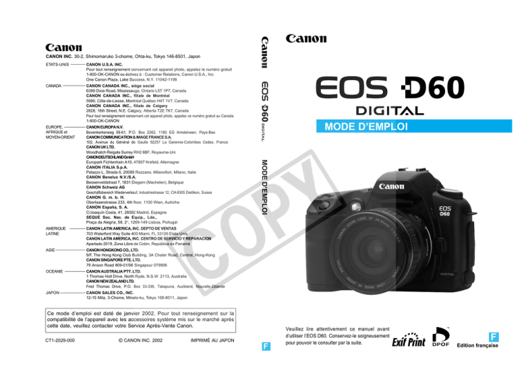 CANON INC. 30-2, Shimomaruko 3-chome, Ohta-ku, Tokyo 146-8501, Japon CANON U.S.A. INC. Pour tout renseignement concernant cet appareil photo, appelez le numéro gratuit 1-800-OK-CANON ou écrivez à : Customer Relations, Canon U.S.A., Inc. One Canon Plaza, Lake Success, N.Y. 11042-1198 CANADA CANON CANADA INC., siège social 6390 Dixie Road, Mississauga, Ontario L5T 1P7, Canada CANON CANADA INC., filiale de Montréal 5990, Côte-de-Liesse, Montréal Québec H4T 1V7, Canada CANON CANADA INC., filiale de Calgary 2828, 16th Street, N.E. Calgary, Alberta T2E 7K7, Canada Pour tout renseignement concernant cet appareil photo, appelez ce numéro gratuit au Canada 1-800-OK-CANON EUROPE, AFRIQUE et MOYEN-ORIENT CANON EUROPA N.V. Bovenkerkerweg 59-61, P.O. Box 2262, 1180 EG Amstelveen, Pays-Bas CANON COMMUNICATION & IMAGE FRANCE S.A. 102, Avenue du Général de Gaulle 92257 La Garenne-Colombes Cedex, France CANON UK LTD. Woodhatch Reigate Surrey RH2 8BF, Royaume-Uni CANONDEUTSCHLANDGmbH Europark Fichtenhain A10, 47807 Krefeld, Allemagne CANON ITALIA S.p.A. Palazzo L, Strada 6, 20089 Rozzano, Milanofiori, Milano, Italie CANON Benelux N.V./S.A. Bessenveldstraat 7, 1831 Diegem (Machelen), Belgique CANON Schweiz AG Geschäftsbereich Wiederverkauf, Industriestrasse 12, CH-8305 Dietlikon, Suisse CANON G. m. b. H. Oberlaaerstrasse 233, 4th floor, 1100 Wien, Autriche CANON España, S. A. C/Joaquín Costa, 41, 28002 Madrid, Espagne SEQUE Soc. Nac. de Equip., Lda., Praça da Alegria, 58, 2°, 1269-149 Lisboa, Portugal AMERIQUE LATINE CANON LATIN AMERICA, INC. DEPTO DE VENTAS 703 Waterford Way Suite 400 Miami, FL 33126 Etats-Unis CANON LATIN AMERICA, INC. CENTRO DE SERVICIO Y REPARACION Apartado 2019, Zona Libre de Colón, República de Panamá ASIE CANON HONGKONG CO., LTD. 9/F, The Hong Kong Club Building, 3A Chater Road, Central, Hong-Kong CANON SINGAPORE PTE. LTD. 79 Anson Road #09-01/06 Singapour 079906 OCEANIE CANON AUSTRALIA PTY. LTD. 1 Thomas Holt Drive, North Ryde, N.S.W. 2113, Australie CANON NEW ZEALAND LTD. Fred Thomas Drive, P.O. Box 33-336, Takapuna, Auckland, Nouvelle-Zélande JAPON CANON SALES CO., INC. 12-15 Mita, 3-Chome, Minato-ku, Tokyo 108-8011, Japon MODE D’EMPLOI MODE D’EMPLOI ETATS-UNIS Ce mode d’emploi est daté de janvier 2002. Pour tout renseignement sur la compatibilité de l’appareil avec les accessoires système mis sur le marché après cette date, veuillez contacter votre Service Après-Vente Canon. CT1-2029-000 © CANON INC. 2002 IMPRIMÉ AU JAPON F Veuillez lire attentivement ce manuel avant d’utiliser l’EOS D60. Conservez-le soigneusement pour pouvoir le consulter par la suite. F Edition française Index Nous vous remercions d’avoir choisi un appareil Canon EOS L’EOS D60 est un appareil numérique reflex autofocus mono-objectif hautes performances muni d’un capteur CMOS ultra-sensible d’environ 6,3 millions de pixels. Cet appareil, compatible avec les objectifs Canon EF, est conçu pour une prise de vues simple et rapide. Il dispose de nombreuses fonctions couvrant toutes les conditions de prise de vues, de la prise de vues 100 % automatique à la photographie professionnelle. Il utilise des cartes CompactFlash (CF Type I et II) comme support d’enregistrement. Veuillez lire attentivement ce mode d’emploi avant d’utiliser votre appareil, pour vous familiariser avec son fonctionnement. ∗ Nous vous recommandons d’utiliser des cartes CF de Canon. Interférences radio et télévision (Déclaration VCCI) Cet appareil est un appareil de technologie informatique qui ne dépasse pas les limites de la Classe B relatives aux interférences électromagnétiques (EMI) conformément au Conseil japonais de contrôle volontaire des interférences des appareils de technologie informatique (VCCI). Cet appareil peut malgré tout encore provoquer des interférences avec la réception d’une radio ou d’un téléviseur s’il est placé à proximité de ces appareils. Pour savoir comment éviter les interférences de réception des autres appareils, reportez-vous à ce mode d’emploi. Prises d’essai Avant de prendre des photos importantes, nous vous recommandons instamment de procéder à quelques essais. Vérifiez que les images s’enregistrent correctement sur la carte CF. Canon ne peut être tenu responsable des pertes de données et autres désagréments résultant d’une défectuosité de l’appareil ou de la carte CF faisant que les images ne s’enregistrent pas ou que leur lecture soit impossible sur un ordinateur. Mise en garde contre la violation des droits d’auteur La loi régissant les droits d’auteur de votre pays peut interdire l’utilisation des images de certaines personnes et de certains sujets à des fins autres que strictement personnelles. Elle peut également interdire la prise de vues de représentations ou d’expositions publiques. Cet appareil numérique prend en charge Exif 2.2 (ou « Exif Print »). ExifPrint est une norme permettant d’améliorer la communication entre les appareils photo numériques et les imprimantes. Lorsque vous branchez l’appareil photo sur une imprimante compatible Exif Print, les données d’image enregistrées au moment de la prise de vues sont utilisées pour produire des impressions de très haute qualité. N NTSC ............................................ 112, 121 Numéros de fichier ........................ 114, 129 Numérotation en continu ....................... 114 O Objectif .................................................... 27 P PAL ................................................ 112, 121 Phénomène des yeux rouges ............... 130 Photographie au flash ....................... 39, 85 Pose longue ............................................ 83 Précautions d’utilisation .......................... 10 Priorité ouverture .................................... 72 Prise de vues en rafale ........................... 63 Prise de vues entièrement automatique . 38 Prise de vues multiflas