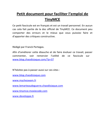 Petit document pour faciliter l’emploi de TinyMCE Ce petit fascicule est en français et est un travail personnel. En aucun cas cela fait partie de la doc officiel de TinyMCE. Ce document peu comporter des erreurs et le mieux que vous puissiez faire et d’apporter des critiques constructive. Rédigé par Franck Pertegas. Afin d’améliorer cette ébauche et de faire évoluer ce travail, passer commenter, voir remercier l’utilité de ce fascicule sur www.blog.chaodisiaque.com/?p=37 N’hésitez pas à passer aussi sur ces sites : www.blog.chaodisiaque.com www.mychezwam.fr www.lemarteaudeguerre.chaodisiaque.com www.tinymce.moxiecode.com www.developpe.fr