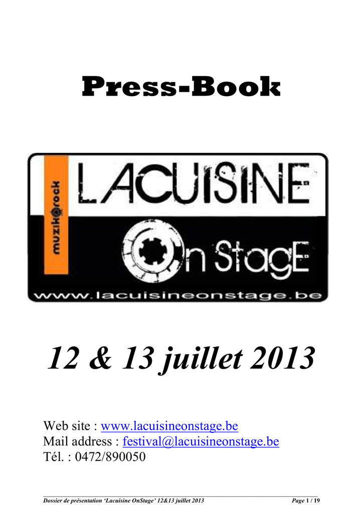 Press-Book 12 & 13 juillet 2013 Web site : www.lacuisineonstage.be Mail address : [email protected] Tél. : 0472/890050 ___________________________________________________________________________ Dossier de présentation ‘Lacuisine OnStage’ 12&13 juillet 2013 Page 1 / 19 ___________________________________________________________________________ Dossier de présentation ‘Lacuisine OnStage’ 12&13 juillet 2013 Page 2 / 19 (1 ) Le festival : origine et évolution Le Syndicat d'Initiative Lacuisine-Martué Villégiature A.s.b.l., au travers de son comité musique, organise les 12&13 juillet prochain la 5ème édition de son festival rock 'Lacuisine On Stage'. A l'origine du projet, une poignée d'amateurs de musique soucieux de redonner un élan à la fête du village. Les trois premières éditions se sont déroulées sous la forme de soirées concerts durant lesquelles se sont produits des groupes régionaux mais également quelques formations belges reconnues. En 2012, les organisateurs avaient clairement revu leurs ambitions à la hausse et la traditionnelle soirée concert s'était muée en un véritable festival s'étalant sur deux jours, le vendredi consacré aux groupes Tribute/Cover : Muse (Hysteria), Red Hot Chili Peppers (Arcadium), The Cure (Curiosity), Nirvana (Aberdeen),.... et le samedi avec la programmation de groupes de compositions régionaux (Hot Men Stuckie, Whatever...), nationaux (W.A.N.E.) et internationaux (The Aerial, Transgunner, My Dark Project pour la France et Kill The Young, Angleterre). Le festival 2012 ayant séduit tant les festivaliers que les artistes, la formule sera reconduite pour 2013 mais cette fois, les deux soirées seront consacrées aux groupes de composition. La soirée du vendredi commencera dès 18 :30 avec Noisy Pride, jeune groupe liégeois très prometteur, sélectionné pour la finale nationale du concours Imagine, organisé par les Jeunesses Musicales de Belgique pour les moins de 20 ans. The1984 prendra le relais à 20:30 avec un répertoire rock puissant et groovy qui met en avant l'énergie du groupe. Ensuite, place au rock français dans sa plus pure tradition avec le groupe Ardennais Sens Unique, qui accorde une large place aux textes. Changement de style avec le groupe Jane Doe and The Black Bourgeoises ; ce projet est né à l’initiative du batteur des Von Durden et d’autres musiciens belge issus de formations reconnues. Il se présente dans une composition inédite, 4 musiciens, une chanteuse et deux choristes. Jeune groupe formé il y a un an à peine, ce groupe ne laisse pas indifférent et se présente comme une relève pour le rock belge. Ensuite, la soirée s’orientera vers des sons plus électro-rock, tout d’abord avec le groupe The Waow. Reconnus pour des prestations scéniques à l’énergie débordante, ce groupe a connu une véritable explosion ces deux dernières années et séduit un public jeune. Enfin la soirée du vendredi se cloturera aux sons electro-rock du trio liégeois The High Dolls, qui viendra défendre son nouvel EP. ___________________________________________________________________________ Dossier de présentation ‘Lacuisine OnStage’ 12&13 juillet 2013 Page 3 / 19 La journée du samedi débutera dès 16:30 avec les régionaux de l'étape, Barbus, qui proposent un set instrumental stoner/classic rock. Deux groupes de la scène régionale prendront ensuite le relais. Tout d'abord SummerSlam; ce jeune groupe d'Arlon est en pleine ascension. Repérés pour leur potentiel artistique, ils ont été sélectionnés par la province du Luxembourg pour bénéficier d'un programme d'accompagnement pour groupes émergents (Nationale 5). Ensuite, le ton se durcira quelque peu avec le Néo métal des arlonais de Inimikall. Ce groupe dégage une énergie communicative et est d'ailleurs suivi par de nombreux fans. Au rayon des découvertes, on épinglera le duo nanceén Hoboken Division, sur scène à 20 :20, mélange de blues et de rock garage. A 21:40, 14weeks proposera un set electro-rock très énergique; ils viendront défendre leur nouvel EP Past/Present/Now. A 23 :00, le festival accueille une valeur sure de la scène belge. Dans la lignée de Triggerfinger ou autre Black Box Revelation, Elvis Black Stars est présent depuis quelques années sur les scènes belge mais également avec quelques concerts à l’étranger. Ils reviennent d’ailleurs d’une mini tournée dans quelques grandes salles françaises en première partie de BB Brunes. Enfin en cloture du festival, les anglais de Mike TV, considéré comme l'un des meilleurs groupes de Pop-Punk d'Outre-Mache. Ambiance assurée avec ce groupe, l’humour déjeanté dans la plus pure tradition britannique. Un programme ambitieux donc pour une organisation qui vise plusieurs objectifs : - Réussir le pari de proposer une affiche de qualité dans une zone culturellement défavorisée dans le domaine des musiques amplifiées. Faire de ce festival une vitrine pour notre région et en particulier pour notre village riche d’un fier passé touristique. Depuis l'année dernière, le festival a pris ses quartiers sur les hauteurs de village, en direction du village de Martué, dans un cadre verdoyant, avec en toile de fond la Cuesta de Florenville. Le festival proposera en outre cette année un camping pour les festivaliers. Sans oublier bien entendu, la traditionnelle restauration pizza feu de bois. Rendez-vous donc les 12 et 13 juillet prochain à Lacuisine pour un festival qui propose une programmation variée visant un public le plus large possible, de belles découvertes et pour lequel les organisateurs misent énormément sur la convivialité. ___________________________________________________________________________ Dossier de présentation ‘Lacuisine OnStage’ 12&13 juillet 2013 Page 4 / 19 (2 ) Le line-up détaillé Vendredi 12 juillet Noisy Pride (B – Liège) - 18:30 Tout commença quand un des guitaristes de ce jeune groupe liégeo