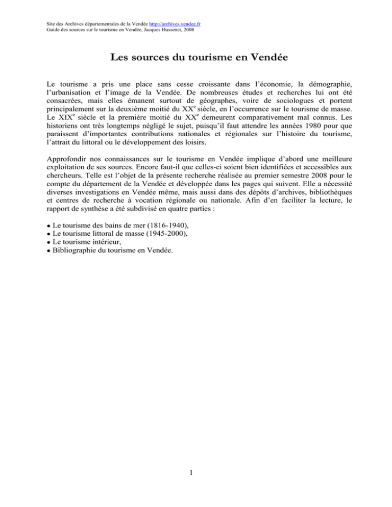 Site des Archives départementales de la Vendée http://archives.vendee.fr Guide des sources sur le tourisme en Vendée, Jacques Hussenet, 2008 Les sources du tourisme en Vendée Le tourisme a pris une place sans cesse croissante dans l’économie, la démographie, l’urbanisation et l’image de la Vendée. De nombreuses études et recherches lui ont été consacrées, mais elles émanent surtout de géographes, voire de sociologues et portent principalement sur la deuxième moitié du XXe siècle, en l’occurrence sur le tourisme de masse. Le XIXe siècle et la première moitié du XXe demeurent comparativement mal connus. Les historiens ont très longtemps négligé le sujet, puisqu’il faut attendre les années 1980 pour que paraissent d’importantes contributions nationales et régionales sur l’histoire du tourisme, l’attrait du littoral ou le développement des loisirs. Approfondir nos connaissances sur le tourisme en Vendée implique d’abord une meilleure exploitation de ses sources. Encore faut-il que celles-ci soient bien identifiées et accessibles aux chercheurs. Telle est l’objet de la présente recherche réalisée au premier semestre 2008 pour le compte du département de la Vendée et développée dans les pages qui suivent. Elle a nécessité diverses investigations en Vendée même, mais aussi dans des dépôts d’archives, bibliothèques et centres de recherche à vocation régionale ou nationale. Afin d’en faciliter la lecture, le rapport de synthèse a été subdivisé en quatre parties : ● Le tourisme des bains de mer (1816-1940), ● Le tourisme littoral de masse (1945-2000), ● Le tourisme intérieur, ● Bibliographie du tourisme en Vendée. 1 Site des Archives départementales de la Vendée http://archives.vendee.fr Guide des sources sur le tourisme en Vendée, Jacques Hussenet, 2008 1 – Le tourisme des “bains de mer” (1816-1940) La mode des bains de mer, importée de Grande Bretagne, fait son apparition aux Sables d’Olonne vers 1816. Elle est d’abord limitée à quelques dizaines de personnes, puis en concerne un gros millier entre 1850 et 1860. L’ouverture de voies de chemins de fer à partir des années 1860 élargit l’offre touristique à d’autres secteurs du littoral : Saint-Gilles, Noirmoutier, La Tranche-sur-Mer, Saint-Jean-de-Monts, Croix-de-Vie. Réservé aux classes privilégiées, ce premier âge du tourisme atteint son apogée à la Belle Epoque et repose sur quelques centres d’intérêt : la plage, les promenades, les casinos, les fêtes. L’accueil se fait en hôtel, chez l’habitant et dans des villas ou “chalets”. L’entre-deux-guerres prolonge cette période, tout en y introduisant des changements significatifs. Ainsi, l’automobile et les autocars commencent à concurrencer le chemin de fer. Les classes moyennes font leur apparition et – plus timidement – les classes populaires (congés payés). Le littoral est également fréquenté par de nouvelles catégories d’estivants : les campeurs et les enfants des colonies de vacances. Certains d’entre eux prennent pied à l’Ile d’Yeu. A la veille de la Deuxième Guerre mondiale, la côte vendéenne accueille entre 100 000 et 200 000 touristes répartis sur une douzaine de stations. C’est logiquement aux Archives départementales de la Vendée et dans certaines Archives communales que se trouvent les sources principales de cette longue période. Quelques dépôts extérieurs ont été explorés, mais sur des segments particuliers. 1.1 – Les Archives départementales de la Vendée ● Administration générale – 4 M 107-110 : Police des jeux, dont casinos (1866-1940). – 4 M 152-153 : Statistiques annuelles d’estivants aux Sables d’Olonne établies par le commissariat de police (1880-1894). – 4 M 201-202 : Produits des jeux dans les casinos des Sables d’Olonne (1894-1910). – 4 M 219 : Etats numériques des estivants aux Sables d’Olonne dressés par le commissariat de police (1937-1939). – 6 M 1099 : Enquêtes sur la fréquentation touristique en Vendée, à la demande des services de la Jeunesse et des Sports (1937-1938). – 7 M 209-210 : Amodiations de cabines de bains dans diverses communes du littoral vendéen (1925-1940). – 7 M 213 : Autorisations de campings saisonniers accordées par l’Etat dans les forêts dunaires (1935-1939). – 7 M 215 : Concessions accordées à des particuliers et à diverses colonies de vacances en forêts et dunes domaniales (1924-1940). – 8 M 420 : Enquêtes sur les hôtels de tourisme de la Vendée (1937-1939). La série M regroupe la documentation la plus fournie sur les premiers âges du tourisme. On notera cependant qu’elle fait la part belle aux Sables d’Olonne et qu’elle ne contient rien sur la première moitié du XIXe siècle. ● Affaires communales – 1 Ø 487 : Travaux dans le château de Noirmoutier (1856-1920). – 1 Ø 614 : Les Sables d’Olonne : bois de La Rudelière (1897-1914) et hippodrome de La Lande (1912-1921). 2 Site des Archives départementales de la Vendée http://archives.vendee.fr Guide des sources sur le tourisme en Vendée, Jacques Hussenet, 2008 – 1 Ø 616 : Les Sables d’Olonne : bains de mer et machines à baigner (1823-1904). Casinos (1836-1904). – 1 Ø 706 : Bains de mer à Saint-Jean-de-Monts (1898). – 1 Ø 894 : Remise en état de la plage de Croix-de-Vie (1936). – 1 Ø 951 : Protection du littoral à Longeville-sur-Mer (1930-1933). – 1 Ø 1029 : Champ de courses des Sables d’Olonne (1900-1922). – 1 Ø 1126 : Château de Talmont (1920). – 1 Ø 1345 : Cabines sur le remblai de Saint-Gilles-sur-Vie (1938). – 3 Ø 3148 : Réalisation de lotissements aux Sables d’Olonne, à Saint-Gilles et Croix-de-Vie (1927-1942). Ce fonds disparate a l’avantage de livrer des informations sur les premiers bains de mer aux Sables d’Olonne et sur des réalisations intéressant sept communes littorales. ● Travaux publics – S 921 : Réali