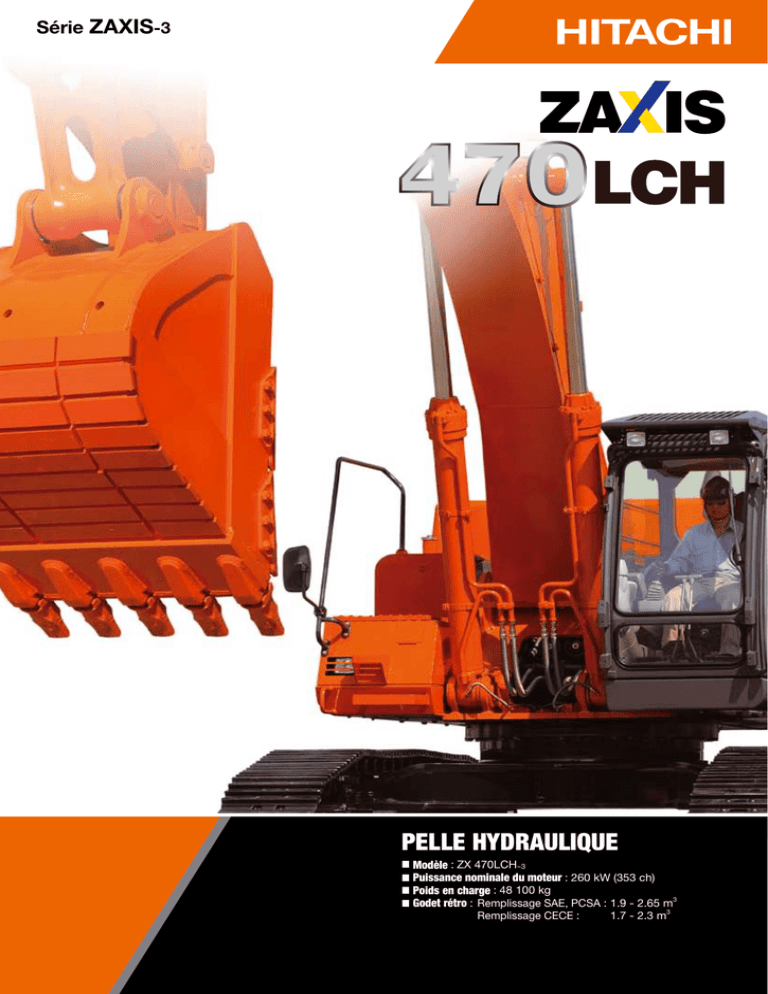 Série ZAXIS-3 PELLE HYDRAULIQUE Modèle : ZX 470LCH-3 Puissance nominale du moteur : 260 kW (353 ch) Poids en charge : 48 100 kg Godet rétro : Remplissage SAE, PCSA :1.9 - 2.65 m3 Remplissage CECE : 1.7 - 2.3 m3 La nouvelle génération de pelles hydrauliques Les pelles hydrauliques de nouvelle génération de la série ZAXIS-3, de HITACHI, débordent d’avancées technologiques – moteur non polluant, technologies hydrauliques avancées de HITACHI, châssis et équipement frontal robustes, plus une parfaite adéquation entre puissance et vitesse. Les pelles de la série ZAXIS-3 font le travail avec une productivité, une durabilité et une fiabilité démontrées, en particulier dans les travaux lourds de fouille et dans les carrières. Machine équipée d’une cabine H/R. Le moteur non polluant est conforme aux réglementations américaine EPA Tier 3 et européenne Phase III A sur les émissions Le bas niveau de bruit satisfait à la réglementation 2000/14/CE, phase II, de l’UE sur le bruit Une productivité de haut niveau Obtenir un haut niveau de productivité tout en maintenant une faible consommation de carburant, tel était l’objectif du développement d’un nouveau moteur et d’un nouveau système hydraulique pour la ZAXIS 470LCH. Production : augmentation d’environ 14% Consommation de carburant : environ 13% de réduction (par rapport aux modèles conventionnels) Machine équipée d’une cabine H/R. Des technologies hydrauliques avancées Force de fouille augmentée Sélecteur du mode flèche Plus 7% de force de fouille du godet et plus 8% de force de fouille du bras*. L’amplitude sur laquelle la structure de l’engin peut être levé ou tiré par l’avant de la machine peut être activée (ON) ou désactivée (OFF). Cette fonction aide à offrir une utilisation plus confortable et contribue à prolonger la durée de service des composants. * Sur le mode augmentation de puissance par rapport aux modèles conventionnels Système de régénération de flèche amélioré Lors du travail combiné d’abaissement de la flèche et du bras, la vitesse du bras peut être augmentée d’environ 15% par rapport aux modèles conventionnels. L’huile pressurisée provenant du bas du vérin de la flèche est transférée au côté tige du vérin de la flèche pour l’abaisser, aidée par son poids. Habituellement, l’huile pressurisée en provenance de la pompe est transférée au côté tige du vérin pour abaisser la flèche. Ce nouveau système permet aussi de réaliser des opérations combinées efficaces de pivotement et d’abaissement de la flèche. ON OFF Mode confort Mode puissance Pivotement Relevage du bras Abaissement de la flèche Déploiement du godet P M Nouveau système de régénération du godet Le diamètre de la tuyauterie du bras a été incrémenté pour réduire les pertes hydrauliques (théoriquement 7%) pour les opérations frontales rapides. Concept de développement du nouveau moteur Puissance élevée mais faible consommation de carburant Système d’injection de carburant de type rampe commune Augmentation de 4% en sortie (par rapport aux modèles conventionnels) • 260 kW (353 ch) / 1 800 min-1 Le système d’injection de carburant de type rampe commune à contrôle électronique régule une pompe à carburant intégrée à une pression ultra-élevée pour distribuer le carburant à chacun des injecteurs des cylindres au moyen d’une rampe commune. Cela permet de générer une forte puissance en CV et de réduire le PM* et la consommation de carburant. Le nouveau moteur non polluant, conforme aux réglementations sur les émissions Tier 3 aux U.S.A. (EPA) et Phase III dans l’UE, peut réduire le coût du carburant grâce au contrôle électronique. Lors d’une opération combinée de pivotement + abaissement de la flèche + déploiement du bras ou de nivellement (abaissement de la flèche + déploiement du bras), la vitesse de déploiement du bras peut être considérablement augmentée. Comment ? Un papillon de régulation installé dans le circuit du bras ajuste le débit, si besoin est, pour réduire la perte hydraulique lors de l’opération combinée avec le déploiement du bras. Il y a peu de traction ou de levée Levée et poussée importantes de sur la structure de l’engin, et donc la structure de l’engin, donc plus moins de vibrations et de chocs. de vibrations et de chocs. Tuyauterie frontale de plus grand diamètre 15% DE PLUS Utilisation combinée de la flèche et du bras Le godet peut agir rapidement lors d’opérations combinées de fouille à travers le nouveau circuit de régénération du godet. Lorsque le godet est peu chargé, l’huile pressurisée provenant du côté tige du vérin du godet est transférée à travers une soupape de régénération au bas du vérin du godet pour un emploi efficace de l’énergie hydraulique. Système EGR** refroidi Les gaz d’échappement sont partiellement mélangés avec l’air d’aspiration pour réduire la température de combustion afin de réduire les émissions de NOx et la consommation de carburant. Qui plus est, le refroidisseur EGR refroidit les gaz d’échappement pour augmenter la concentration d’air permettant une combustion complète en réduisant les PM*. *Matière sous forme de particules **Réinjection des gaz d’échappement Filtre à carburant Capteur de pression de rampe commune Rampe commune Pompe à carburant Réfrigérant Unité de commande Refroidisseur EGR Soupape de commande EGR Admission Culasse Réservoir Unité de carburant de commande Injecteur Échappement Une base solide pour une longue vie utile Train de chenilles renforcé pour une meilleure durabilité même dans les applications lourdes. Train de chenilles renforcé Capacité de chargement améliorée de la couronne d’orientation Le roulement à billes de la couronne d’orientation contient plus de billes, ce qui augmente la capacité de chargement de la couronne d’orientatio