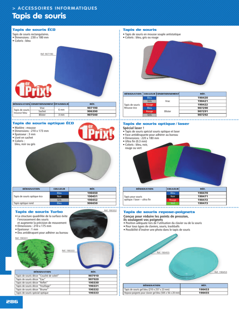 > A C C E S S O I R E S I N F O R M AT I Q U E S Tapis de souris Tapis de souris ÉCO Tapis de souris Tapis de souris rectangulaires. • Dimensions : 230 x 180 mm • Coloris : bleu • Tapis de souris en mousse souple antistatique • Coloris : bleu, gris ou rouge Réf. 907190 er Prix! DÉSIGNATION COULEUR CONDITIONNEMENT DÉSIGNATION CONDITIONNEMENT ÉPAISSEUR Tapis de souris mousse bleu Vrac Sachet Blister 6 mm 3 mm Tapis de souris optique ÉCO • Matière : mousse • Dimensions : 210 x 173 mm • Epaisseur : 3 mm • Livré en sachet • Coloris : bleu, noir ou gris DÉSIGNATION Tapis de souris optique éco Tapis optique rond Tapis de souris Mousse éco RÉF. 907190 906390 907540 Prix! RÉF. Bleu Noir Gris Bleu 190450 190451 190452 906650 Blister Spécial laser ! • Tapis de souris spécial souris optique et laser • Face antidérapante pour adhérer au bureau • Dimensions : 220 x 180 mm • Ultra fin (0.3 mm) • Coloris : bleu, noir, rouge ou vert DÉSIGNATION Tapis pour souris optique / laser – ultra fin Réf. 190332 Tapis de souris Turbo Vrac RÉF. 190420 190421 190422 907290 907291 907292 Tapis de souris optique / laser er COULEUR Bleu Gris Rouge Bleu Rouge Gris COULEUR RÉF. Bleu Noir Rouge Vert 190470 190471 190472 190473 Tapis de souris repose-poignets Conçus pour réduire les points de pression, ils soulagent vos poignets • La structure quadrillée de la surface évite l'encrassement des souris et augmente la précision de mouvement • Dimensions : 210 x 175 mm • Epaisseur : 1 mm • Dos antidérapant pour adhérer au bureau • Position adéquate lors de l’utilisation du clavier ou de la souris • Pour tous types de claviers, souris, trackballs • Possibilité d’insérer une photo dans le tapis de souris Réf. 190331 Réf. 190333 DÉSIGNATION Tapis de souris décor “Couché de soleil” Tapis de souris décor “Eau” Tapis de souris décor “Reflet” Tapis de souris décor “Feuillage” Tapis de souris décor “Brume” Tapis de souris spécial optique 286 56 Réf. 190455 RÉF. 907910 907920 190330 190331 190332 190333 Réf. 190453 DÉSIGNATION RÉF. Tapis de souris gel bleu (210 x 257 x 23 mm) Repose-poignets pour clavier gel bleu (505 x 56 x 20 mm) 190453 190455 A C C E S S O I R E S I N F O R M AT I Q U E S < Tapis de souris Trois modèles disponibles : Tapis de souris recyclée type « glacier », « Amazonie » et « forêt » Le tapis de souris est recyclé.Le conditionnement en carton recyclé permet de le transformer en boîte de rangement. Taille du tapis 240 x 190 x 3mm Réf. 190463 Réf. 190464 Tapis de souris anti-microbes Pour un espace de travail sain ! • Compatible pour les souris optiques et laser • Dimensions : 240 x190 x 0.4mm • Anti-microbes Réf. 190480 • Ultra-fin RÉF. Tapis de souris recyclé type « glacier » Tapis de souris recyclé type « forêt » Tapis de souris recyclé type « Amazonie » Réf. 190481 Réf. 190462 Réf. 190460 DÉSIGNATION ! AU VE ! AU VE Même le conditionnement est recyclable ! U NO U NO Tapis de souris « écologique » 190463 190464 190462 Réf. 190461 DÉSIGNATION COULEUR RÉF. Tapis de souris anti-microbe orange Tapis de souris anti-microbe vert Tapis de souris anti-microbe bleu Tapis de souris anti-microbe orange Vert Bleu Noir 190480 190481 190460 190461 Boîte 24 tapis de souris fantaisie • Boîte présentoir • Avec décors et illustrations • Dimensions : 230 x 180 x 3 mm • Surface PVC DÉSIGNATION RÉF. Boîte de 24 tapis de souris 907440 Tapis de Souris NOVA Une gamme de tapis de souris pour tous vos besoins. • Gamme MicrOPoint : l’entrée de gamme Nova avec fonction autonettoyante (pour souris à boule) et micro-miroirs 2500 dpi • Gammes MicrOExpert & MicroTech : l’idéal pour les souris optiques • Gammes Raider/Winner/Killer : l’idéal pour les besoins haute précision, les usages intenses et gamers ! Réf. 906501 DÉSIGNATION RÉF. GAMME KILLER Tapis de souris nova killer 2 Tapis de souris nova killer 2 Tapis de souris nova killer 2 Blanc Noir Rouge 906632 906634 906633 GAMME MASTER Tapis de souris nova master Tapis de souris nova master Réf. 906611 COULEUR Bleu Noir 906642 906641 GAMME MICROEXPERT Tapis de souris nova micro expert Tapis de souris nova micro expert Argent Noir 906611 906612 GAMME MICROPOINT Tapis de souris nova micropoint Bleu 906501 GAMME MICROTECH Réf. 906660 Tapis de souris nova microtech Tapis de souris nova microtech Tapis de souris nova microtech argent/bleu argent/gris Noir/blanc 906602 906601 906604 GAMME RAIDER Tapis de souris nova raider Gris 906660 GAMME WINNER Tapis de souris nova winner 3 Tapis de souris nova winner 3 Tapis de souris nova winner 3 Réf. 906641 Nouveauté Blanc Noir Rouge 906623 906625 906624 287