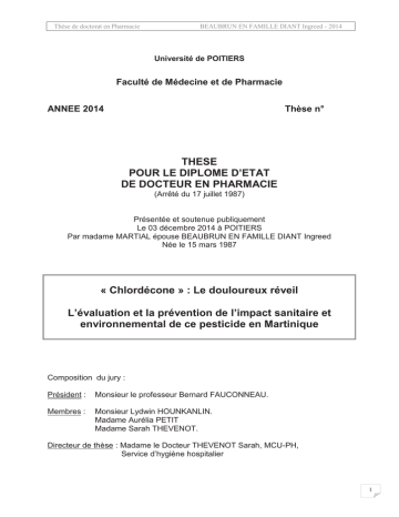 Thèse de doctorat en Pharmacie BEAUBRUN EN FAMILLE DIANT Ingreed - 2014 Université de POITIERS Faculté de Médecine et de Pharmacie ANNEE 2014 Thèse n° THESE POUR LE DIPLOME D’ETAT DE DOCTEUR EN PHARMACIE (Arrêté du 17 juillet 1987) Présentée et soutenue publiquement Le 03 décembre 2014 à POITIERS Par madame MARTIAL épouse BEAUBRUN EN FAMILLE DIANT Ingreed Née le 15 mars 1987 « Chlordécone » : Le douloureux réveil L’évaluation et la prévention de l’impact sanitaire et environnemental de ce pesticide en Martinique Composition du jury : Président : Monsieur le professeur Bernard FAUCONNEAU. Membres : Monsieur Lydwin HOUNKANLIN. Madame Aurélia PETIT Madame Sarah THEVENOT. Directeur de thèse : Madame le Docteur THEVENOT Sarah, MCU-PH, Service d’hygiène hospitalier 1 Thèse de doctorat en Pharmacie FACULTE DE MEDECINE ET DE PHARMACIE BEAUBRUN EN FAMILLE DIANT Ingreed - 2014 UNIVERSITE DE POITIERS LISTE DES ENSEIGNANTS EN PHARMACIE Année universitaire 2013-2014 Professeurs des Universités des disciplines pharmaceutiques : CARATO Pascal, chimie thérapeutique PR (à/c du01/10) COUET William, Pharmacie Clinique FAUCONNEAU Bernard, Toxicologie IMBERT Christine, Parasitologie et mycologie médicale GUILLARD Jérôme, Pharmacochimie LEVESQUE Joël, Pharmacognosie MARCHAND Sandrine, Pharmacocinétique OLIVIER Jean-Christophe, Pharm. galénique et biopharm., pharm.indust. PAGE Guylène, Biologie cellulaire, biothérapeutiques RABOUAN Sylvie, Sciences physico-chimiques, chimie physique et analytique SARROUILHE Denis, Physiologie humaine SEGUIN François, Biophysique et biomathématiques Maîtres de Conférences des Universités des disciplines pharmaceutiques : BARRA Anne, Immunologie-Hématologie BARRIER Laurence, Biochimie générale et clinique BODET Charles, Bactériologie BON Delphine, Biophysique BRILLAULT Julien, Pharmacologie et Biophysique CHARVET Caroline, Physiologie, anatomie humaine DEBORDE-DELAGE Marie, Sciences physico-chimiques DEJEAN Catherine, Pharmacologie générale et clinique DELAGE Jacques, Biomathématiques, biophysique DUPUIS Antoine, Pharmacie clinique FAVOT- LAFORGE Laure, Biologie cellulaire et moléculaire GIRARDOT Marion, Pharmacognosie, botanique et biodiversité végétale GREGOIRE Nicolas, Pharmacologie HUSSAIN Didja, Pharmacie galénique INGRAND sabrina, Toxicologie MARIVINGT-MOUNIR Cécile, Pharmacochimie PAIN Stéphanie, Toxicologie RAGOT Stéphanie, Santé publique RIOUX-BILAN Agnès, Biochimie TEWES Frédéric, Chimie et Pharmacochimie THEVENOT Sarah, Hygiène et Santé publique THOREAU Vincent, Biologie cellulaire WAHL Anne, Chimie analytique 2 Thèse de doctorat en Pharmacie BEAUBRUN EN FAMILLE DIANT Ingreed - 2014 PAST – Maîtres de conférences associé DELOFFRE Clément, Pharmacien HOUNKANLIN Lydwin, Pharmacien Professeur 2ème degré DEBAIL Didier Maître de Langue – Anglais PERKINS Marguerite 6, rue de la milétrie – BP 199 – 86034 Poitiers Cedex courriel : faculte.medecine@univǦpoitiers.fr 3 Thèse de doctorat en Pharmacie BEAUBRUN EN FAMILLE DIANT Ingreed - 2014 REMERCIEMENTS Merci au jury. Je tiens à remercier monsieur le professeur Bernard FAUCONNEAU d’avoir répondu favorablement à ma demande pour la présidence du jury de soutenance de ma thèse. Merci à madame le docteur en pharmacie Aurélia PETIT d’avoir répondu favorablement à ma demande d’être membre du jury. Merci à monsieur le docteur en pharmacie Lydwin HOUNKANLIN d’avoir accepté d’être membre de ce jury. Merci pour votre disponibilité et vos enseignements au cours de mes années d’études. Merci au maître de conférences à la faculté de Poitiers et praticien hospitalier Sarah THEVENOT pour votre aide précieuse tout au long de la rédaction de ma thèse. Vos conseils, vos corrections, votre esprit critique et votre disponibilité ont été pour moi un guide essentiel dans la finalisation de ma thèse ainsi qu’une source de motivation et de persévérance. Merci encore. Merci à ma belle-mère Patricia. Merci pour ton encadrement et ton aide précieuse. Mes mots ne seront pas suffisants pour te dire toute mon affection et ma reconnaissance pour ton soutien moral et ton esprit critique sur cette thèse. Sans toi, elle n’aurait pas eu cette merveilleuse couleur. Même si des fois tu as été épuisée et lassée pour toutes ces relectures, ces changements de plan, etc.., je n’oublierai jamais le temps que tu m’as consacré et l’encadrement que tu as apporté à mon travail avec calme et rigueur. Merci d’avoir su m’écouter, me comprendre et me guider. A maman et à mes grands-parents maternels, qui ont toujours été présents et qui ont cru en moi tout au long de mon parcours universitaire. Vous avez su comprendre mes moments de joie, de crainte ou même de stress et m’encourager. Avec tout votre amour, tendresse et patience, votre confiance en moi a toujours été présente. Je tiens particulièrement à vous remercier papy et mamy pour m’avoir supporté tout au long de mon cursus mais particulièrement pendant mes périodes d’examen où j’étais difficile à vivre et odieuse. Merci pour tous les voyages au départ de la Martinique que vous avez réalisé pour être à mes côtés pour ces périodes et pour vos petits plats délicieux. Un très grand merci pour votre soutien moral et financier. Merci d’avoir toujours respecté et honoré mes choix. Je vous aime énormément. Ce que je suis aujourd’hui c’est en partie grâce à vous. A ma belle-famille, merci pour votre enthousiasme et votre soutien. 4 Thèse de doctorat en Pharmacie BEAUBRUN EN FAMILLE DIANT Ingreed - 2014 On s’est connu au cours de cette période mais tout de suite vous m’avez fait confiance et encouragée. Merci pour l’amour, la chaleur et la gentillesse que vous m’avez donnée et apportée pendant ces moments d’études et surtout pendant la réalisation de la thèse. Vous êtes des personnes adorables et simples. Quel pl