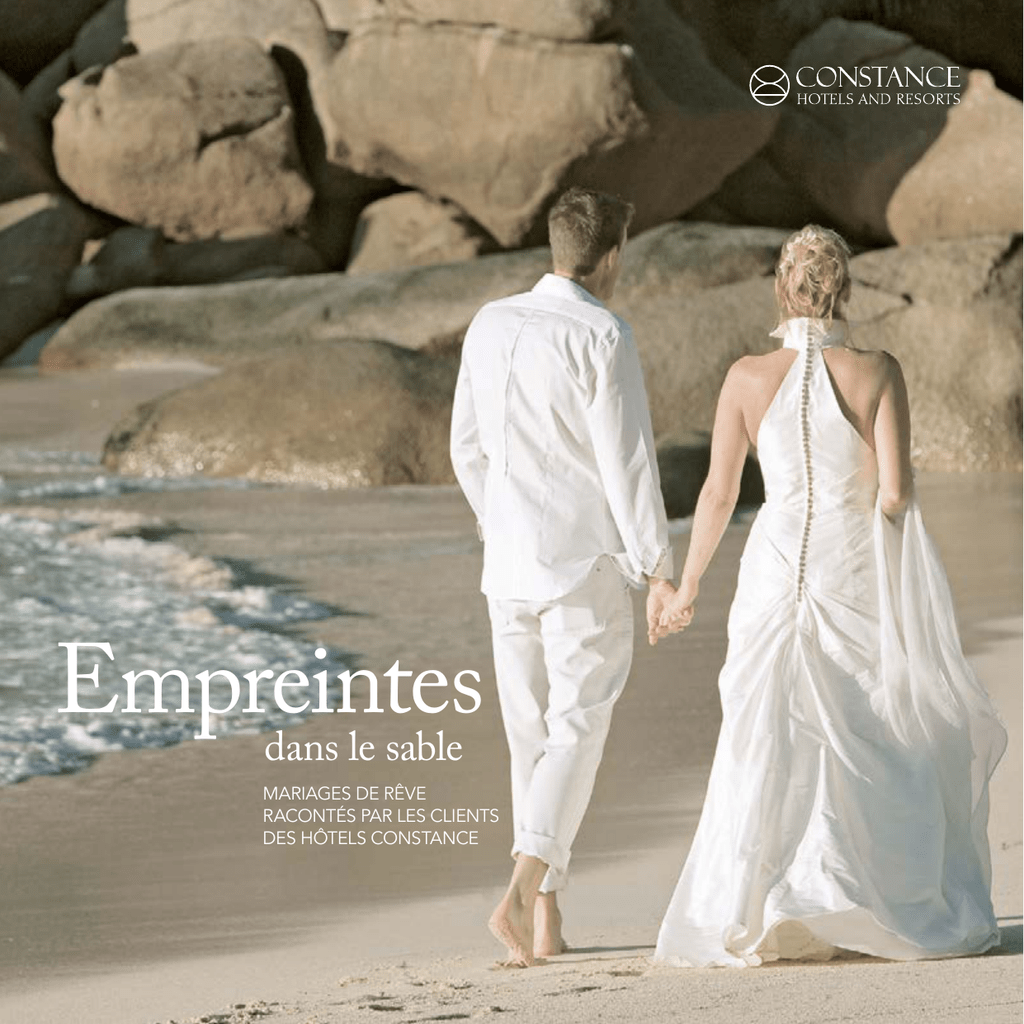 Empreintes dans le sable MARIAGES DE RÊVE RACONTÉS PAR LES CLIENTS DES HÔTELS CONSTANCE Bienvenue… MARIAGES DE RÊVE RACONTÉS PAR LES CLIENTS DES HÔTELS CONSTANCE 8 ÉTAPES POUR ORGANISER UN MARIAGE DANS UNE DESTINATION DE RÊVE Chez Constance Hotels & Resorts, nous proposons uniquement les destinations les plus romantiques au monde pour votre mariage et votre lune de miel. 1 Effervescence 2 Attente 3 Exaltation 4 Introspection 5 Intimité 6 Euphorie 7 Épanouissement 8 Relaxation Grâce aux récits des clients qui se sont mariés chez Constance, nous vous invitons à découvrir 8 étapes clés pour organiser un mariage dans une destination de rêve. De la proposition à la première danse, la grande aventure vers le mariage est parsemée de moments magiques. Dans ce guide, les clients qui ont séjourné dans nos hôtels et nos complexes hôteliers des Maldives, de l’île Maurice, des Seychelles et de Madagascar partagent leurs expériences personnelles, celles de leur mariage et de leur lune de miel chez Constance. Trouver la destination parfaite pour votre mariage Concevoir votre journée dans les moindres détails Arriver à l’hôtel Le matin de votre mariage Votre cérémonie de mariage Place à la fête Le premier jour de votre nouvelle vie Profiter de votre lune de miel de rêve Effervescence Trouver la destination parfaite pour votre mariage « À l’époque de notre mariage, il y a près de 21 ans de cela, le choix était quelque peu limité... Nous avons décidé de choisir un séjour inoubliable, dans un lieu dont nous n’avions pu que rêver, pour nous y marier et commencer notre vie ensemble. » NATALIE ET MARK FINNISS MARIÉS CHEZ CONSTANCE L’ORGANISATION D’UNE JOURNÉE PARFAITE Dès que votre réservation de mariage est confirmée, nous vous contactons par e-mail, par Skype ou par téléphone. Nous disposons d’une vaste gamme d’options différentes pour organiser votre mariage, mais nous prêtons toujours une oreille attentive aux désirs de chacun et nous nous efforçons d’y répondre dans la mesure du possible. Par exemple, si la mariée souhaite un type précis de fleurs, je peux lui indiquer si la saison s’y prêtera... Les fleurs de frangipanier sont les fleurs les plus recherchées, mais les orchidées sont également populaires. Coordinatrice de mariage, Constance Le Prince Maurice « Si nous devions nous marier à l’étranger, il fallait que ce soit luxueux et exotique. “L’océan Indien remplissait tous nos critères. Nous avions envisagé les Caraïbes et le Mexique, mais les plages de l’île Maurice et le style des hôtels nous ont attirés. » REUBEN ET GEMMA FREEMAN MARIÉS CHEZ CONSTANCE Dans le monde entier, il n’y a aucun cœur pour moi sauf le tien. Dans le monde entier, il n’y a pas d’amour pour toi, à part le mien. Maya Angelou Attente Concevoir votre journée dans les moindres détails « Nous nous sommes mariés quelques jours avant de quitter l’île Maurice pour les Seychelles, donc notre calendrier était quelque peu serré. Nous devions nous rendre à Port Louis pour publier nos bans et compléter les documents nécessaires en vue du mariage, et tout ceci a été organisé par l’hôtel. Notre chauffeur était formidable, il ne s’est pas contenté de nous conduire à bon port, mais il nous a aussi fait découvrir quelques zones touristiques de l’île, en partageant ses connaissances locales sur les endroits à visiter. » REUBEN ET GEMMA FREEMAN MARIÉS CHEZ CONSTANCE Joignez vos mains, et avec vos mains vos cœurs... William Shakespeare, Henry VI CHOISIR VOS HABITS DE MARIAGE Pour la mariée, nous recommandons généralement une robe conçue en tissu léger, comme la soie pure et la mousseline. Pour le marié, nous recommandons un costume traditionnel de couleur claire. Nous conseillons également à la mariée de ne pas porter de talons hauts, car le plus souvent le marié et la mariée seront pieds nus. Coordinatrice de mariage, Constance Halaveli « En général, je conseille aux gens de ne s’inquiéter de rien avant d’y aller. J’ai rencontré ma coordinatrice de mariage le jour suivant mon arrivée à l’hôtel et, à partir de là, nous avons pu choisir l’endroit où se tiendrait la cérémonie, les fleurs que je souhaitais, la musique, et le photographe. L’atmosphère était si détendue, même si j’avoue que j’étais un peu stressée. Mais tout était tout simplement parfait. » PAMELA ET EAMON MAGUIRE MARIÉS CHEZ CONSTANCE Exaltation Arriver à l’hôtel « Je me souviens que la voiture s’est arrêtée devant l’hôtel et j’étais tellement ravi lorsque j’ai vu à quel point l’entrée de l’hôtel était splendide. Lorsque nous sommes entrés dans le hall, nous avons marqué une pause pour admirer la vue. Un membre du personnel nous a emmenés, nous et nos amis, à une table située près de la piscine où nous avons pris le petit déjeuner. Après le repas, d’autres membres du personnel sont venus à notre rencontre pour nous accueillir et compléter pour nous les formulaires d’enregistrement. Il n’y a pas eu de file d’attente à la réception et nous n’avons pas perdu de temps. C’était une façon vraiment détendue de commencer nos vacances, nous n’oublierons jamais. Nous avons été traités comme des rois ! » HANNAH ET ANDREW HILL MARIÉS CHEZ CONSTANCE On sait que l’on est amoureux quand on ne peut pas s’endormir parce que la réalité est mieux que les rêves. Dr. Seuss « Une fois arrivés au complexe hôtelier, faites un tour de l’île pour décider du lieu où vous souhaitez organiser votre mariage. Plusieurs possibilités nous ont été offertes : la jetée, le banc de sable, la plage, et nous avons fait notre choix après avoir fait un tour de l’île. Pensez à l’endroit où vous aimeriez prendre vos photos et n’oubliez pas de prendre en compte des petits détails comme l’endroit où le soleil se couche. » HELEN ET JOE MCCAUGHRA