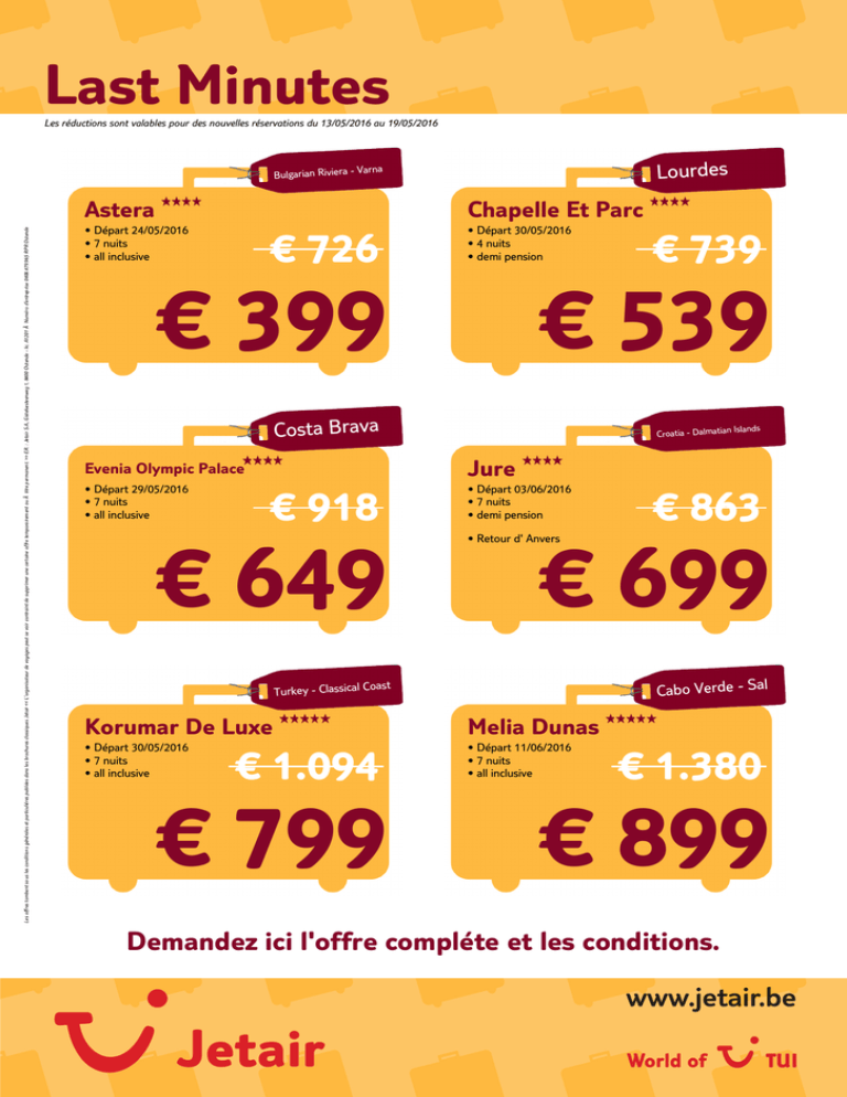 Last Minutes Les réductions sont valables pour des nouvelles réservations du 13/05/2016 au 19/05/2016 Bulgarian Riviera - Astera Les offres tombent sous les conditions générales et particuliéres publiées dans les brochures classiques Jetair << L'organisateur de voyages peut se voir contraint de supprimer une certaine offre temporairement ou à titre permanent. >> E.R. : Jetair S.A., Gistelsesteenweg 1, 8400 Ostende - lic. A1201 à Numéro d'entreprise 0408.479.965 RPR Ostende Lourdes Varna Chapelle Et Parc € 726 • Départ 24/05/2016 • 7 nuits • all inclusive • Départ 30/05/2016 • 4 nuits • demi pension € 399 € 539 Costa Brava Croatia - Dalmatian € 918 € 649 • Départ 03/06/2016 • 7 nuits • demi pension € 699 Cabo Verde - Sal ast Korumar De Luxe € 1.094 € 799 € 863 • Retour d' Anvers Turkey - Classical Co • Départ 30/05/2016 • 7 nuits • all inclusive Islands Jure Evenia Olympic Palace • Départ 29/05/2016 • 7 nuits • all inclusive € 739 Melia Dunas • Départ 11/06/2016 • 7 nuits • all inclusive € 1.380 € 899 Demandez ici l'offre compléte et les conditions. Last Minutes Les réductions sont valables pour des nouvelles réservations du 13/05/2016 au 19/05/2016 Costa Dorada Kaktus Albir Les offres tombent sous les conditions générales et particuliéres publiées dans les brochures classiques Jetair << L'organisateur de voyages peut se voir contraint de supprimer une certaine offre temporairement ou à titre permanent. >> E.R. : Jetair S.A., Gistelsesteenweg 1, 8400 Ostende - lic. A1201 à Numéro d'entreprise 0408.479.965 RPR Ostende H10 Cambrils Playa • Départ 26/05/2016 • 7 nuits • demi pension Costa Blanca € 717 € 419 € 784 • Départ 25/05/2016 • 7 nuits • demi pension € 539 • Retour de Charleroi Costa Almeria Protur Roquetas Hotel & Spa • Départ 21/05/2016 • 7 nuits • all inclusive € 896 € 649 Agadir Sofitel Royal Bay Resort • Départ 10/06/2016 • 7 nuits • petit déjeuner € 1.150 € 699 Santorini Aegean Plaza • Départ 02/06/2016 • 7 nuits • petit déjeuner Corfu Daphnila Bay Thalasso € 1.029 € 799 • Départ 07/06/2016 • 7 nuits • all inclusive € 1.172 € 899 Demandez ici l'offre compléte et les conditions. Last Minutes Les réductions sont valables pour des nouvelles réservations du 13/05/2016 au 19/05/2016 Bulgarian Riviera - Les offres tombent sous les conditions générales et particuliéres publiées dans les brochures classiques Jetair << L'organisateur de voyages peut se voir contraint de supprimer une certaine offre temporairement ou à titre permanent. >> E.R. : Jetair S.A., Gistelsesteenweg 1, 8400 Ostende - lic. A1201 à Numéro d'entreprise 0408.479.965 RPR Ostende Sol Nessebar Bay Blue Bay Platinum € 697 • Départ 23/05/2016 • 7 nuits • all inclusive ast Turkey - Aegean Co Burgas € 419 • Retour d' Ostende € 819 • Départ 26/05/2016 • 7 nuits • all inclusive € 539 Costa del Sol Riu Belplaya Admiral Grand € 980 • Départ 25/05/2016 • 7 nuits • all inclusive Dubrovnic Riviera € 689 • Retour de Charleroi • Départ 28/05/2016 • 7 nuits • demi pension € 739 Gran Canaria Riu Papayas • Départ 22/06/2016 • 7 nuits • all inclusive € 1.081 € 819 € 1.025 Kos Sensimar Palazzo Del Mare • Départ 31/05/2016 • 7 nuits • demi pension € 1.219 € 949 Demandez ici l'offre compléte et les conditions. Last Minutes Les réductions sont valables pour des nouvelles réservations du 13/05/2016 au 19/05/2016 Lanzarote Rhodes Les offres tombent sous les conditions générales et particuliéres publiées dans les brochures classiques Jetair << L'organisateur de voyages peut se voir contraint de supprimer une certaine offre temporairement ou à titre permanent. >> E.R. : Jetair S.A., Gistelsesteenweg 1, 8400 Ostende - lic. A1201 à Numéro d'entreprise 0408.479.965 RPR Ostende Plaza Lanzarote Palm € 762 • Départ 29/05/2016 • 7 nuits • petit déjeuner € 429 • Retour de Charleroi € 800 • Départ 08/06/2016 • 7 nuits • séjour € 569 Madeira Bodrum Sundance Hotel & Suites • Départ 28/05/2016 • 7 nuits • all inclusive Quinta Bela De Sao Tiago € 1.046 € 969 • Départ 20/06/2016 • 7 nuits • petit déjeuner € 689 € 739 Ibiza - Formentera Thailand - Phuket Insotel Club Maryland • Départ 02/06/2016 • 7 nuits • all inclusive € 1.139 € 829 Novotel Phuket Resort • Départ 10/06/2016 • 7 nuits • petit déjeuner € 1.189 € 969 Demandez ici l'offre compléte et les conditions. Last Minutes Les réductions sont valables pour des nouvelles réservations du 13/05/2016 au 19/05/2016 Italy - Puglia Les offres tombent sous les conditions générales et particuliéres publiées dans les brochures classiques Jetair << L'organisateur de voyages peut se voir contraint de supprimer une certaine offre temporairement ou à titre permanent. >> E.R. : Jetair S.A., Gistelsesteenweg 1, 8400 Ostende - lic. A1201 à Numéro d'entreprise 0408.479.965 RPR Ostende Gallipoli Resort • Départ 24/05/2016 • 7 nuits • petit déjeuner Crete - Heraklion Chrissi Amoudia € 727 € 469 € 889 • Départ 29/05/2016 • 7 nuits • all inclusive € 599 • Retour de Charleroi Costa de la Luz Playa De La Luz • Départ 31/05/2016 • 7 nuits • demi pension Turkish Riviera Alva Donna Beach Resort € 899 € 699 • Départ 31/05/2016 • 7 nuits • all inclusive € 1.167 € 749 Mexico Thailand - Bangkok Riu Yucatan Century Park Hotel • Départ 05/06/2016 • 7 nuits • petit déjeuner € 985 € 859 • Départ 31/05/2016 • 7 nuits • all inclusive € 1.788 € 999 Demandez ici l'offre compléte et les conditions. Last Minutes Les réductions sont valables pour des nouvelles réservations du 13/05/2016 au 19/05/2016 Hurghada Athens Riviera Les offres tombent sous les conditions générales et particuliéres publiées dans les brochures classiques Jetair << L'organisat
