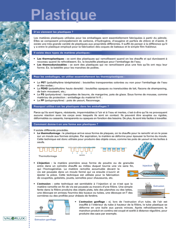 Plastique D’où viennent les plastiques ? Les matières plastiques utilisées pour les emballages sont essentiellement fabriquées à partir du pétrole. Elles se composent principalement de carbone, d'hydrogène, d'oxygène et parfois de chlore et d'azote. Il existe une très grande variété de plastiques aux propriétés différentes. Il suffit de penser à la différence qu’il y a entre le plastique employé pour la fabrication des coques de bateaux et le simple film fraîcheur. Il existe deux types de matières plastiques : • • Les thermoplastiques : ce sont des plastiques qui ramollissent quand on les chauffe et qui durcissent à nouveau quand ils refroidissent. Ex. la bouteille plastique pour l’emballage de l’eau. Les thermodurcissables : ce sont des plastiques qui ne ramollissent plus une fois qu’ils ont reçu leur forme. Ex. la bakélite pour les manches de poêles. Pour les emballages, on utilise essentiellement les thermoplastiques : • • • • Le PET (polyéthylène téréphtalate) : bouteilles transparentes colorées ou non pour l’emballage de l’eau et des sodas ; Le PEHD (polyéthylène haute densité) : bouteilles opaques ou translucides de lait, flacons de shampooing, de bain moussant, etc.; Le PS (polystyrène) : barquettes de beurre, de margarine, pots de glace. Sous forme de mousse, comme matériau de protection : emballage du matériel hi-fi ; Le PP (polypropylène) : pots de yaourt, flaconnage. Pourquoi utilise-t-on les plastiques dans les emballages ? Parce qu’ils sont légers, résistants, imperméables à l’air et à l’eau et inertes, c’est-à-dire qu’ils ne provoquent aucune réaction avec les corps avec lesquels ils sont en contact. Ils peuvent être souples ou rigides, déformables ou cassants, transparents ou opaques en fonction des besoins. De plus, ils sont très faciles à travailler. Comment donne-t-on une forme aux plastiques ? Il existe différents procédés. • Le thermoformage : le plastique arrive sous forme de plaques, on le chauffe pour le ramollir et on le pose sur un moule aux formes simples. Par aspiration, la matière se déforme pour épouser la forme du moule. Cette technique est donc utilisée pour produire des objets creux, comme les pots de yaourt et les boîtes à oeufs. aspiration Thermoformage • L’injection : la matière première sous forme de poudre ou de granulés entre dans un cylindre chauffé au milieu duquel tourne une vis sans fin, qui l'homogénéise. La matière ramollie accumulée devant la vis est poussée dans un moule fermé qui va ensuite s'ouvrir et éjecter la pièce. Cette technique est utilisée pour la fabrication de coupelles, gobelets, jouets, semelles pour chaussures, etc. • L’extrusion : cette technique est semblable à l'injection si ce n'est que la matière ramollie en fin de vis est poussée au travers d'une filière. Une simple fente dans la filière produira des objets plats, tels des planches ou des lattes, une découpe en anneau fournira des tuyaux ou tubes, une découpe en T des cornières ou des profilés pour châssis de fenêtre. • Extrusion gonflage Le recyclage nous concerne tous. Injection Extrusion L’extrusion gonflage : si, lors de l'extrusion d'un tube, de l'air est insufflé à l'intérieur du tube à hauteur de la filière, le tube plastique se déforme en une bulle aux parois minces. Après refroidissement, le manchon produit en continu est coupé et scellé à distance régulière, pour produire des sacs par exemple. Comment fabrique-t-on les bouteilles et flacons en plastique ? • L’extrusion soufflage : cette technique est généralement utilisée pour la production de flacons et bouteilles opaques (bouteille de lait, flacon de détergent). La première étape consiste à extruder un tube de matière chaude au travers d'un moule ouvert. Ensuite, le moule creux se referme sur une section de ce tube et le coupe. De l'air sous pression est alors insufflé dans le tube encore chaud, lui faisant épouser les parois du moule. Après refroidissement, le moule libère le produit fini, un corps creux. Extrusion soufflage • L’injection soufflage avec biorientation : le procédé se déroule en deux étapes. 1. On produit une préforme (petit flacon sous forme de tube) par injection ; 2. La préforme chauffée à environ 110 °C est introduite dans un moule creux dont la cavité correspond à la bouteille finie. La mise en forme de la bouteille s'effectue par une double action simultanée : l'allongement à l'aide d'une canne Injection soufflage introduite par le goulot de la préforme et une déformation radiale (transversale) avec biorientation par l'insufflation d'air comprimé, d'où le nom de biorientation. La bouteille refroidie est éjectée du moule et présente du fait de la biorientation dans un état thermoélastique de la matière des propriétés mécaniques supérieures à la même bouteille produite par extrusion soufflage. Cette technique est donc utilisée pour l'élaboration de bouteilles pour boissons gazeuses, flacons transparents pour détergents. Le réchauffement d'une telle bouteille provoque le retour aux dimensions de la préforme. VALORLUX collecte les bouteilles et les flacons en PET et en mise en balles séparation manuelle PEHD dans les sacs bleus. Ces sacs sont triés au centre de tri collecte pour séparer les différents types de plastiques qui sont envoyés dans des usines de recyclage. Les bouteilles plastiques sont broyage nettoyées et le papier de l’étiquette est éliminé. Les bouteilles Les bouteilles et sont ensuite broyées et transformées en paillettes et en granulés flacons en plastique qui serviront à fabriquer de nouveaux objets, comme s’il s’agissait d’une nouvelle matière première. Chaque tonne de plastique produits finis recyclé permet d’économiser de 700 à 800 kilos de pétrole brut. lavage produits En 2006, VALORLUX a contribué au recyclage de 3 542 tonnes régénération interm