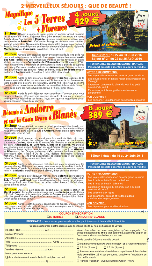 2 MERVEILLEUX SÉJOURS : QUE DE BEAUTÉ ! 4 JOURS Magnifique Les 5 Terres 429 € + Florence 1 Jour Départ le matin de votre région en autocar grand tourisme en direction de l’Italie. Déjeuner libre (non compris) en cours de route. Arrivée dans l’après-midi à Rapallo où nous prendrons le bateau pour nous rendre à Portofino. Cet ancien bourg de pêcheurs vous séduira. Visite et temps libre. Nous reprendrons ensuite notre bateau pour revenir à Rapallo. Nous nous dirigerons en direction de notre hôtel dans la région de Montecatini ou Viareggio. Installation, dîner et nuit. juin août 2016 er Nature et culture 2 Jour Après le petit déjeuner, départ avec notre guide, le long de la rue Séjour n° 1 : du 27 au 30 Juin 2016 panoramique qui amène de la Spezia à Manarola. Nous arriverons sur la côte Séjour n° 2 : du 22 au 25 Août 2016 des Cinq Terres, une côte vertigineuse modelée par les terrasses en pierre sèches, un site classé «Patrimoine de l’Humanité» par l’Unesco en 1997. FORMALITES RESSORTISSANTS FRANCAIS Nous descendrons à Manarola et continuerons la visite à pied de ce superbe Passeport ou carte d’identité en cours de validité petit bourg. Puis nous prendrons le train vers Monterosso. Déjeuner et temps libre pour savourer ces beautés. Retour en bateau jusqu‘à La Spezia avec un bref arrêt à Portovenere. Puis retour à notre hôtel, dîner et nuit. NOTRE PRIX COMPREND : • Les trajets aller et retour en autocar grand tourisme 3e Jour Après le petit déjeuner, départ pour Florence, capitale de la • Les 3 nuits d’hôtel 3* dans la région de Montecatini ou Toscane cette ville d’Art par excellence est le berceau de la Renaissance. Viareggio. Visite guidée puis déjeuner au restaurant. L’après midi libre vous permettra • La pension complète du dîner du jour 1 au petit à votre rythme de continuer la visite de ces merveilleux trésors et de flâner à déjeuner du jour 4 votre guise dans ces ruelles typiques. Retour à l’hôtel, dîner et nuit. • Excursions, entrées et guides mentionnés au 4e Jour Après le petit déjeuner, nous prendrons l’autocar pour nous programme diriger en France. Déjeuner libre en cours de route et c’est en fin d’après- NON COMPRIS : midi que vous rejoindrez vos foyers. Soyez sûrs que ce magnifique circuit • Les boissons • Les dépenses personnelles et autres vous laissera un merveilleux souvenir. e e r r o d n A à te n Déte a à Blanès et sur la Costa Brav 6 JOURS juin 2016 389 € 1er Jour Départ le matin en autocar grand tourisme en direction du sud. Déjeuner libre (non compris) en cours de route. C’est en fin d’après-midi que nous arriverons dans la principauté d’Andorre, Installation à notre hôtel en centre-ville. Dîner et nuit. 2 Jour Petit déjeuner et départ pour le circuit du Valira du Nord permettant de visiter les villages les plus anciens et traditionnels d’Andorre. Ordino, témoin de la culture, de l’histoire et de la politique du pays. Ansalonga, la Cortinata, Llorts et El Serrat. Magnifique vue panoramique depuis la station de ski d’Arcalis. Retour à l’hôtel pour le déjeuner. Nous partirons ensuite pour l’excursion passant par Aixovall et Bixessarri, les Gorges rocheuses d’Os donnent l’unique accès au pittoresque petit village d’Os de Civis, déclaré Patrimoine Artistique National. Visite du site avec dégustations de charcuteries et de liqueurs. Retour à l’hôtel, dîner, soirée animée et nuit. e 3 Jour Après le petit déjeuner, matinée libre pour le shopping et les bonnes affaires. Déjeuner puis vous prendrons la route en direction de la Costa Brava. C’est en fin d’après-midi que nous arriverons à notre superbe hôtel 4* à Blanès. Installation, pot d’accueil, dîner et soirée animée. e r Merveilleux séjou Séjour 1 date : du 19 au 24 Juin 2016 FORMALITES RESSORTISSANTS FRANCAIS Passeport ou carte d’identité en cours de validité NOTRE PRIX COMPREND : Après le petit-déjeuner, matinée libre à Blanès pour découvrir • Les trajets aller et retour en autocar grand tourisme son centre-ville. Déjeuner puis départ pour le superbe village médiéval de Pals. C’est en petit train que vous découvrirez « les circuits des rizières ». • Les 2 nuits en hôtel 3* sup. à Andorre puis temps libre pour flâner dans ces belles ruelles. Retour à l’hôtel, dîner, • Les 3 nuits en hôtel 4* à Blanès soirée animée et nuit. • La pension complète du dîner du jour 1 au petit 5e Jour Après le petit-déjeuner, départ pour la célèbre station de déjeuner du jour 6 Lloret de Mar. Temps libre puis passage dans une bodega locale. Retour • Les boissons aux repas à l’hôtel. Déjeuner puis excursion guidée à Girone pour découvrir cette ville chargée d’histoire. Temps libre et retour en fin d’après-midi à l’hôtel. • Les excursions, entrées et visites guidées mentionnées au programme Dîner, soirée animée et nuit. 4e Jour 6e Jour Après le petit-déjeuner, départ pour la France. Déjeuner libre NON COMPRIS : non compris en cours de route et arrivée dans vos régions en fin d’après- • Les dépenses personnelles et autres midi grâce à nos navettes de dépose. COUPON D’INSCRIPTION ANDORRE+BLANÈS 5 TERRES IMPÉRATIF : Les noms et prénoms de tous les participants sont demandés à l’inscription Coupon à retourner à notre adresse avec le chèque libellé au nom de l’agence de voyage Nom et Prénom : ....................................................................... Adresse : ................................................................................... Ville : .......................................................... Code .................... Téléphone :................................................................................ Veuillez réserver : ........................... places Nous prendrons le car à ...............................................