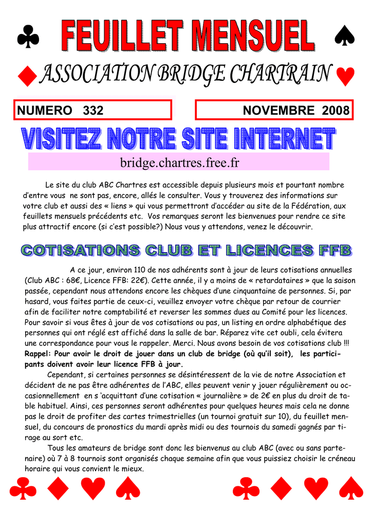NUMERO 332 NOVEMBRE 2008 bridge.chartres.free.fr Le site du club ABC Chartres est accessible depuis plusieurs mois et pourtant nombre d’entre vous ne sont pas, encore, allés le consulter. Vous y trouverez des informations sur votre club et aussi des « liens » qui vous permettront d’accéder au site de la Fédération, aux feuillets mensuels précédents etc. Vos remarques seront les bienvenues pour rendre ce site plus attractif encore (si c’est possible?) Nous vous y attendons, venez le découvrir. A ce jour, environ 110 de nos adhérents sont à jour de leurs cotisations annuelles (Club ABC : 68€, Licence FFB: 22€). Cette année, il y a moins de « retardataires » que la saison passée, cependant nous attendons encore les chèques d’une cinquantaine de personnes. Si, par hasard, vous faites partie de ceux-ci, veuillez envoyer votre chèque par retour de courrier afin de faciliter notre comptabilité et reverser les sommes dues au Comité pour les licences. Pour savoir si vous êtes à jour de vos cotisations ou pas, un listing en ordre alphabétique des personnes qui ont réglé est affiché dans la salle de bar. Réparez vite cet oubli, cela évitera une correspondance pour vous le rappeler. Merci. Nous avons besoin de vos cotisations club !!! Rappel: Pour avoir le droit de jouer dans un club de bridge (où qu’il soit), les participants doivent avoir leur licence FFB à jour. Cependant, si certaines personnes se désintéressent de la vie de notre Association et décident de ne pas être adhérentes de l’ABC, elles peuvent venir y jouer régulièrement ou occasionnellement en s ‘acquittant d’une cotisation « journalière » de 2€ en plus du droit de table habituel. Ainsi, ces personnes seront adhérentes pour quelques heures mais cela ne donne pas le droit de profiter des cartes trimestrielles (un tournoi gratuit sur 10), du feuillet mensuel, du concours de pronostics du mardi après midi ou des tournois du samedi gagnés par tirage au sort etc. Tous les amateurs de bridge sont donc les bienvenus au club ABC (avec ou sans partenaire) où 7 à 8 tournois sont organisés chaque semaine afin que vous puissiez choisir le créneau horaire qui vous convient le mieux. Une partie du Bureau (…) de l’ABC s’est réuni le 11 octobre. Il a été décidé d’avantager, plus encore, les personnes qui jouent plusieurs fois par semaine au club. 1ère décision: Les cartes trimestrielles sont nominatives. Cependant, les ménages qui le souhaitent pourront, dorénavant, acheter une seule carte qui sera valable pour l’un, l’autre ou les deux. 2ème décision: Chaque membre adhérent pourra bénéficier, au cours du trimestre civil, d’une 3ème carte (et suivantes) à 40€ (donc deux tournois offerts) Cette règle s’appliquera, également aux ménages, pour lesquels (en cas d’une carte pour deux) obtiendront ce même avantage à partir de leur 5ème carte. Sympa le Bureau ! Nous espérons que ces nouvelles mesures satisferont nos fidèles adhérents qui jouent plusieurs fois par semaine. Pour l’avoir lu, attentivement, dans le dernier feuillet mensuel, vous n’êtes pas sans ignorer qu’un nouveau tournoi mensuel est organisé le mardi soir. Ce tournoi est ouvert à toutes les personnes qui ne sont ni adhérentes, ni licenciées FFB (au prix habituel de 5€). Si vous connaissez une personne qui aime le bridge et qui est dans ce cas, invitez la à venir participer avec vous. Ce tournoi est également ouvert à tous les joueurs classés en 4ème Série et aux joueurs mieux classés qui joueraient avec un non licencié. Nous joueront une quinzaine de donnes car pour de nombreuses personnes un tournoi de 28 donnes, « c’est trop long ». Prochaine séance : LE MARDI 18 NOVEMBRE à 20h. Attention! Malencontreusement, ce même soir, se déroulera la seconde soirée de l’Open par 4 Promotion. Ce tournoi sera donc limité à 6 tables. Par contre, lors de la prochaine séance, le MARDI 16 DECEMBRE, nous pourrons accueillir 15 ou 16 tables avec tous les joueurs 4ème Série du club! La PREMIERE SEANCE a eu lieu, comme prévu, le mardi soir 14 octobre. Une cinquantaine de circulaires ont été envoyé aux personnes qui ont joué (ou pris des cours) depuis une dizaine d’années. Hélas, de nombreuses lettre m’ont été retournées « n’habite pas à l’adresse…. » Mais quel plaisir, ce soir là, de revoir une dizaine de personnes qui ne viennent plus, habituellement , au club. Soirée d’amitié et de détente que tout le monde a apprécié. L’on a joué une quinzaine de donnes (en 2h45!), mais peu importe car ainsi, les participants ont eu le temps de se rencontrer et de parler ensemble (sans gêner ceux qui jouaient encore, bien évidemment!) Puis, à la demande des participants quelques donnes peuvent être expliquées au tableau. Le résultat? 1ers MM Bertrand BONNAY et Daniel HUCHET, 2ème Mme et M GUILLAIN Et si vous vouliez savoir lesquels de nos « anciens » bridgeurs ont répondu à notre appel, il fallait venir!... Décès de Madeleine TRUBERT qui a joué longtemps au club (souvent avec Éliane BELLENGER) Décès accidentel de notre ami Robert DEJARDIN (92ème année) -en allant jouer au bridge- La journée d’accueil,faisant suite à nos diverses actions de promotion, a eu lieu le samedi 4 octobre. Soixante dix personnes avaient reçu une invitation pour cette journée ( dont 38 visiteurs vus au Forum des Associations) Décevant! Seulement une dizaine de personnes se sont motivées pour venir! Mais, côté positif, ces 10 personnes qui ne connaissaient pas le bridge ont joué tout au long de l’après midi en « mini bridge » ! Puis un pot d’accueil a eu lieu vers 18h. Les cours d’initiation ont commencé quelques jours plus tard (de 20h à 22h). Notre ami, membre du Bureau et moniteur FFB, Thierry SIMEON a accueilli dans son nouveau cours une douzaine de personnes. Un mois à l’essai pour nos « élèves », nous espérons que la 