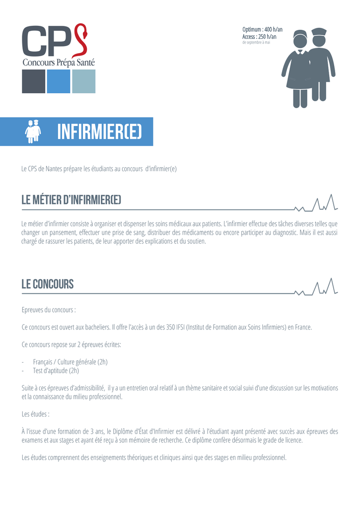 CP Optimum : 400 h/an Access : 250 h/an de septembre à mai Concours Prépa Santé Infirmier(e) Le CPS de Nantes prépare les étudiants au concours d’infirmier(e) Le Métier d’Infirmier(e) Le métier d’infirmier consiste à organiser et dispenser les soins médicaux aux patients. L’infirmier effectue des tâches diverses telles que changer un pansement, effectuer une prise de sang, distribuer des médicaments ou encore participer au diagnostic. Mais il est aussi chargé de rassurer les patients, de leur apporter des explications et du soutien. Le Concours Epreuves du concours : Ce concours est ouvert aux bacheliers. Il offre l’accès à un des 350 IFSI (Institut de Formation aux Soins Infirmiers) en France. Ce concours repose sur 2 épreuves écrites: - Français / Culture générale (2h) Test d’aptitude (2h) Suite à ces épreuves d’admissibilité, il y a un entretien oral relatif à un thème sanitaire et social suivi d’une discussion sur les motivations et la connaissance du milieu professionnel. Les études : À l’issue d’une formation de 3 ans, le Diplôme d’État d’Infirmier est délivré à l’étudiant ayant présenté avec succès aux épreuves des examens et aux stages et ayant été reçu à son mémoire de recherche. Ce diplôme confère désormais le grade de licence. Les études comprennent des enseignements théoriques et cliniques ainsi que des stages en milieu professionnel. Les écoles Ecole Châteaubriant Nantes Rezé Saint Nazaire Lien http://www.ifsi-ifas-chateaubriant.fr/ http://www.chu-nantes.fr/infirmier-preinscriptions-au-concours-d-entree-23637. kjsp http://irfss-pays-de-loire.croix-rouge.fr http://www.hopital-saintnazaire.fr/ emplois-et-formation/formation-ifsi/ presentation.html Nombre de places (2014) 50 210 80 55 REUSSITE AU CONCOURS Près de 70% de réussite aux examens en moyenne, toutes filières confondues dans le réseau national CPES. CPS 91 % Moyenne Nationale (2013) * 12 % * correspond aux résultats obtenus par les candidats ayant ou non suivi une classe préparatoire NB : Les pourcentages indiqués sont représentatifs des résultats de l’ensemble de nos étudiants, et non seulement des classes les meilleures, comme peuvent parfois l’indiquer d’autres écoles. LES ENSEIGNEMENTS AU CPS DE NANTES Des formules correspondant à votre niveau dans toutes les formations : La PREPA Optimum s’adresse à la plupart des étudiants (scientifiques et non scientifiques) et comprend l’horaire hebdomadaire de base, mais aussi des cours renforcés et des cours de soutien conçus pour différents niveaux. La PREPA Access s’adresse aux redoublants ou aux élèves ayant un solide dossier scolaire et de bons résultats au Bac. Votre orientation sur ces formules se fait sur dossier et suite à l’entretien de motivation avec la direction du centre. Programme hebdomadaire (Optimum) Culture générale et préparation à l’oral Tests psychotechniques Expression écrite et tests verbaux Actualité sanitaire et sociale Concours blancs (dont 3 nationaux) Volume hebdomadaire : 16h Volume annuel : 400 h (septembre à mai) 1h30 4h30 4h30 1h30 4h + 6 semaines de stage Programme hebdomadaire (Access) Préparation à l’écrit Tests psychotechniques Préparation à l’oral Concours blancs (dont 3 nationaux) 1h30 3h 1h30 4h Volume hebdomadaire : 10h Volume annuel : 250 h (septembre à mai) UNE PÉDAGOGIE QUI S’ADAPTE À VOTRE NIVEAU Un encadrement performant dans le premier réseau paramédical de France • Le savoir-faire d’une expérience de 30 ans au service des classes préparatoires dans toute la France. • Tous nos enseignants sont des professionnels expérimentés qui possèdent un diplôme niveau I (Doctorat, DESS, DEA, Master II) et une bonne expérience pédagogique. • Nos classes sont à effectifs limités (le taux d’encadrement moyen est d’un professeur pour 10 à 12 élèves) et permettent un accompagnement au plus proche de nos étudiants. • Des interventions régulières de professionnels tout au long de l’année scolaire (orthophonistes, infirmières etc...) permettent d’approfondir la connaissance des métiers : pour plus de renseignements voir les dates du Forum des Métiers pour l’année en cours sur notre site web. • Des travaux de recherche et de développement régulier pour rendre nos enseignements plus performants : travaux collaboratifs, mises en commun des expériences, séminaires pédagogiques de réseau • Production de supports pédagogiques et d’ouvrages de référence Un entraînement intensif et régulier pour garder le rythme « prépa » • Un concours blanc est organisé chaque semaine pour vous préparer à l’examen • 3 classements par an vous sont proposés sur nos 18 établissements. Ils vous permettent de vous positionner par rapport à un panel de candidats dans toute la France. • Des sujets d’annales sont à votre disposition grâce au réseau CPES. • Une période de révision intensive est organisée à partir de mars et jusqu’au dernier concours • Une préparation personnalisée aux oraux peut être mise en place Un suivi régulier de votre évolution et de vos résultats • • • • Un accès internet « Ecole Directe » vous permet de connaître vos notes chaque semaine Des entretiens individuels d’évaluation réguliers sont mis en place avec la direction et les professeurs. Le suivi de votre parcours est assuré jusqu’à la fin des concours. Des conseils réguliers et des outils d’orientation pour mieux vous préparer et renforcer votre confiance en vous. TARIFS Frais de scolarité (CPS Nantes) PREPA Optimum 1 950 euros PREPA Access 1550 euros Votre orientation vers ces formules se fait sur dossier et sur entretien de motivation avec le directeur. Nos formations ne demandent pas l’inscription à l’APB 400 h/an 16h/semaine 250 h/an 10h/semaine FICHE METIER IFSI Nantes Le métier d’infirmier consiste à organiser et dispenser les soins méd