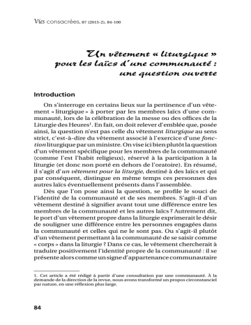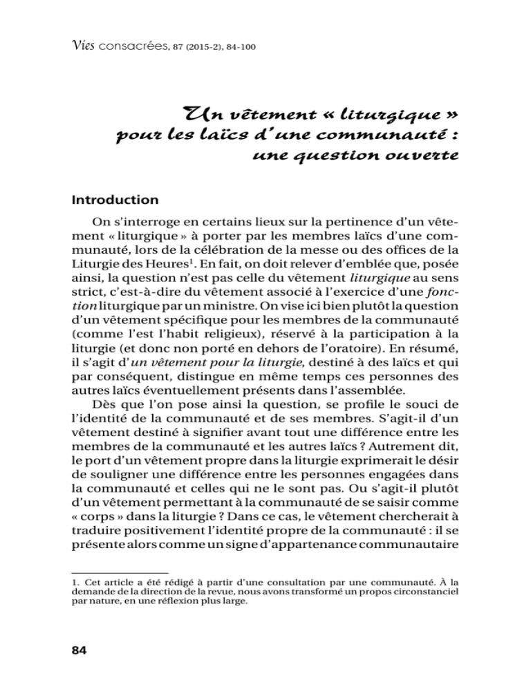 Vies consacrées, 87 (2015-2), 84-100 Un vêtement « liturgique » pour les laïcs d’une communauté : une question ouverte Introduction On s’interroge en certains lieux sur la pertinence d’un vête ment « liturgique » à porter par les membres laïcs d’une com munauté, lors de la célébration de la messe ou des offices de la Liturgie des Heures1. En fait, on doit relever d’emblée que, posée ainsi, la question n’est pas celle du vêtement liturgique au sens strict, c’est-à-dire du vêtement associé à l’exercice d’une fonction liturgique par un ministre. On vise ici bien plutôt la question d’un vêtement spécifique pour les membres de la communauté (comme l’est l’habit religieux), réservé à la participation à la liturgie (et donc non porté en dehors de l’oratoire). En résumé, il s’agit d’un vêtement pour la liturgie, destiné à des laïcs et qui par conséquent, distingue en même temps ces personnes des autres laïcs éventuellement présents dans l’assemblée. Dès que l’on pose ainsi la question, se profile le souci de l’identité de la communauté et de ses membres. S’agit-il d’un vêtement destiné à signifier avant tout une différence entre les membres de la communauté et les autres laïcs ? Autrement dit, le port d’un vêtement propre dans la liturgie exprimerait le désir de souligner une différence entre les personnes engagées dans la communauté et celles qui ne le sont pas. Ou s’agit-il plutôt d’un vêtement permettant à la communauté de se saisir comme « corps » dans la liturgie ? Dans ce cas, le vêtement chercherait à traduire positivement l’identité propre de la communauté : il se présente alors comme un signe d’appartenance communautaire 1. Cet article a été rédigé à partir d’une consultation par une communauté. À la demande de la direction de la revue, nous avons transformé un propos circonstanciel par nature, en une réflexion plus large. 84 | 2014 2016 et d’unité entre ses membres. Ou encore s’agit-il d’un vêtement destiné à soutenir l’identité de chaque personne dans une démarche de consécration (et cela quel que soit le statut cano nique de cette « consécration ») ? Dans ce cas, le vêtement cherche moins à signifier l’appartenance à une communauté qu’une forme de relation particulière à Dieu, comme peut l’être par exemple le port d’une médaille de baptême. On pourrait multiplier les questions de ce genre en vue de mettre en lumière les multiples motifs qui peuvent être invoqués en faveur du port d’un vêtement spécifique dans la liturgie. Les options ont de fortes chances d’être variables selon les individus et les communautés. De plus, il est probable qu’une insistance sur telle ou telle signification n’implique pas forcément le rejet d’autres significations. La symbolique du vêtement est complexe : elle ne peut se résoudre en une sorte de grammaire assignant à chaque option une signification univoque. En ce domaine, comme en beaucoup d’autres, et spécialement dans un temps où les identités sont souvent floues, il convient de prendre en compte le fait que beaucoup s’inscrivent dans des logiques de sensibilité (« cela me plaît ou non ») sans mesurer exactement les enjeux. On ne peut dès lors aller trop vite en oubliant que la question précise — celle d’un habit pour la liturgie (seulement) — ne peut être isolée de la question plus générale du signe du vêtement liturgique, de l’habit religieux ou même de l’habit ecclésiastique, trois éléments qui sont en rapport les uns avec les autres et qu’il convient par conséquent de distinguer pour mieux penser. Dans cet article, nous n’entendons pas bien sûr proposer une réponse toute faite à la question posée initialement : par un travail de mise en perspectives et de prise de distance théolo gique, nous voulons seulement contribuer au discernement que chaque communauté, en fonction de son histoire, de ses équi libres et de ses options, doit opérer à la lumière de l’Esprit saint. A n n é e d e l a V i e C o n s ac r é e Un vêtement « liturgique » pour les laïcs d’une communauté Le vêtement comme désignation des « ministères liturgiques » Pour ce qui concerne les vêtements liturgiques proprement dits, il convient de rappeler que leur usage est réglé par les 85 F. Patrick Prétot, o.s.b. Préliminaires des livres liturgiques2. Sur ce plan, on peut rappe ler deux principes essentiels, qui figurent dans la Présentation générale du Missel romain. Le premier établit le lien entre le vête ment et l’exercice d’une fonction liturgique : Dans l’Église, qui est le Corps du Christ, tous les membres n’exercent pas la même fonction. Cette diversité des ministères dans la célébration de l’Eucharistie se manifeste extérieurement par la diversité des vêtements liturgiques, qui doivent donc être le signe de la fonction propre à chaque ministre. Il faut cependant que ces vêtements contribuent aussi à la beauté de l’action liturgique3. Il y a ici par conséquent un principe de différenciation des fonctions et c’est en son nom par exemple que la chasuble est le vêtement propre du prêtre4, tandis que la dalmatique est celui du diacre5. Mais un autre principe tend au contraire à manifester l’unité des services dans la liturgie : Le vêtement liturgique commun à tous les ministres de quelque degré que ce soit est l’aube6. Sur cette question du vêtement liturgique, il y a donc, dans la pensée de l’Église catholique, une dialectique fondamentale entre unité et diversité, dialectique qui renvoie d’ailleurs à l’enseignement du concile Vatican II sur l’ecclésiologie de la célé bration. D’une part, les célébrations liturgiques sont des actions de l’Église, sacrement de l’unité7 : dès lors ce qui est commun, à 2. Pour la messe, cf. « Présentation générale du Missel romai