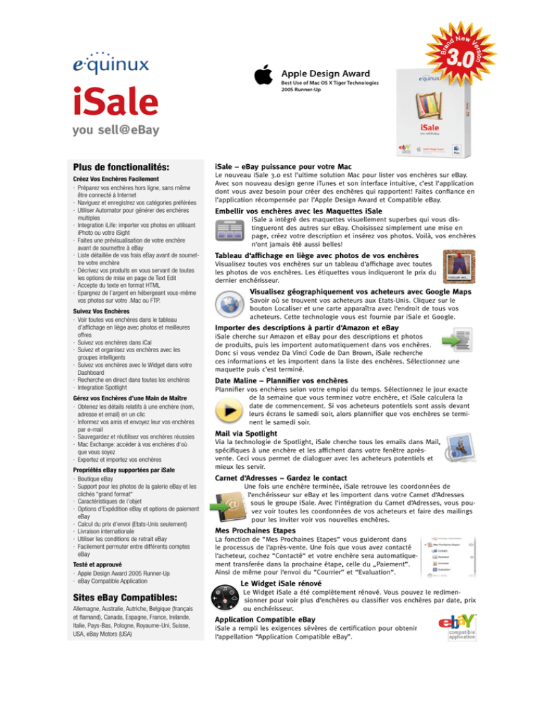 iSale you sell@eBay Plus de fonctionalités: Créez Vos Enchères Facilement · Préparez vos enchères hors ligne, sans même être connecté à Internet · Naviguez et enregistrez vos catégories préférées · Utiliser Automator pour générer des enchères multiples · Integration iLife: importer vos photos en utilisant iPhoto ou votre iSight · Faites une prévisualisation de votre enchère avant de soumettre à eBay · Liste détaillée de vos frais eBay avant de soumettre votre enchère · Décrivez vos produits en vous servant de toutes les options de mise en page de Text Edit · Accepte du texte en format HTML · Epargnez de l’argent en hébergeant vous-même vos photos sur votre .Mac ou FTP. Suivez Vos Enchères · Voir toutes vos enchères dans le tableau d’affichage en liège avec photos et meilleures offres · Suivez vos enchères dans iCal · Suivez et organisez vos enchères avec les groupes intelligents · Suivez vos enchères avec le Widget dans votre Dashboard · Recherche en direct dans toutes les enchères · Integration Spotlight Gérez vos Enchères d’une Main de Maître · Obtenez les détails relatifs à une enchère (nom, adresse et email) en un clic · Informez vos amis et envoyez leur vos enchères par e-mail · Sauvegardez et réutilisez vos enchères réussies · Mac Exchange: accéder à vos enchères d‘où que vous soyez · Exportez et importez vos enchères Propriétés eBay supportées par iSale · Boutique eBay · Support pour les photos de la galerie eBay et les clichés “grand format“ · Caractéristiques de l’objet · Options d’Expédition eBay et options de paiement eBay · Calcul du prix d’envoi (Etats-Unis seulement) · Livraison internationale · Utiliser les conditions de retrait eBay · Facilement permuter entre différents comptes eBay Testé et approuvé · Apple Design Award 2005 Runner-Up · eBay Compatible Application Sites eBay Compatibles: Allemagne, Australie, Autriche, Belgique (français et flamand), Canada, Espagne, France, Irelande, Italie, Pays-Bas, Pologne, Royaume-Uni, Suisse, USA, eBay Motors (USA) iSale – eBay puissance pour votre Mac Le nouveau iSale 3.0 est l’ultime solution Mac pour lister vos enchères sur eBay. Avec son nouveau design genre iTunes et son interface intuitive, c’est l’application dont vous avez besoin pour créer des enchères qui rapportent! Faites confiance en l’application récompensée par l’Apple Design Award et Compatible eBay. Embellir vos enchères avec les Maquettes iSale iSale a intégré des maquettes visuellement superbes qui vous distingueront des autres sur eBay. Choisissez simplement une mise en page, créez votre description et insérez vos photos. Voilà, vos enchères n‘ont jamais été aussi belles! Tableau d‘affichage en liège avec photos de vos enchères Visualisez toutes vos enchères sur un tableau d‘affichage avec toutes les photos de vos enchères. Les étiquettes vous indiqueront le prix du dernier enchérisseur. Visualisez géographiquement vos acheteurs avec Google Maps Savoir où se trouvent vos acheteurs aux Etats-Unis. Cliquez sur le bouton Localiser et une carte apparaîtra avec l‘endroit de tous vos acheteurs. Cette technologie vous est fournie par iSale et Google. Importer des descriptions à partir d‘Amazon et eBay iSale cherche sur Amazon et eBay pour des descriptions et photos de produits, puis les importent automatiquement dans vos enchères. Donc si vous vendez Da Vinci Code de Dan Brown, iSale recherche ces informations et les importent dans la liste des enchères. Sélectionnez une maquette puis c’est terminé. Date Maline – Plannifier vos enchères Plannifier vos enchères selon votre emploi du temps. Sélectionnez le jour exacte de la semaine que vous terminez votre enchère, et iSale calculera la date de commencement. Si vos acheteurs potentiels sont assis devant leurs écrans le samedi soir, alors plannifier que vos enchères se terminent le samedi soir. Mail via Spotlight Via la technologie de Spotlight, iSale cherche tous les emails dans Mail, spécifiques à une enchère et les affichent dans votre fenêtre aprèsvente. Ceci vous permet de dialoguer avec les acheteurs potentiels et mieux les servir. Carnet d‘Adresses – Gardez le contact Une fois une enchère terminée, iSale retrouve les coordonnées de l‘enchérisseur sur eBay et les importent dans votre Carnet d‘Adresses sous le groupe iSale. Avec l‘intégration du Carnet d‘Adresses, vous pouvez voir toutes les coordonnées de vos acheteurs et faire des mailings pour les inviter voir vos nouvelles enchères. Mes Prochaines Etapes La fonction de “Mes Prochaines Etapes“ vous guideront dans le processus de l‘après-vente. Une fois que vous avez contacté l‘acheteur, cochez “Contacté“ et votre enchère sera automatiquement transferée dans la prochaine étape, celle du „Paiement“. Ainsi de même pour l‘envoi du “Courrier” et “Evaluation“. Le Widget iSale rénové Le Widget iSale a été complètement rénové. Vous pouvez le redimensionner pour voir plus d‘enchères ou classifier vos enchères par date, prix ou enchérisseur. Application Compatible eBay iSale a rempli les exigences sévères de certification pour obtenir l‘appellation “Application Compatible eBay”. iSale – Fonctions Spécifiques ❾ ➋ ➏ ➍ ➌ ➎ ➊ ❼ ❽ ➊ Groupes Intelligents Exigences systèmes Mac OS X 10.3.9 au minimum PowerPC ou Intel Mac Une connexion Internet activée Résolution d’écran minimum: 1024 x 768 px Gardez un oeil sur vos enchères eBay. Créez vos propres groupes basés sur les paramètres que vous définissez au préalable – exactement comme dans iTunes. ➋ Maquettes Sélectionnez simplement votre mise en page désirée, écrivez votre description, puis glissez vos photos dans les zones définies. ➌ Characteristiques de l’objet Prix Simplifiez et accélérez la recherche de vos acheteurs potentiels via Characteri