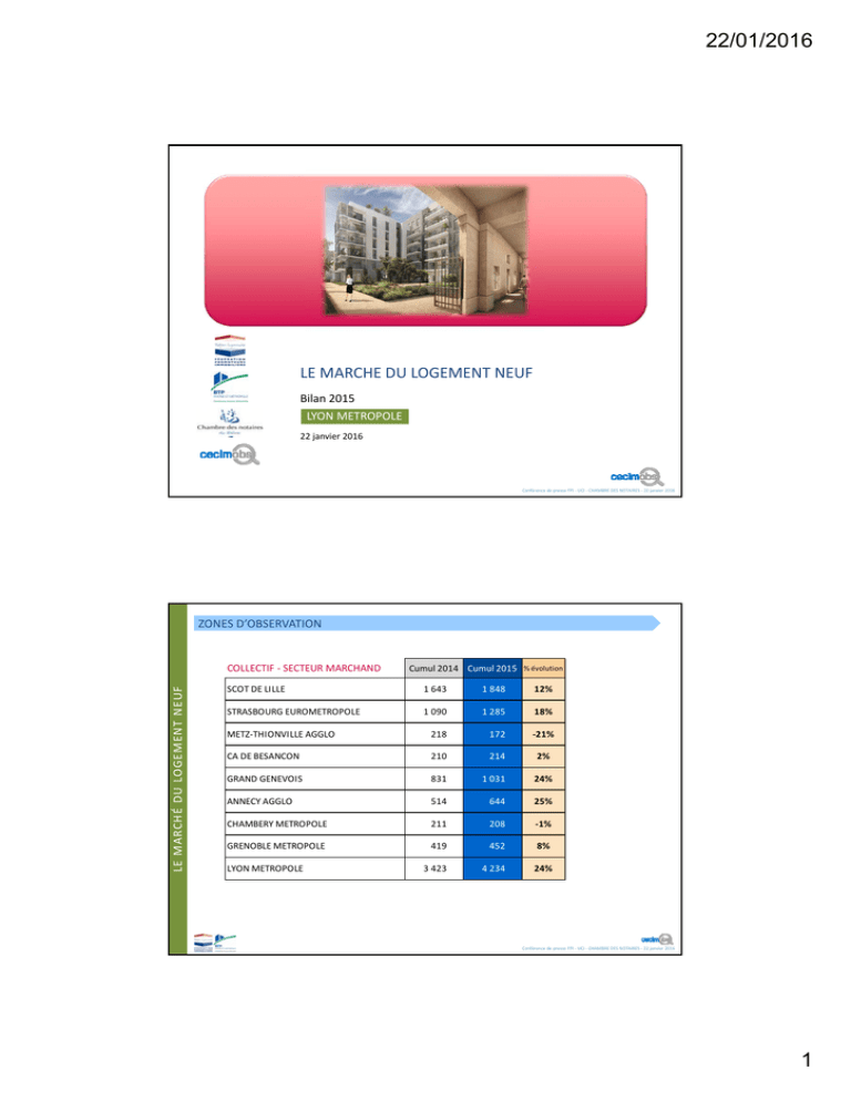 22/01/2016 LE MARCHE DU LOGEMENT NEUF Bilan 2015 LYON METROPOLE 22 janvier 2016 Conférence de presse FPI ‐ UCI ‐ CHAMBRE DES NOTAIRES ‐ 22 janvier 2016 ZONES D’OBSERVATION LE MARCHÉ DU LOGEMENT NEUF COLLECTIF ‐ SECTEUR MARCHAND Cumul 2014 Cumul 2015 % évolution SCOT DE LILLE 1 643 1 848 12% STRASBOURG EUROMETROPOLE 1 090 1 285 18% METZ‐THIONVILLE AGGLO 218 172 ‐21% CA DE BESANCON 210 214 2% GRAND GENEVOIS 831 1 031 24% ANNECY AGGLO 514 644 25% CHAMBERY METROPOLE 211 208 ‐1% GRENOBLE METROPOLE 419 452 8% 3 423 4 234 24% LYON METROPOLE Conférence de presse FPI ‐ UCI ‐ CHAMBRE DES NOTAIRES ‐ 22 janvier 2016 1 22/01/2016 LYON METROPOLE LE MARCHÉ DU LOGEMENT NEUF LYON METROPOLE ‐ GLOBAL ‐ CUMUL Cumul 2014 Cumul 2015 Réservations TOTALES % Collectif % évolution 5 199 92% 5 584 96% 4 780 1 749 1 674 1 357 5 375 1 880 2 354 1 141 12% 7% 41% ‐16% ° % IP / secteur marchand 49% 56% 14% ° Mises en vente 5 581 4 545 ‐19% 4 784 2 783 1 636 365 3 962 1 778 1 921 263 ‐17% ‐36% 17% ‐28% 12,8 12,0 10,7 8,8 ‐16% ‐27% 3 810 € 3 869 € 3 807 € 4 040 € 0% 4% ° Réservations COLLECTIF Utilisateurs Investisseurs privés Ventes en bloc ° Offre disponible Sur plan En cours Livrée ° Durée d'écoulement (en mois) constatée prospective ° Prix moyen / m² * Utilisateurs Investisseurs privés 7% * (Hors stationnement / tva normale) Conférence de presse FPI ‐ UCI ‐ CHAMBRE DES NOTAIRES ‐ 22 janvier 2016 LYON METROPOLE EVOLUTION DES RESERVATIONS SUR 11 ANS LE MARCHÉ DU LOGEMENT NEUF 6 000 COLLECTIF MAISONS INDIVIDUELLES GROUPEES RESIDENCES 5 584 5 375 5 000 4 000 3 000 3 171 2 773 2 000 1 000 0 255 143 2005 147 62 2006 2007 2008 2009 2010 2011 2012 2013 2014 2015 Conférence de presse FPI ‐ UCI ‐ CHAMBRE DES NOTAIRES ‐ 22 janvier 2016 2 22/01/2016 LYON METROPOLE COLLECTIF LE MARCHÉ DU LOGEMENT NEUF ANALYSE DU COLLECTIF 2015 (96% DU MARCHE) Conférence de presse FPI ‐ UCI ‐ CHAMBRE DES NOTAIRES ‐ 22 janvier 2016 LYON METROPOLE COLLECTIF LE MARCHÉ DU LOGEMENT NEUF ANALYSE DU MARCHE SUR 11 ANS RESERVATIONS MISES EN VENTE OFFRE DISPONIBLE 6 000 5 375 5 000 4 000 4 545 3 671 3 000 2 773 2 000 2 417 3 962 1 000 0 2005 2006 2007 2008 2009 2010 2011 2012 2013 2013 2014 2015 Conférence de presse FPI ‐ UCI ‐ CHAMBRE DES NOTAIRES ‐ 22 janvier 2016 3 22/01/2016 LYON METROPOLE COLLECTIF LE MARCHÉ DU LOGEMENT NEUF EVOLUTION MENSUELLE COMPAREE DES RESERVATIONS NETTES SECTEUR MARCHAND 700 600 500 400 300 200 100 0 janv févr. mars avr. mai juin juil. 2014 août sept. oct. nov. déc. 2015 Conférence de presse FPI ‐ UCI ‐ CHAMBRE DES NOTAIRES ‐ 22 janvier 2016 LYON METROPOLE COLLECTIF LE MARCHÉ DU LOGEMENT NEUF REPARTITION GEOGRAPHIQUE DU MARCHE 2015 RESERVATIONS NETTES Cumul 2014 Cumul 2015 LYON VILLEURBANNE 50% 2 409 54% 2 893 20% METRO LYON (hors Lyon‐Villeurbanne) 50% 2 371 46% 2 482 5% 100% 4 780 100% 5 375 12% % évolution LOGEMENTS MIS EN VENTES Cumul 2014 Cumul 2015 LYON VILLEURBANNE 53% 2 962 64% 2 924 ‐1% METRO LYON (hors Lyon‐Villeurbanne) 47% 2 619 36% 1 621 ‐38% 100% 5 581 100% 4 545 ‐19% % évolution LOGEMENTS DISPONIBLES FIN PERIODE Cumul 2014 Cumul 2015 LYON VILLEURBANNE 43% 2 051 53% 2 084 2% 57% 2 733 47% 1 878 ‐31% 100% 4 784 100% 3 962 ‐17% METRO LYON (hors Lyon‐Villeurbanne) % évolution Conférence de presse FPI ‐ UCI ‐ CHAMBRE DES NOTAIRES ‐ 22 janvier 2016 4 22/01/2016 LYON METROPOLE COLLECTIF TOP TEN DES COMMUNES ACTIVES EN 2015 LE MARCHÉ DU LOGEMENT NEUF Communes Réservations % VILLEURBANNE 627 35% LYON 8 478 22% LYON 7 416 107% LYON 9 270 53% LYON 2 249 X 3 VENISSIEUX 248 ‐6% ST PRIEST 240 28% VAULX EN VELIN 219 3% MEYZIEU 167 39% BRON 163 ‐9% * (Hors ventes bloc) Conférence de presse FPI ‐ UCI ‐ CHAMBRE DES NOTAIRES ‐ 22 janvier 2016 LYON METROPOLE COLLECTIF EVOLUTION DES RESERVATIONS PAR NATURE D’ACQUEREUR SUR 11 ANS LE MARCHÉ DU LOGEMENT NEUF UTILISATEURS INVESTISSEURS PRIVES VENTES EN BLOC 6 000 5 375 5 213 5 000 417 945 1 141 821 1 357 4 000 989 621 3 000 2 773 606 1 225 1 287 2 354 2 576 2 853 127 2 000 974 3 253 2 807 1 674 617 1 303 1 518 1 236 840 1 000 1 421 1 536 2005 2006 1 415 1 516 1 577 1 601 1 635 1 749 1 880 1 350 2008 2009 2010 2011 2012 2013 2014 2015 1 862 0 2007 Conférence de presse FPI ‐ UCI ‐ CHAMBRE DES NOTAIRES ‐ 22 janvier 2016 5 22/01/2016 G R A N D E S V I L L E S AIRE URBAINE DE LYON COLLECTIF PRIX MOYEN M² 2015 (hors stationnement / hors ventes bloc / TVA normale) LE MARCHÉ DU LOGEMENT NEUF PRIX MOYEN / M² 25,0% Données FPI du 3ème trimestre 2015 * Données CECIM année 2015 6 000 € EVOLUTION PERIODE 5 308 € 4 868 € 5 000 € 4 276 € 3 939 € 15,0% 3 824 € 3 735 € 4 000 € 3 570 € 3 502 € 3 462 € 3 369 € 3 351 € 3 224 € 3 000 € 5,0% 2 000 € 0,0 % ‐ ‐5,0% 1 000 € ‐15,0% 0 € Conférence de presse FPI ‐ UCI ‐ CHAMBRE DES NOTAIRES ‐ 22 janvier 2016 LYON METROPOLE COLLECTIF PRIX MOYEN M² PAR SECTEUR GEOGRAPHIQUE (hors stationnement / hors ventes bloc / TVA normale) LE MARCHÉ DU LOGEMENT NEUF 2014 7 000 € 2015 6 605 6 000 € 5 044 5 000 € 4 883 5 117 4 945 5 231 4 417 4 000 4 000 € 4 441 4 265 4 417 3 954 3 905 3 645 3 080 3 000 € 3 939 3 439 3 190 2 534 2 000 € 1 000 € 0 € Conférence de presse FPI ‐ UCI ‐ CHAMBRE DES NOTAIRES ‐ 22 janvier 2016 6 22/01/2016 LYON METROPOLE COLLECTIF EVOLUTION DES ENVELOPPE PRIX MOYEN ET PANIER SUR 11 ANS LE MARCHÉ DU LOGEMENT NEUF ENVELOPPE MOYENNE (€) PRIX MOYEN (€) + 16% 260 000 250 000 240 000 230 000 220 000 210 000 218 333 200 000 190 000 195 915 180 000 170 000 169 935 160 000 253 378 + 14% 223 914 206 506 + 22% + 38% 4 040 4 200 3 939 4 000 + 39% 3 800 3 807 3 600 + 37% 3 400 3 200 2 927 3 000 2 840 2 800 2 600 2005 2006 2007 2008 2009 2010 2011 2012 2013 2014 2015 SECTEUR MARCHAND UTILISATEURS 2 785 2005 2006 2007 2008 2009 2010 2011 2012 2013 2014 2015 INVEST.PRIVES SECTEUR MARCHAND UTILISATEURS INVEST.PRIVES PANIER MOYEN (M
