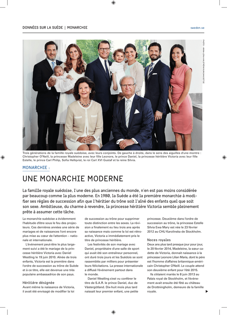 DONNÉES SUR LA SUÈDE | MONARCHIE sweden.se PHOTO : ANNA-LENA AHLSTRÖM/KUNGAHUSET.SE Trois générations de la famille royale suédoise, avec leurs conjoints. De gauche à droite, dans le sens des aiguilles d'une montre : Christopher O’Neill, la princesse Madeleine avec leur fille Leonore, le prince Daniel, la princesse héritière Victoria avec leur fille Estelle, le prince Carl Philip, Sofia Hellqvist, le roi Carl XVI Gustaf et la reine Silvia. MONARCHIE : UNE MONARCHIE MODERNE La famille royale suédoise, l'une des plus anciennes du monde, n'en est pas moins considérée par beaucoup comme la plus moderne. En 1980, la Suède a été la première monarchie à modifier ses règles de succession afin que l’héritier du trône soit l’aîné des enfants quel que soit son sexe. Ambitieuse, du charme à revendre, la princesse héritière Victoria semble pleinement prête à assumer cette tâche. La monarchie suédoise a évidemment l'habitude d'être sous le feu des projecteurs. Ces dernières années une série de mariages et de naissances l'ont encore plus mise au cœur de l'attention – nationale et internationale. L'événement peut-être le plus largement suivi a été le mariage de la princesse héritière Victoria avec Daniel Westling le 19 juin 2010. Aînée de trois enfants, Victoria est la première dans l'ordre de succession au trône de Suède et à ce titre, elle est devenue une très populaire ambassadrice de son pays. Héritière désignée Avant même la naissance de Victoria, il avait été envisagé de modifier la loi de succession au trône pour supprimer toute distinction entre les sexes. La révision a finalement eu lieu trois ans après sa naissance mais comme la loi est rétro active, Victoria a immédiatement pris le titre de princesse héritière. Les festivités de son mariage avec Daniel, propriétaire d'une salle de sport qui avait été son entraîneur personnel, ont duré trois jours et les Suédois se sont rassemblés par milliers pour présenter leurs félicitations. La presse internationale a diffusé l'événement partout dans le monde. Daniel Westling s'est vu conférer le titre de S.A.R. le prince Daniel, duc de Västergötland. Dix-huit mois plus tard naissait leur premier enfant, une petite princesse. Deuxième dans l'ordre de succession au trône, la princesse Estelle Silvia Ewa Mary est née le 23 février 2012 au CHU Karolinska de Stockholm. Noces royales Deux ans plus tard presque jour pour jour, le 20 février 2014, Madeleine, la sœur cadette de Victoria, donnait naissance à la princesse Leonore Lilian Maria, dont le père est l'homme d'affaires britannique-américain Christopher O'Neill. Le couple attend son deuxième enfant pour l'été 2015. Ils s'étaient mariés le 8 juin 2013 au Palais royal de Stockholm, et l'événement avait ensuite été fêté au château de Drottningholm, demeure de la famille royale. DONNÉES SUR LA SUÈDE | MONARCHIE LE PATRIMOINE ROYAL DES ORIGINES FRANÇAISES Porteuse d’une tradition millénaire, la monarchie suédoise compte des souverains issus de onze dynasties. L’actuelle, la maison Bernadotte, est celle qui a régné le plus longtemps. Jean-Baptiste Bernadotte a été le premier Bernadotte sur le trône de Suède. Né en France en 1763, il a été proclamé héritier de la couronne de Suède en 1810. À son accession au trône, il prit le nom de Charles XIV Jean. La famille royale de Suède est apparentée à toutes les maisons régnantes d’Europe. PHOTO : THURE WIKBERG/TT Pour conserver son titre d'altesse royale, la princesse Madeleine n'a pas pris le nom d'O’Neill. Contrairement au prince Daniel, Christopher O’Neill n'a pas ajouté Bernadotte à son nom, préférant garder sa double nationalité britannique et américaine. Il n'a donc pas de titre royal et n'est pas membre officiel de la famille royale suédoise. Le prince Carl Philip, deuxième des trois enfants royaux, est troisième dans l'ordre de succession après la princesse héritière Victoria et sa fille la princesse Estelle. En juin 2014, la Cour royale de Suède a annoncé ses fiançailles avec Sofia Hellqvist. Le mariage aura lieu le 13 juin 2015 à Stockholm. Ancien mannequin, Sofia Hellqvist a également pris part à des émissions de téléréalité. Ils vivent ensemble depuis 2011. Carl XVI Gustaf Le château de Drottningholm, résidence du roi et de la reine depuis 1981. LE CHÂTEAU DE DROTTNINGHOLM Résidence de la famille royale, le château de Drottningholm est inscrit sur la liste du patrimoine mondial de l’UNESCO. L’édifice, construit au XVIIe siècle par l’architecte Nicodemus Tessin l’Ancien, est très représentatif de l’architecture royale européenne de ce temps. Le château et le parc sont en grande partie ouverts au public. PHOTO : JOCKE BERGLUND/TT Solliden, résidence d'été de la famille royale. LE CHÂTEAU DE SOLLIDEN Solliden est la résidence d'été de la famille royale sur l'île d'Öland, une grande île au large de la côte sud-est de la Suède. Conçu par l'architecte Torben Grut en concertation avec la reine Victoria de Suède, épouse du roi Gustave V, le château de Solliden a été construit de 1903 à 1906. Pendant les mois d’été, c'est là que la famille royale retrouve l’intimité de la vie privée. 2| Le choix du 19 juin pour le mariage de Victoria et Daniel ne doit rien au hasard. C'est le même jour, en 1976, que l'actuel roi de Suède Carl XVI Gustaf a épousé Silvia. Carl XVI Gustaf est le septième monarque de la dynastie Bernadotte. Né le 30 avril 1946, il était le cinquième enfant et seul fils du prince héritier Gustaf Adolf et de la princesse Sibylla. Le prince héritier Gustaf Adolf périt l'année suivante dans un accident d'avion au Danemark. En 1950, Carl Gustaf devint prince héritier à la mort de son arrière-grand-père Gustave V, auquel succédait le grand-père du prince héritier, Gustave VI Adolphe, alors âgé de 68 ans. Après vingt-trois ans de 