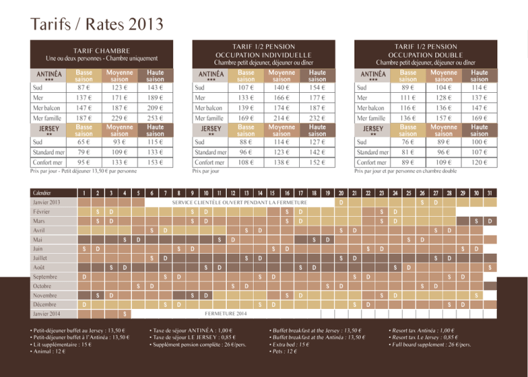 Tarifs / Rates 2013 tarif 1/2 pension occupation individuelle Chambre petit dejeuner, déjeuner ou dîner Basse Moyenne Haute Antinéa saison saison saison Sud 107 € 140 € 154 € Mer 133 € 166 € 177 € Mer balcon 139 € 174 € 187 € Mer famille 169 € 214 € 232 € Basse Moyenne Haute jersey saison saison saison Sud 88 € 114 € 127 € Standard mer 96 € 123 € 142 € Confort mer 108 € 138 € 152 € tarif chambre Une ou deux personnes - Chambre uniquement Antinéa Sud Mer Mer balcon Mer famille jersey Sud Standard mer Confort mer Basse saison 87 € 137 € 147 € 187 € Basse saison 65 € 79 € 95 € Moyenne saison 123 € 171 € 187 € 229 € Moyenne saison 93 € 109 € 133 € Haute saison 143 € 189 € 209 € 253 € Haute saison 115 € 133 € 153 € Prix par jour - Petit déjeuner 13,50 € par personne Calendrier Janvier 2013 Février Mars Avril Mai Juin Juillet Août Septembre Octobre Novembre Décembre Janvier 2014 1 2 3 4 tarif 1/2 pension occupation double Chambre petit dejeuner, déjeuner ou dîner Basse Moyenne Haute Antinéa saison saison saison Sud 89 € 104 € 114 € Mer 111 € 128 € 137 € Mer balcon 116 € 136 € 147 € Mer famille 136 € 157 € 169 € Basse Moyenne Haute jersey saison saison saison Sud 76 € 89 € 100 € Standard mer 81 € 96 € 107 € Confort mer 89 € 109 € 120 € Prix par jour 5 6 7 8 9 10 11 Prix par jour et par personne en chambre double 12 13 14 15 16 17 18 19 SERVICE CLIENTÈLE OUVERT PENDANT LA FERMETURE S S D D S S S S S S D S S S D S S S S • Petit-déjeuner buffet au Jersey : 13,50 € • Petit-déjeuner buffet à l’Antinéa : 13,50 € • Lit supplémentaire : 15 € • Animal : 12 € S D S D 26 S 28 S D S D S D D • Buffet breakfast at the Jersey : 13,50 € • Buffet breakfast at the Antinéa : 13,50 € • Extra bed : 15 € • Pets : 12 € 31 S D D S S D S D D D S FERMETURE 2014 • Taxe de séjour ANTINÉA : 1,00 € • Taxe de séjour LE JERSEY : 0,85 € • Supplément pension complète : 26 €/pers. 30 D S S 29 D D D S 27 D D S S S D D 25 D S D S S D D D 24 S S S 23 D D S 22 D D D D D D S S S S D D S S S 21 D D D D D D S S S D D S D D 20 D • Resort tax Antinéa : 1,00 € • Resort tax Le Jersey : 0,85 € • Full board supplement : 26 €/pers.